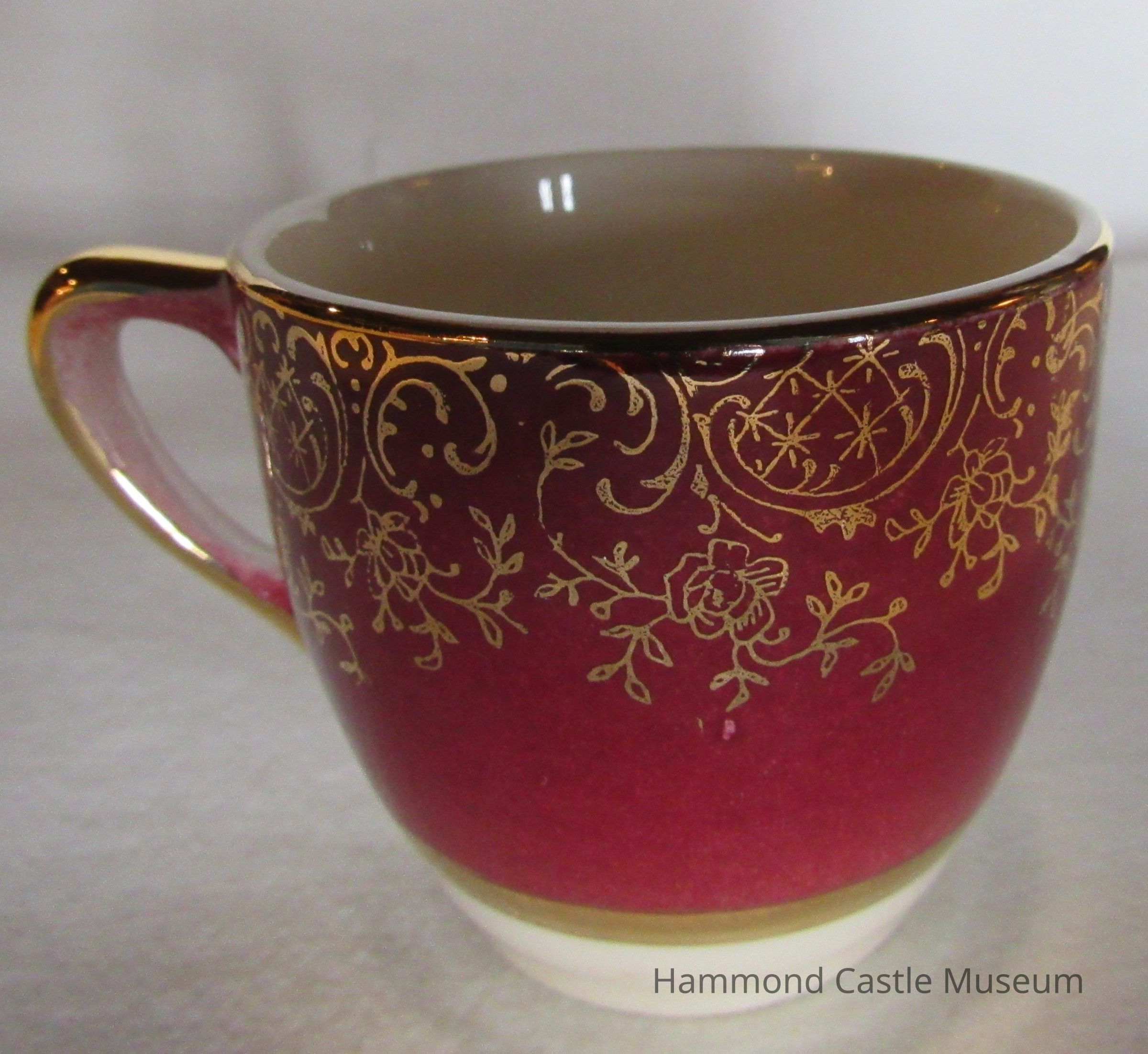 Set of 16 Demi-tasse cups (a) & saucers (b). 23 karat gold trim and design on cream and plum. Stamped: ARISTOCRAT by SALEM CHINA 10