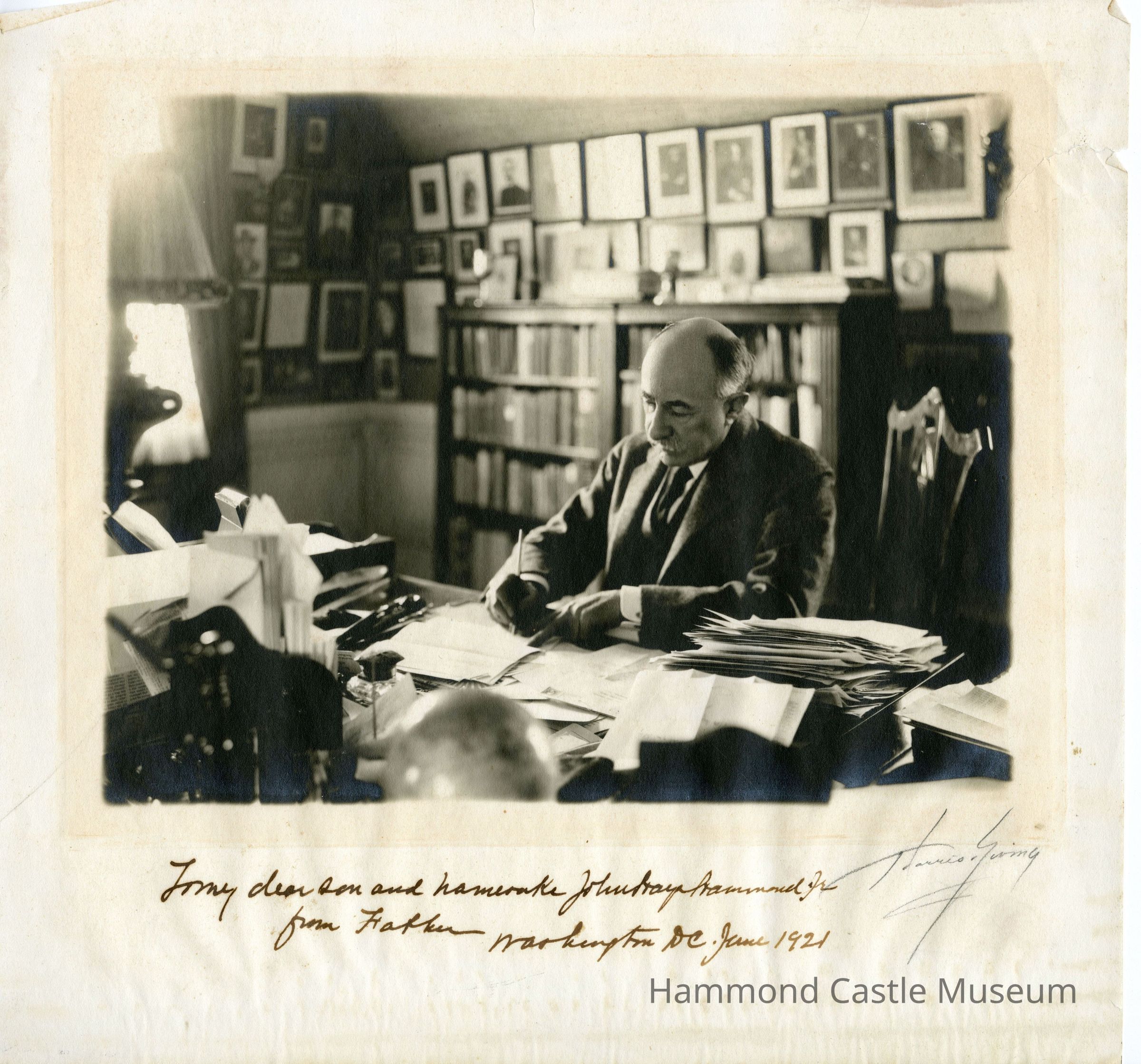 JHHSr at desk writing w inscription, 1921 Harris Giving (sp?) image "To my dear son and namesake John Hays Hammond Jr. From father. Washington DC, June 1921"