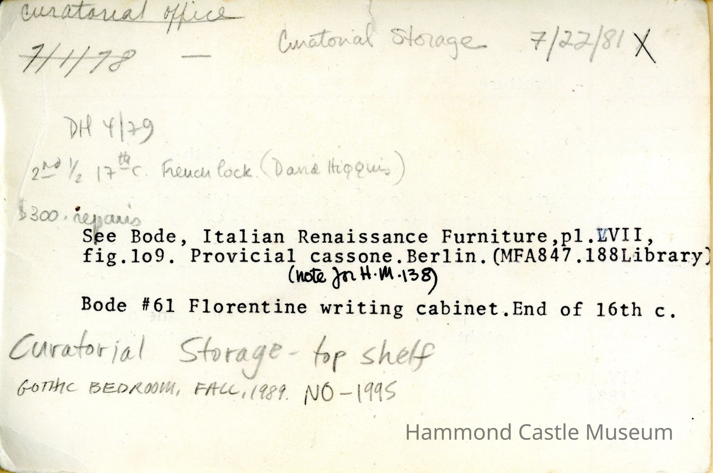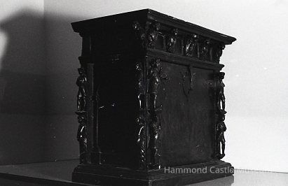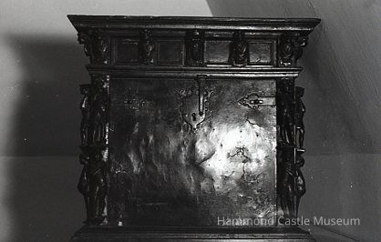 Portable writing desk. Front and sides decorated with the carved figures and faces of gentlemen, the most noticeable holds a scroll. Fleur-de-lis pattern lock, opens to expose drawers.