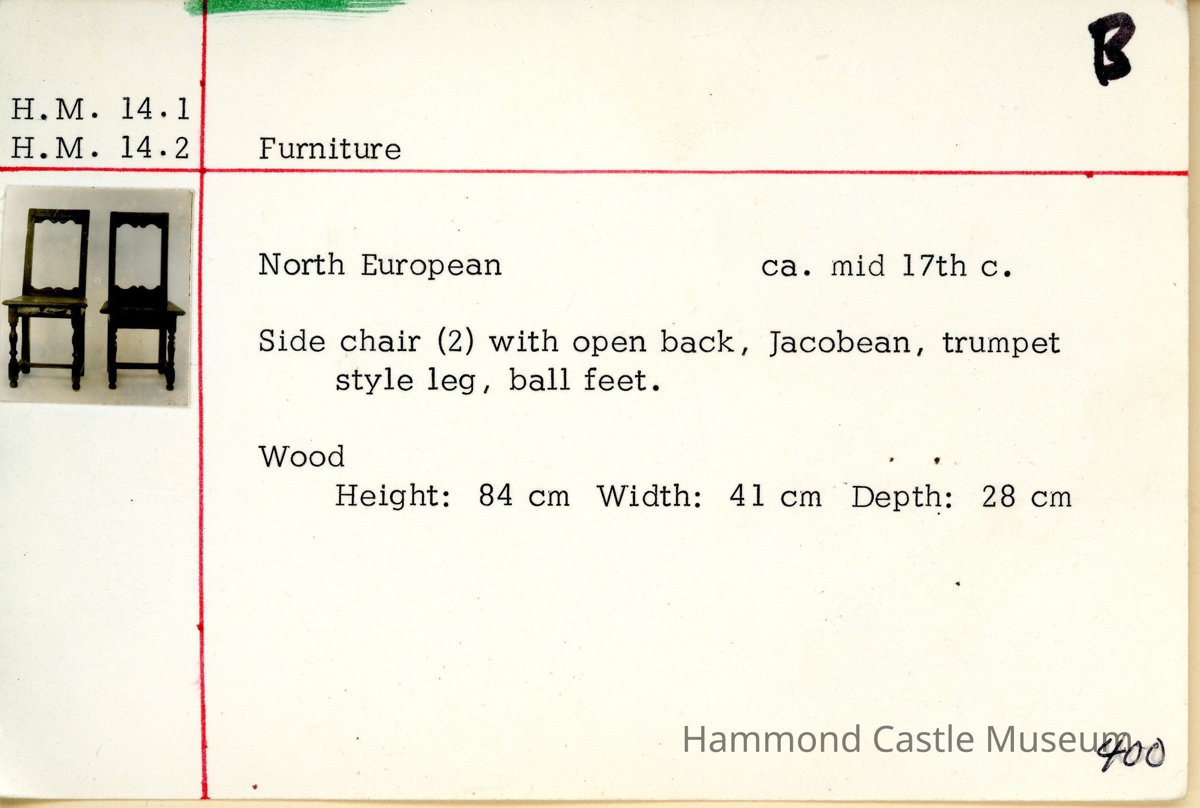 Pair of side chairs with open back, Jacobean, trumpet style leg, ball feet.