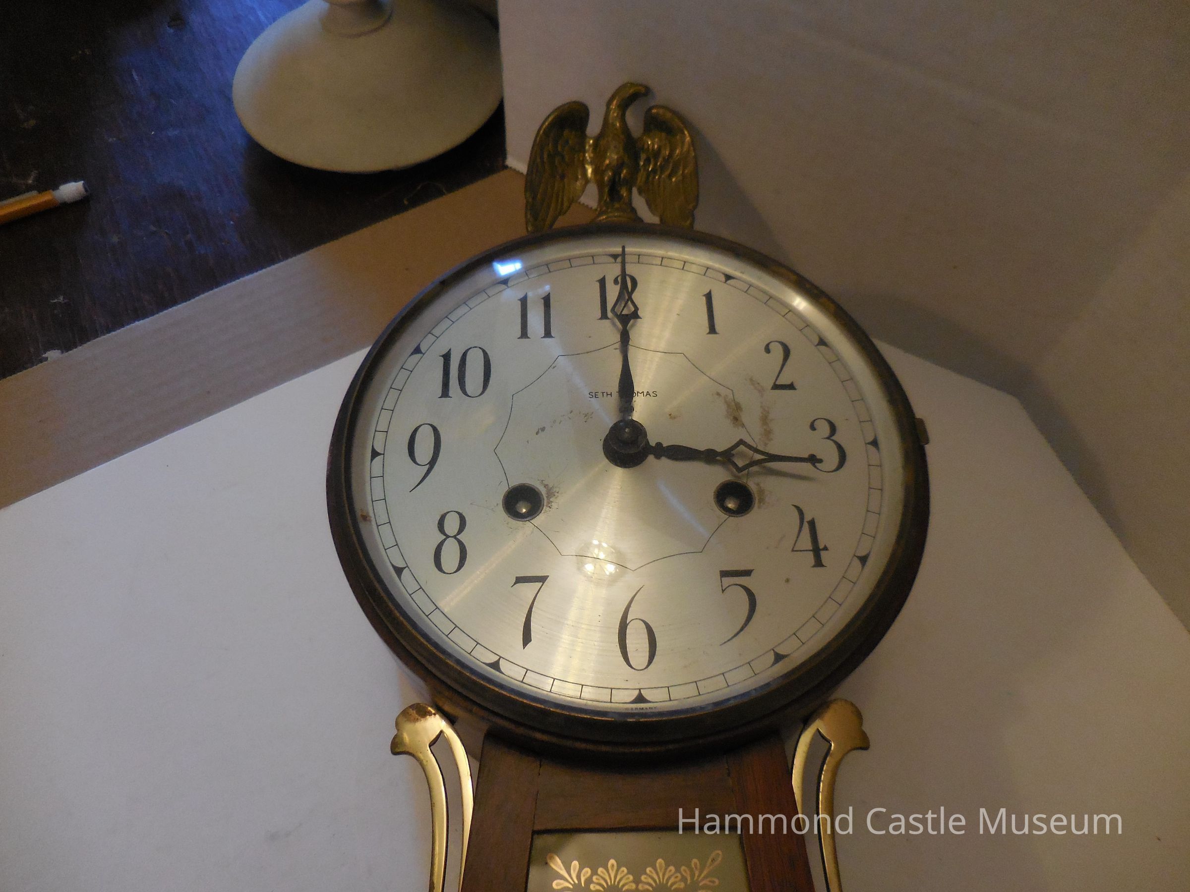Seth Thomas wall-mounted banjo clock. Thought to be from the 1940s. Brookfield 6W E530 series. Mahogany case, eagle ornament, side trim.