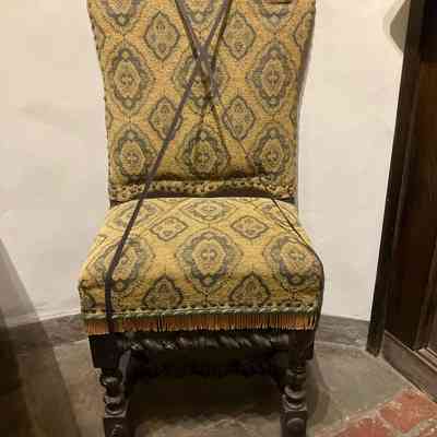 Plank seat with webbing, sugar twist stretcher, gold velvet w greenish medallions upholstery