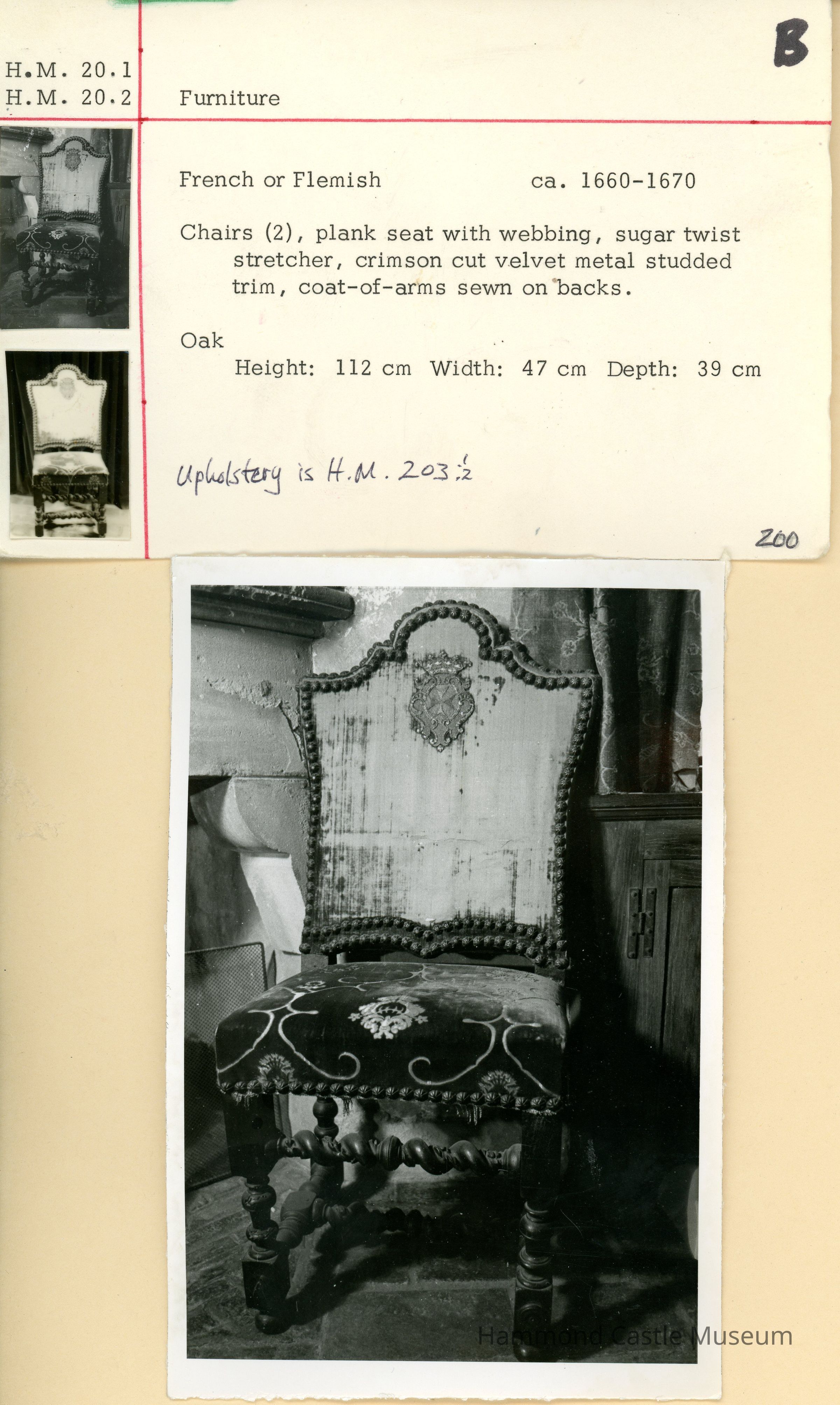 Reupholstered with gold material post Hammond at unknown date. Originally crimson velvet upholstery w metal studded trim, coat-of-arms sewn on back. Original Upholstery is H.M.203.1-.2.Collection