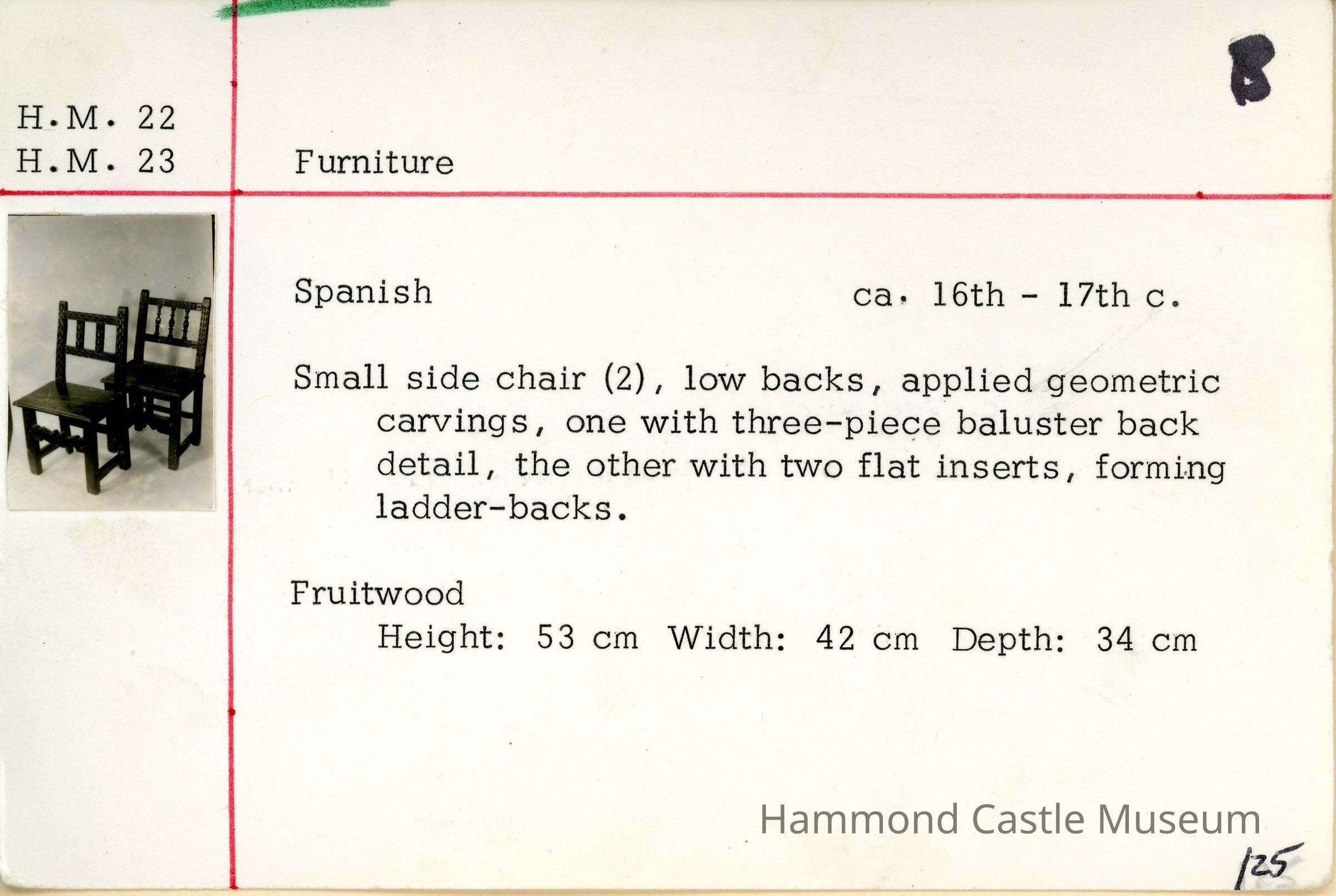 Small side chair, low back, applied geometric carvings, with two flat inserts, forming ladder-back. 14-17c Spanish Belongs in set with H.M.22.