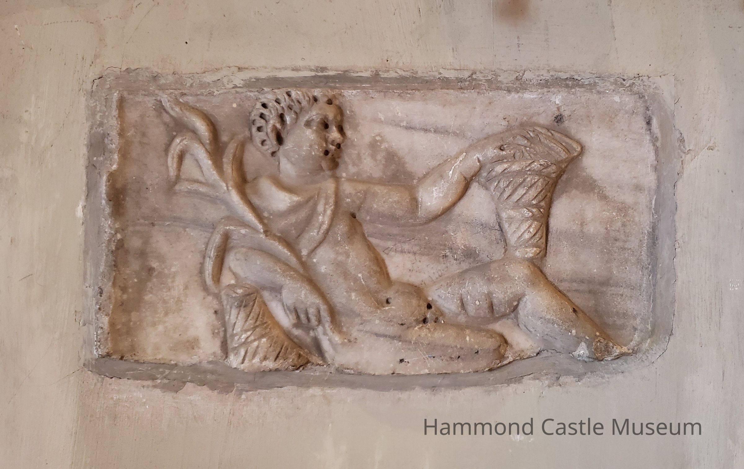 The fragment probably comes from the lid’s front left side. The raised vertical element behind the figure suggests the lid’s outer edge, and Winter sometimes begins the sequence of Seasons. Probably Spring reclined opposite him and to our right Summer opposite Fall; a tabula naming the deceased held the center.