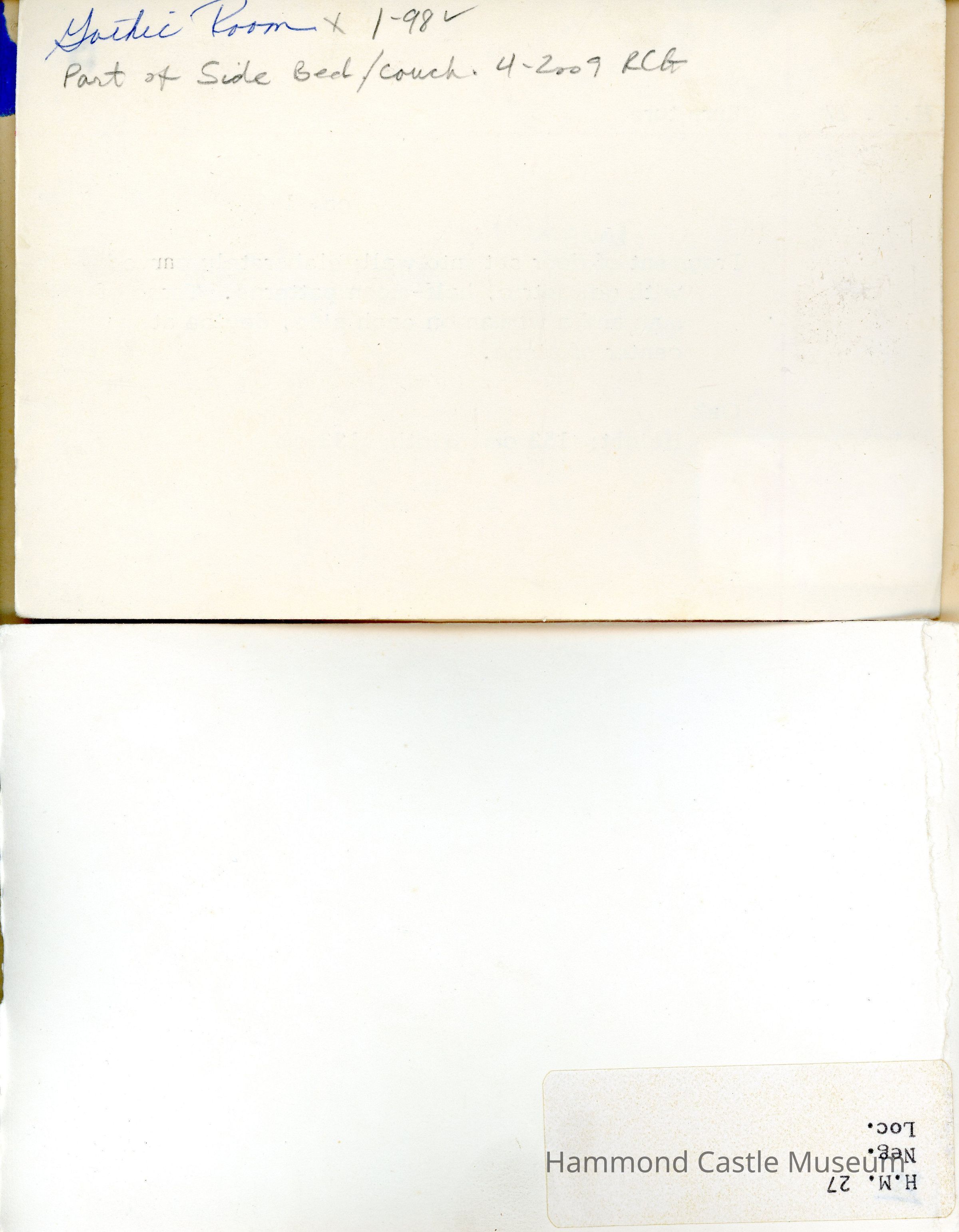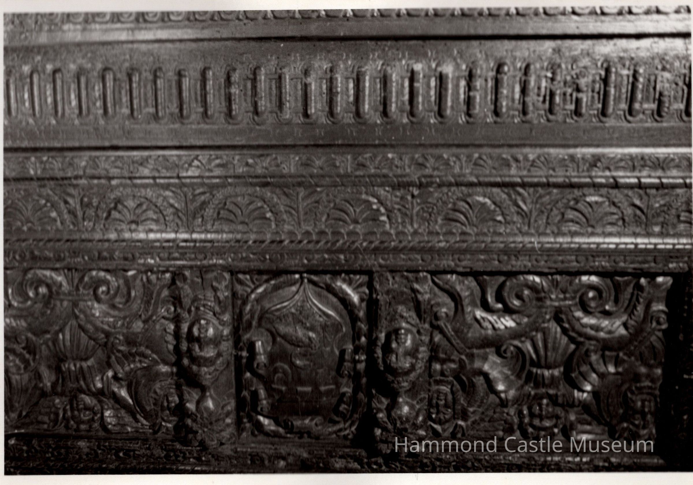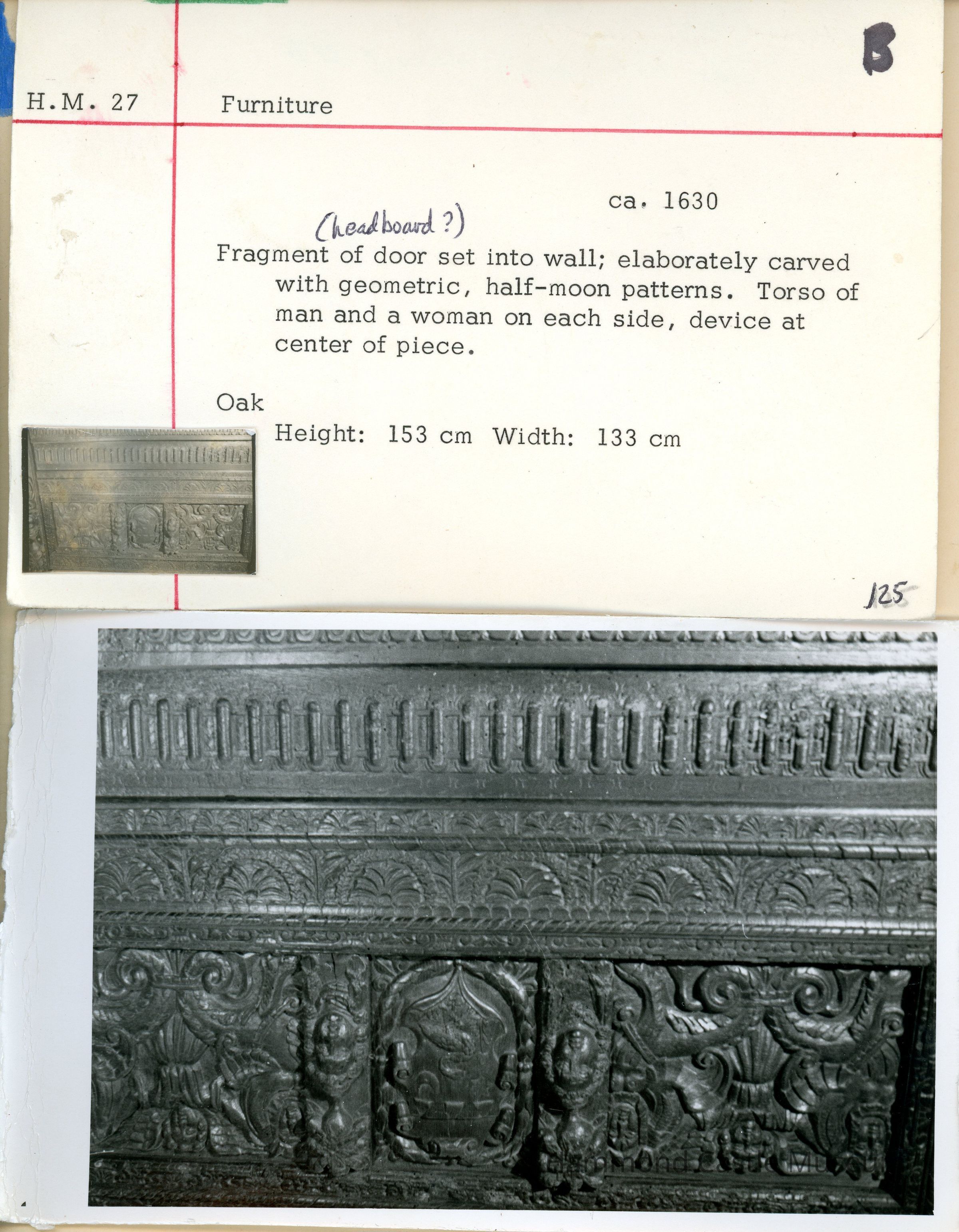 Fragment of door set into wall; elaborately carved with geometric, half-moon patterns. Torso of a man and a woman on each side, device at center of piece. Serves as backing of daybed of Gothic Guestroom corner bed-desk cabinet