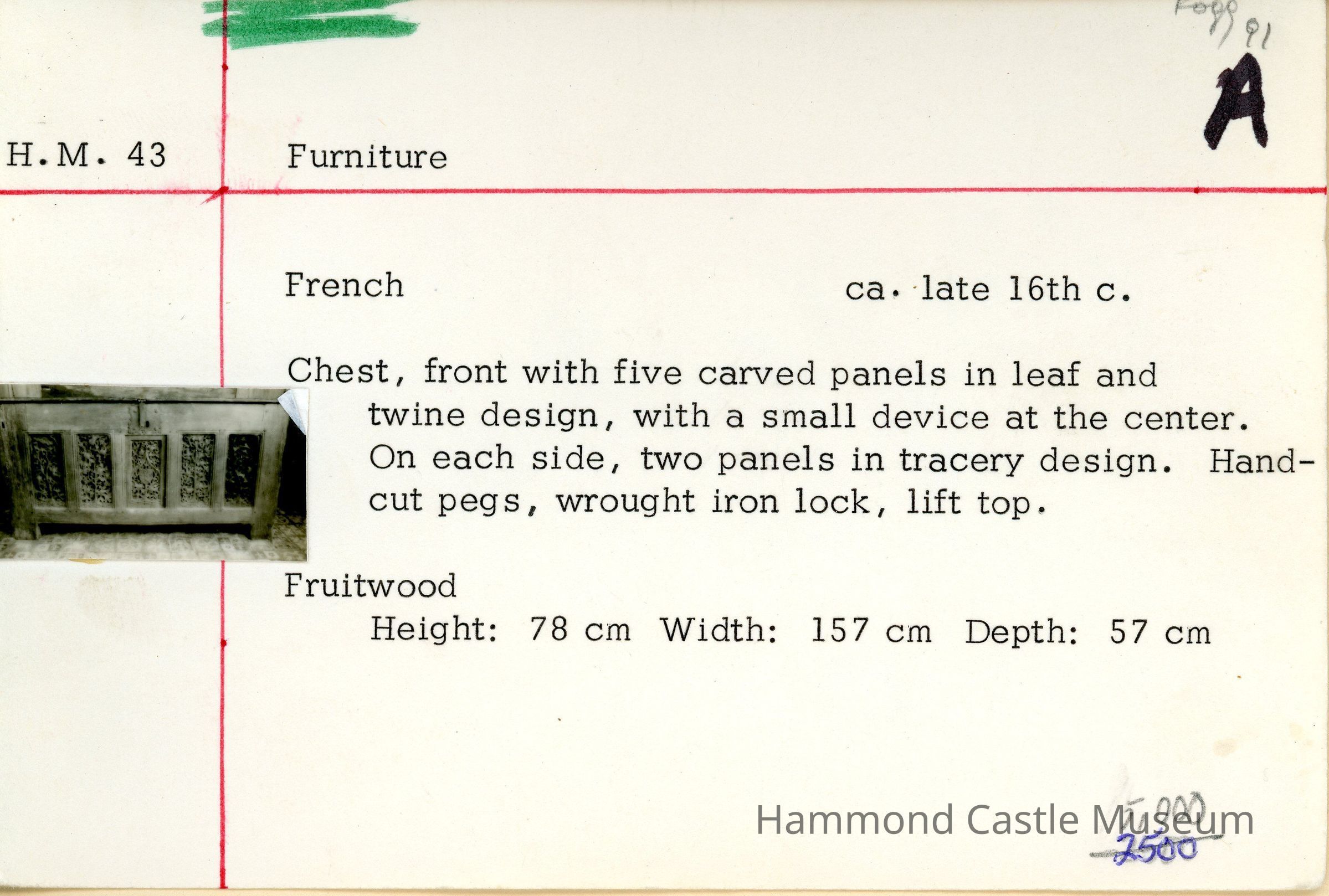 Front with five carved panels in leaf and twine design, with a small device at the center. On each side, two panels in tracery design. Hand-cut pegs, wrought iron lock, lift top.