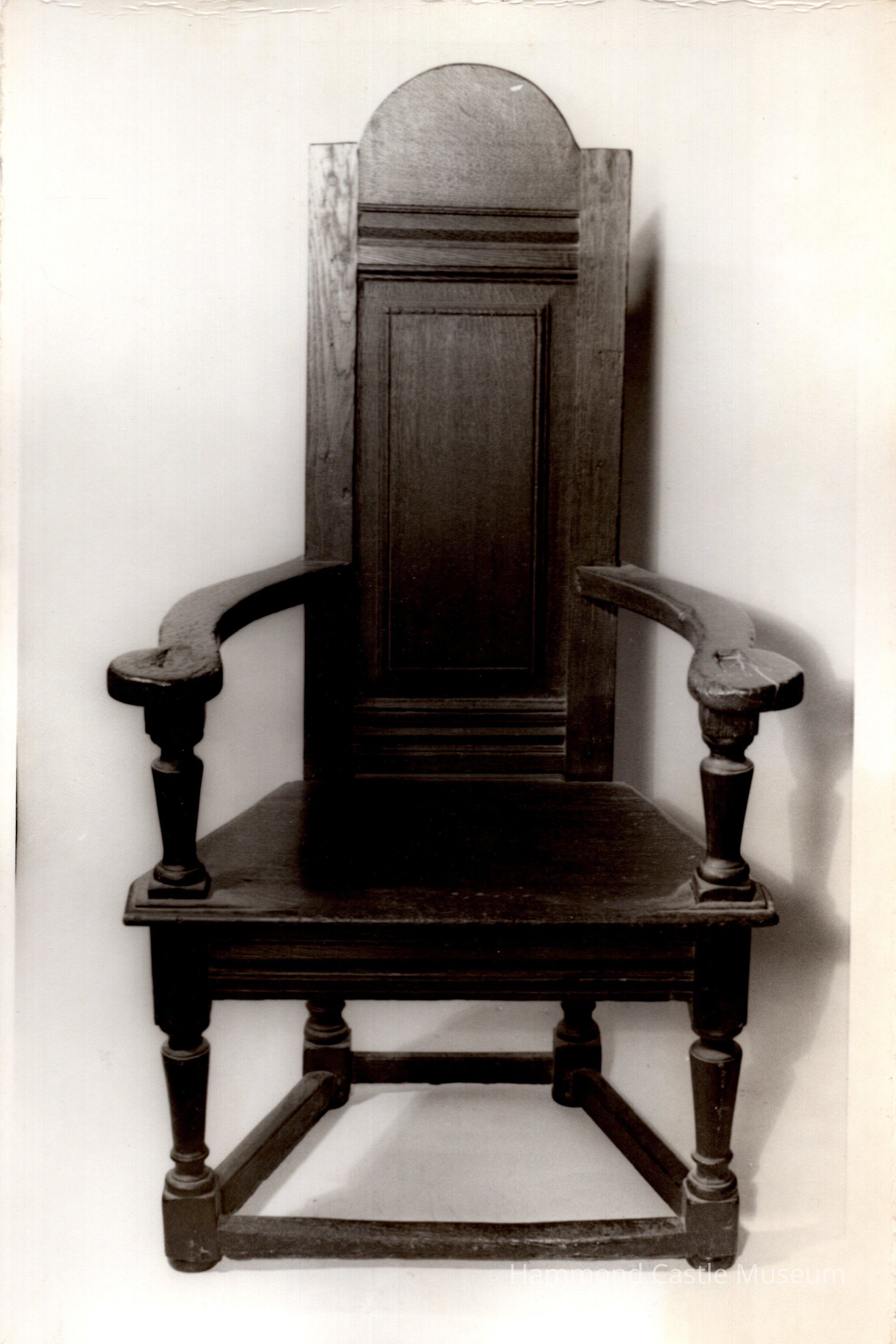 4-legged Jacobean wainscot chair with broad flat arms and crowned paneled back. Characteristic banister turned arm supports and legs in a period vase-shaped form. Four lower stretchers at feet.