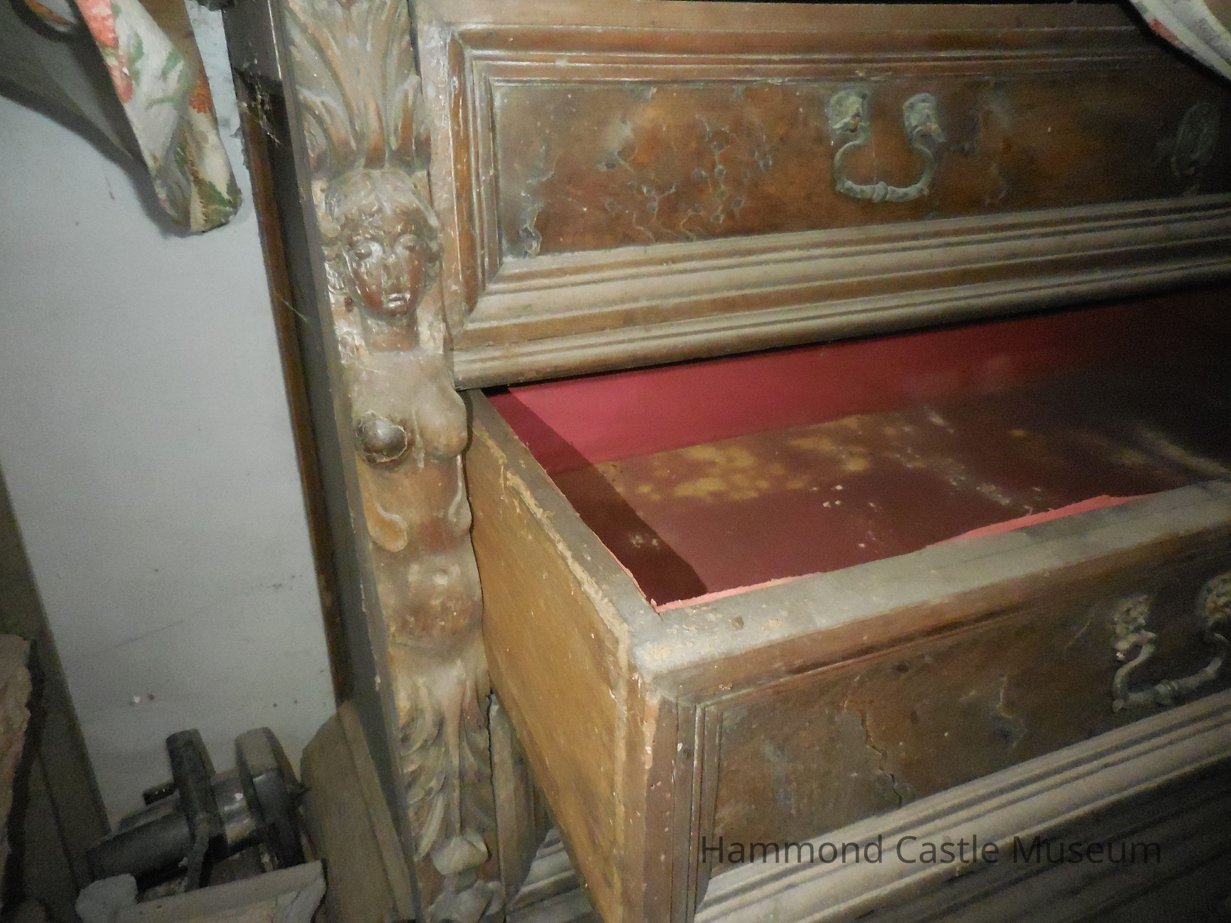 Located in Zalessky room. Water damaged and slightly moldy in drawers, covered in plastic sheeting to protect from environmental conditions. Wood is still holding up. - 4/26/2024, RSH