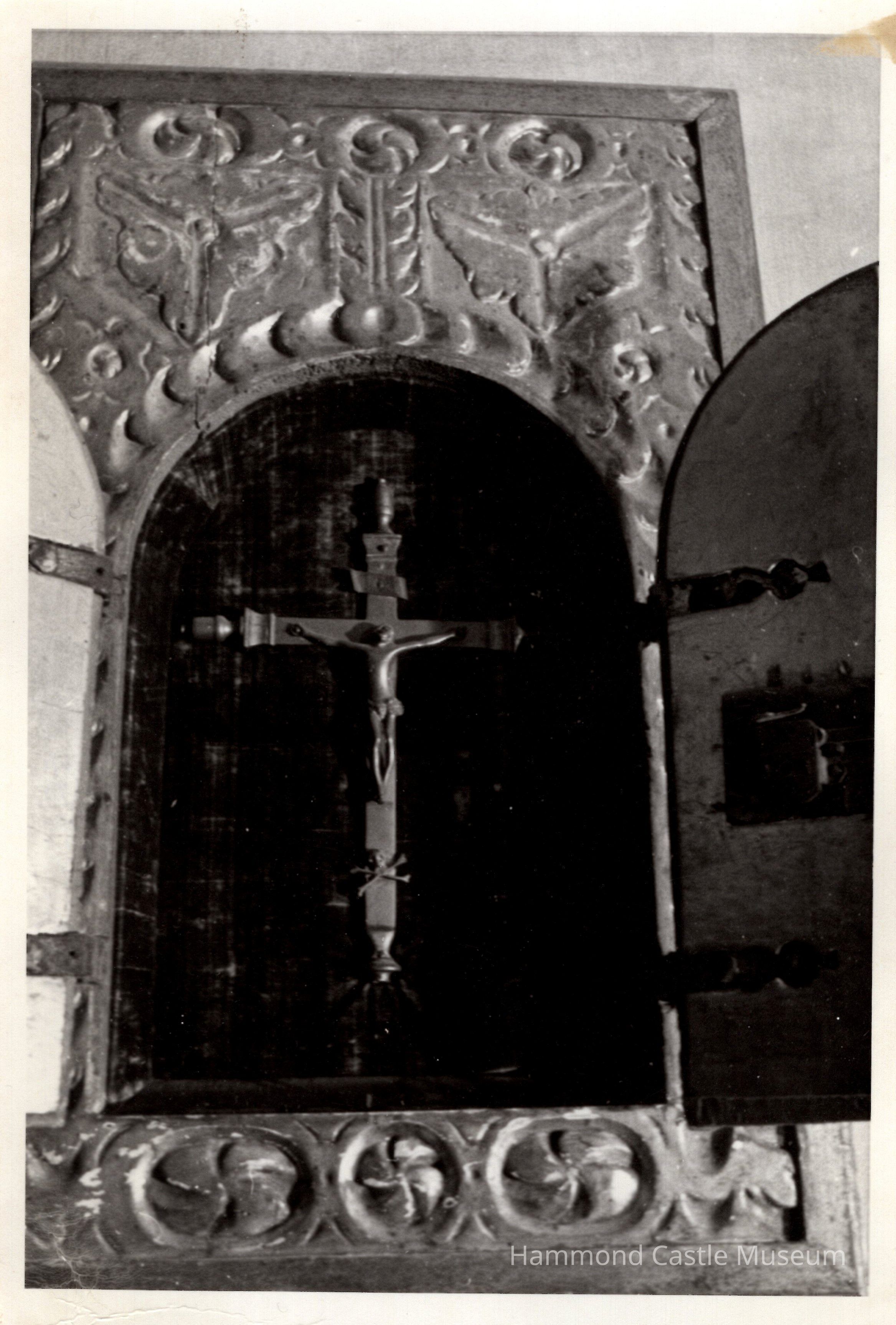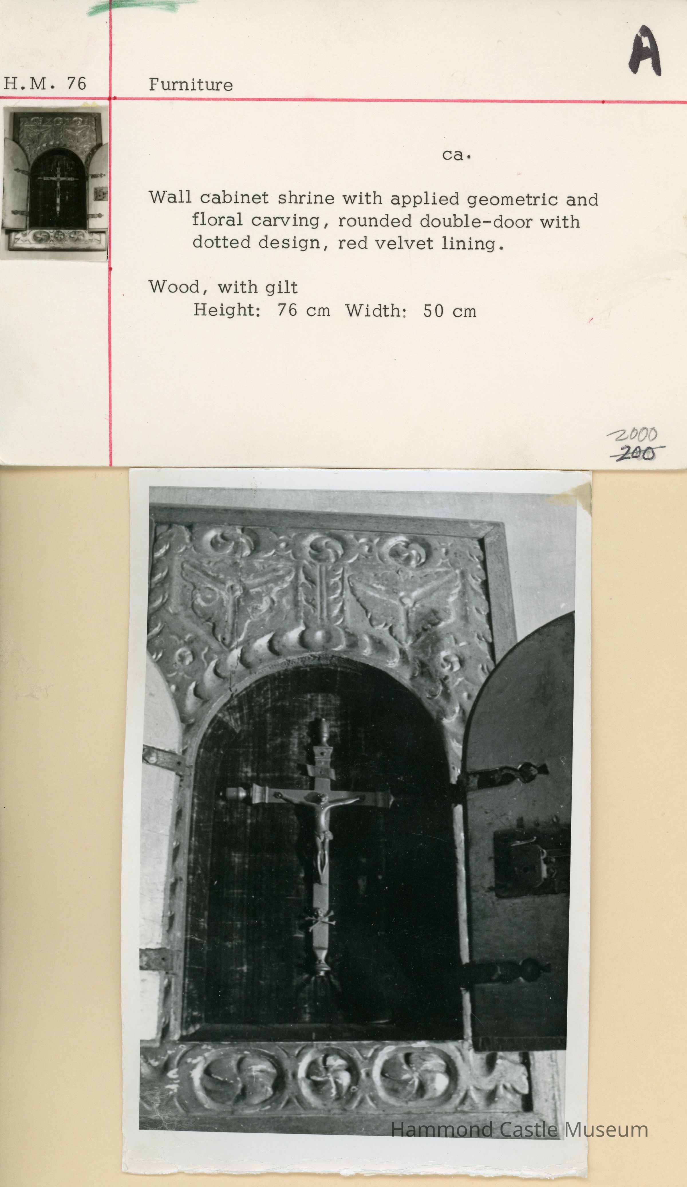Wall cabinet shrine with applied geometric and floral carving, rounded double-door with dotted design, red velvet lining. possibly 16th c Italian