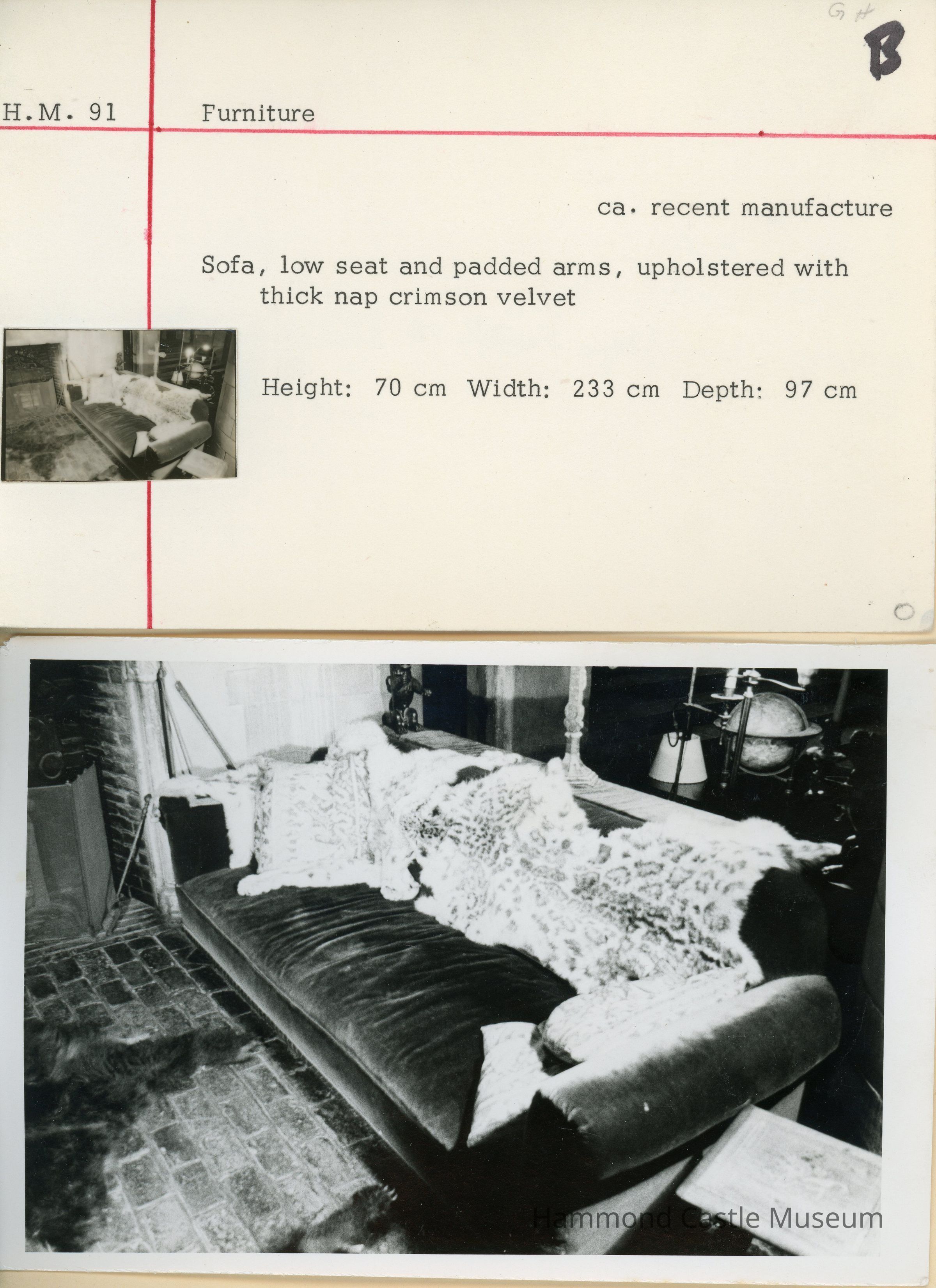 Low seat and padded arms, upholstered with thick nap crimson velvet. DEACCESSIONED and disposed of 2020 due to poor condition.