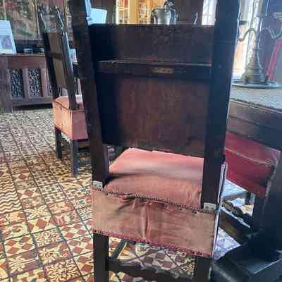 Medieval wooden chairs with carved scroll finials in a Florentine style