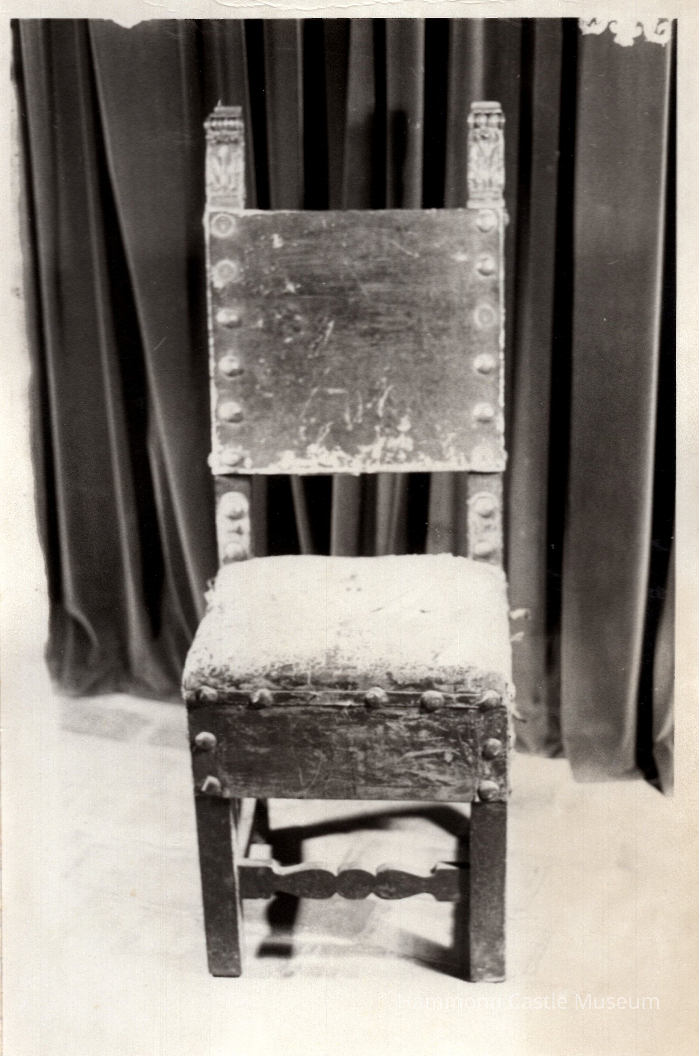 Originally leather covered seat and back, studded with large metal nails at intervals, leather skirt on front and side.