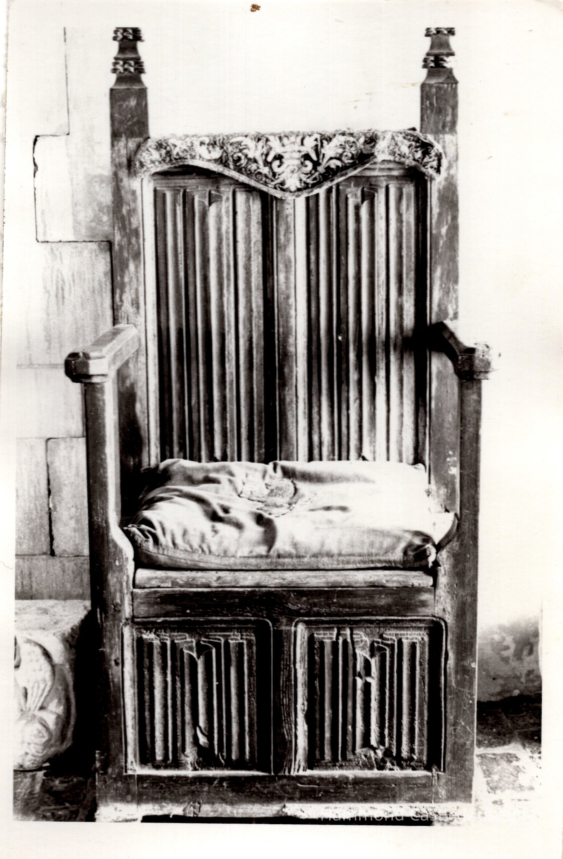 Wooden Chair, high back, linenfold pattern on backs and sides, square notched new finials, lift seat. Panels with "folded linen" detail. Possibly a Commode.