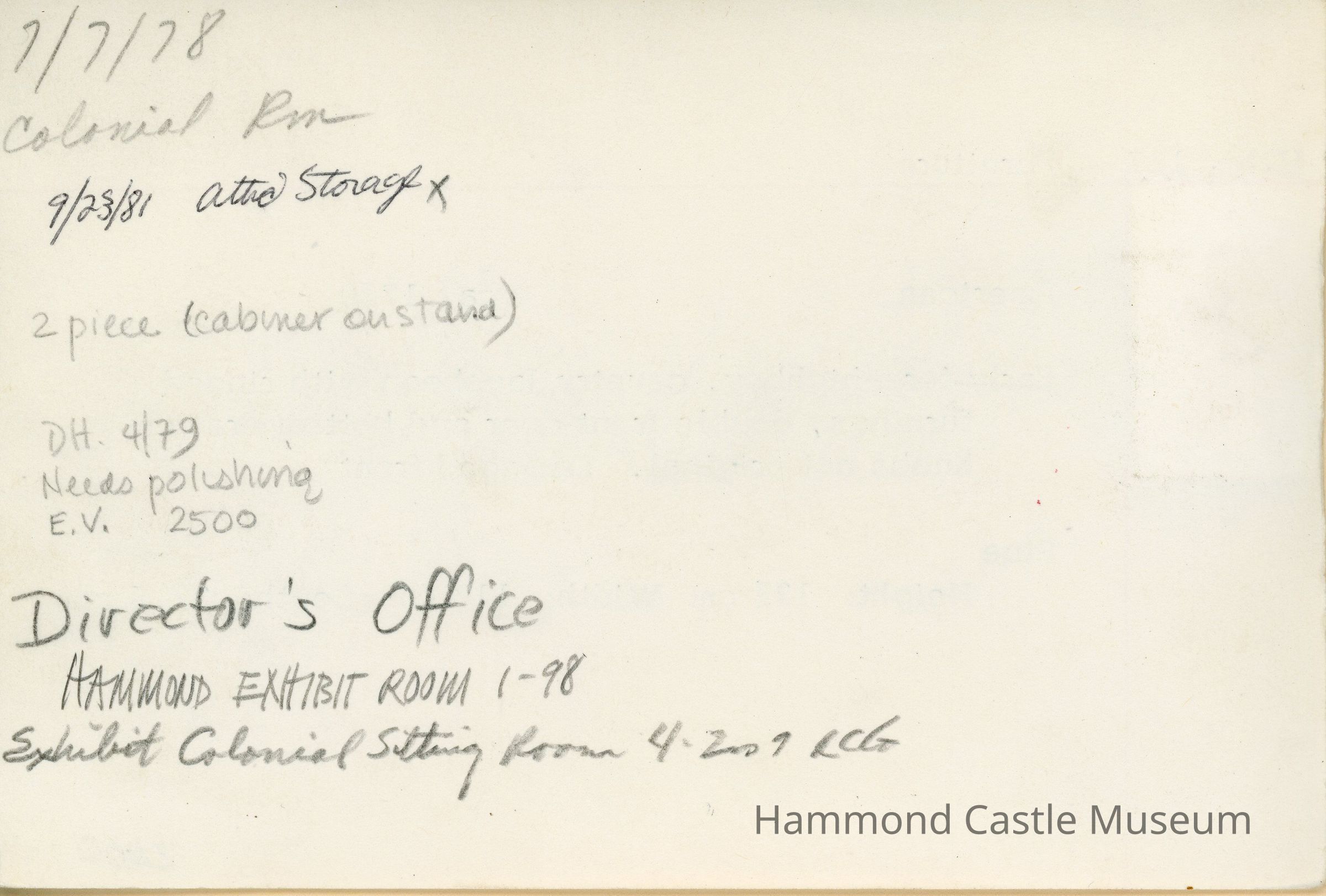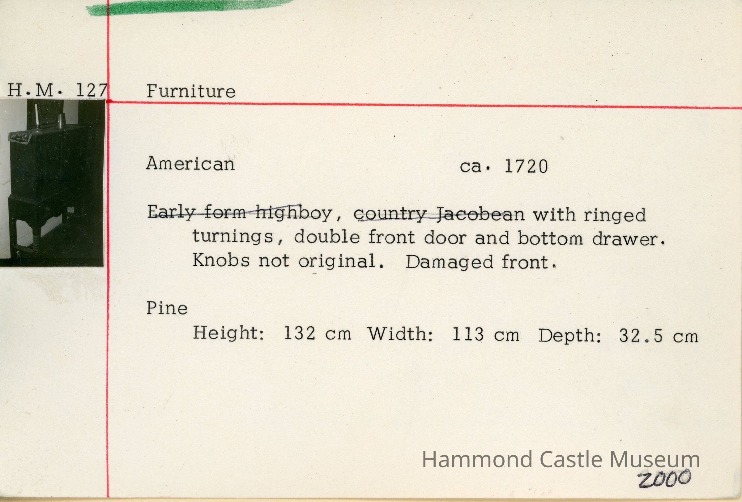 Cabinet with ringed turnings, double front door and bottom drawer supported on braced legs. Knobs not original.