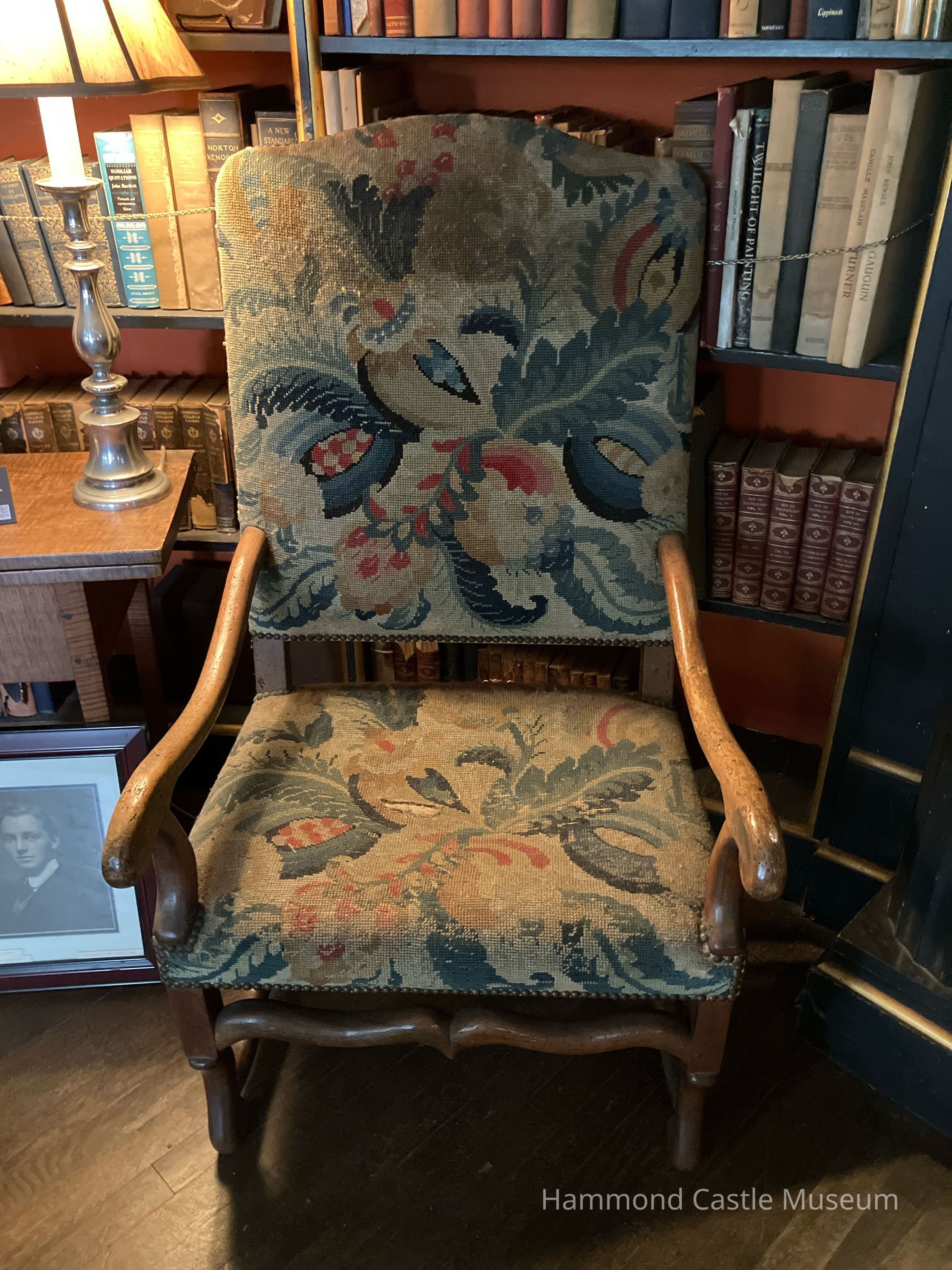 Side chair, with high full back and seat, serpentine arms and stretcher. Small holes throughout all of wood. Covered with gross point tapestry in large floral pattern of blues, greens and tans. (H.M.189) ?ca 1690
