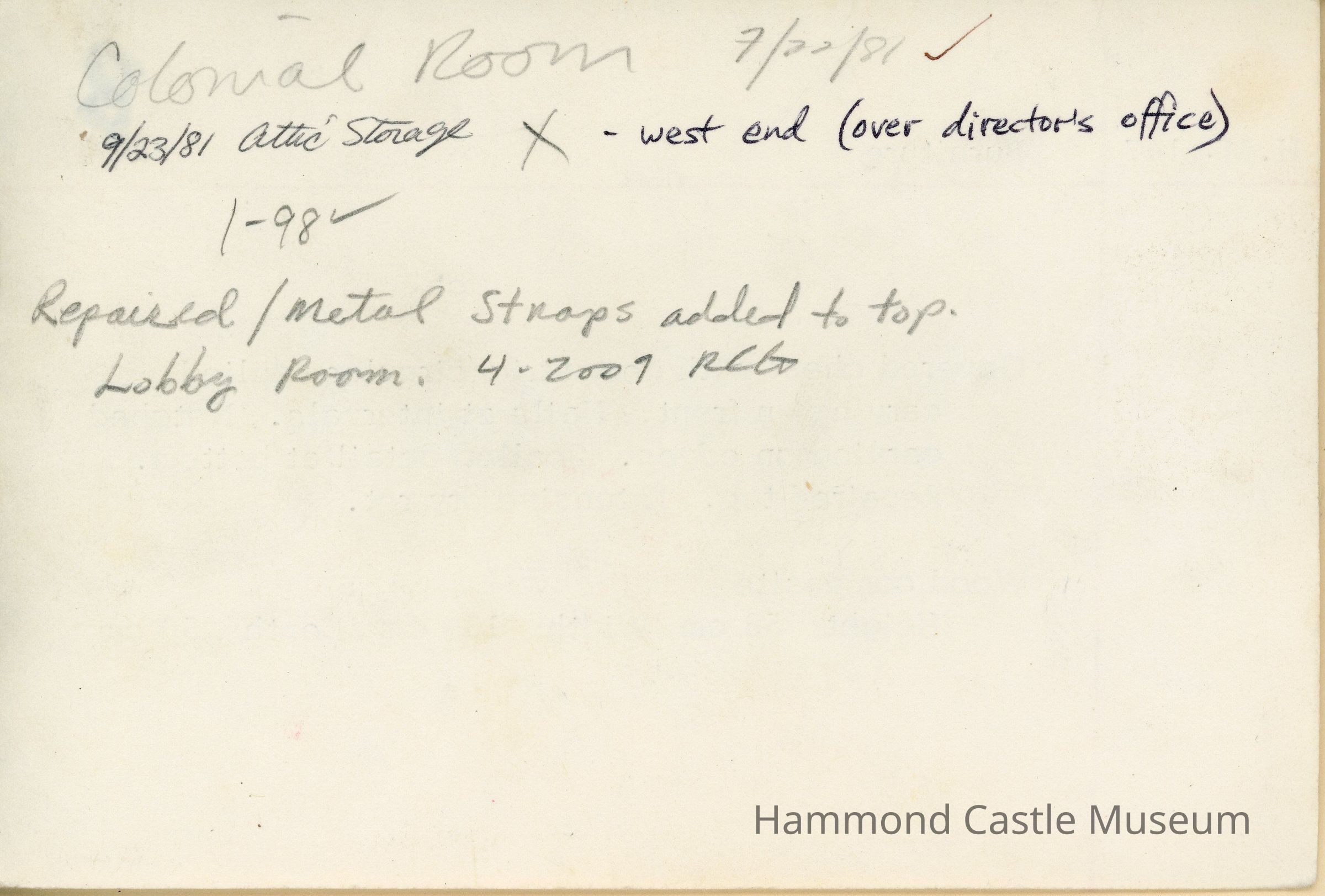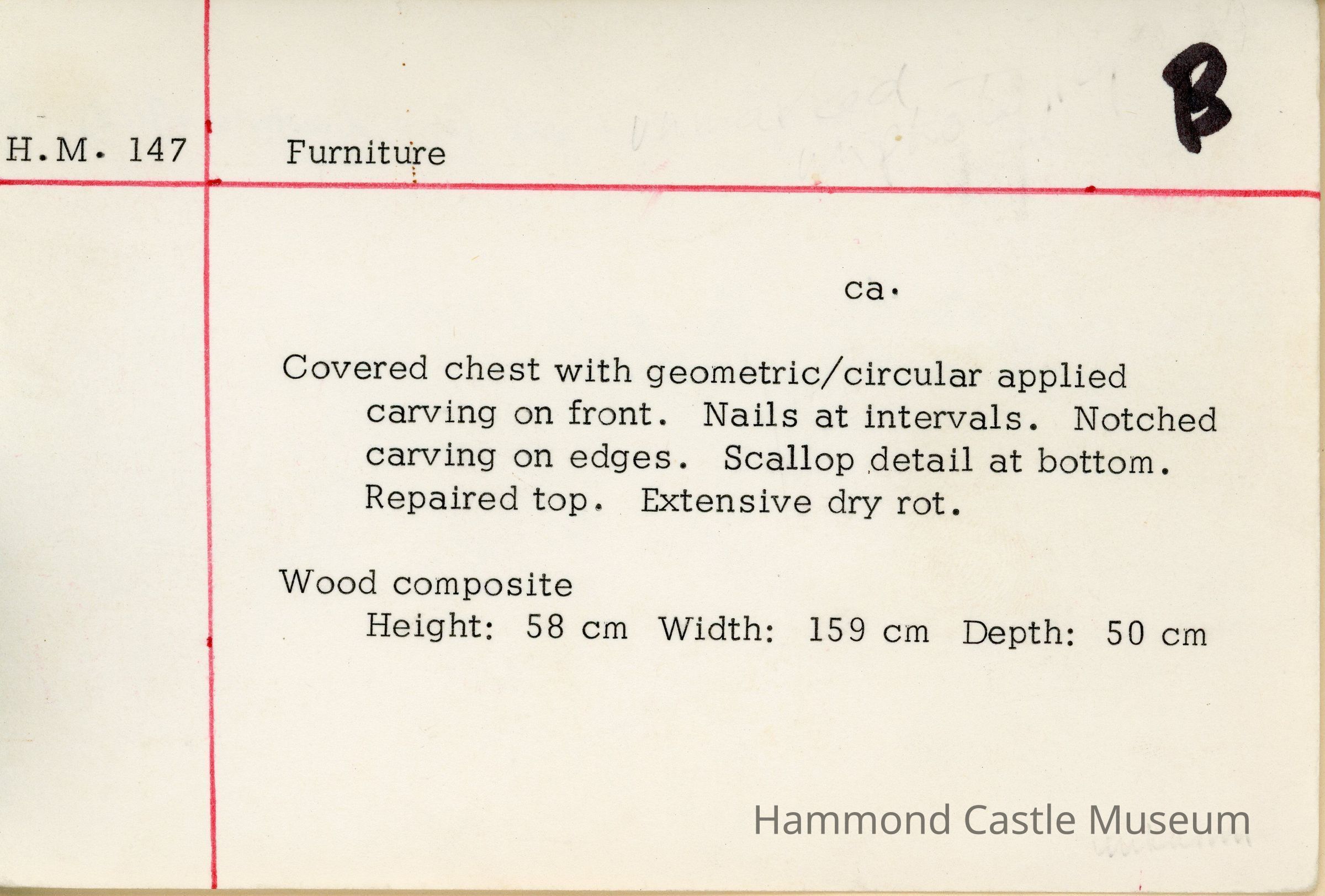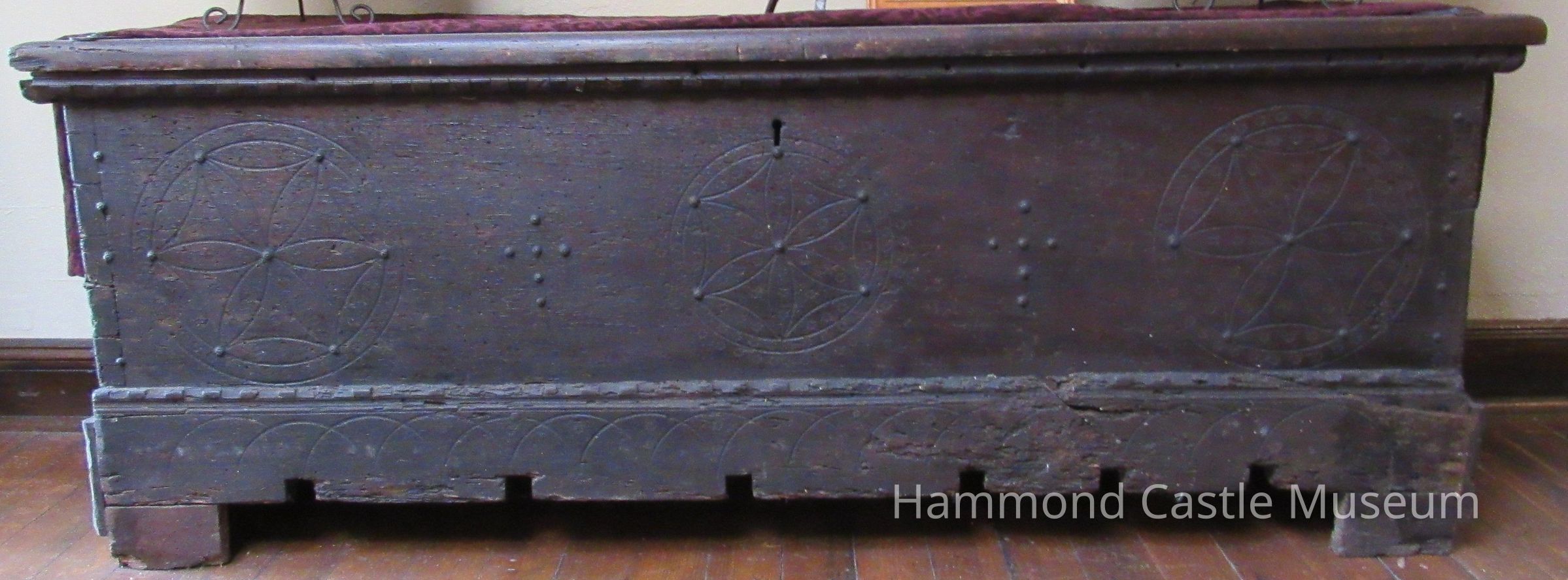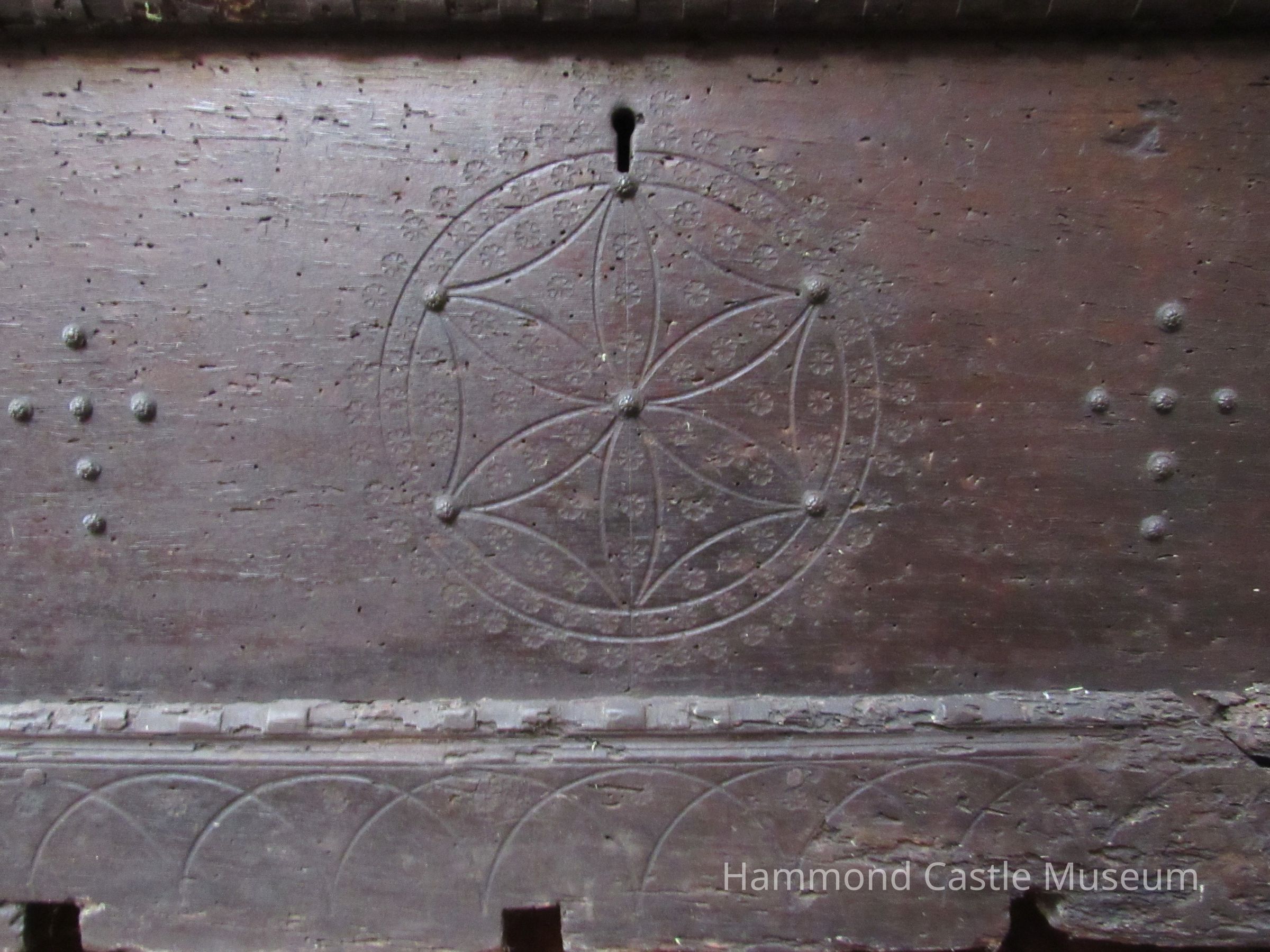 Covered chest with geometric/circular applied carving on front. Nails at intervals. Notched carving on edges. Scallop detail at bottom.