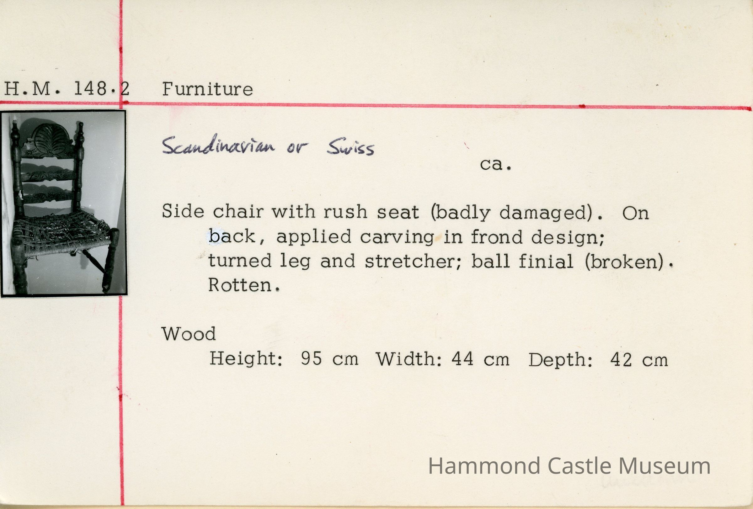 Side chair with rush seat (badly damaged). On back, applied carving in frond design; turned leg and stretcher; ball finial (broken).