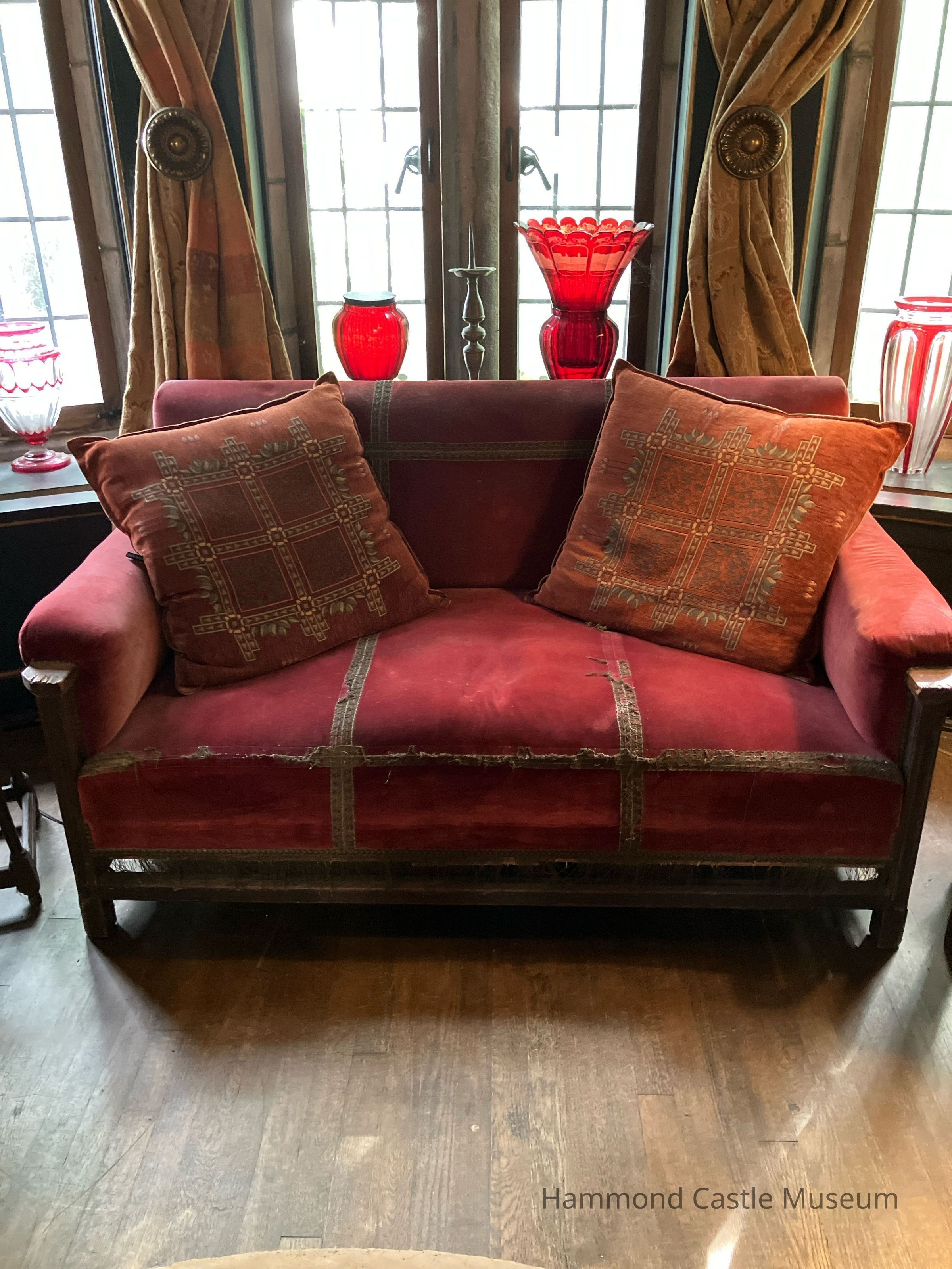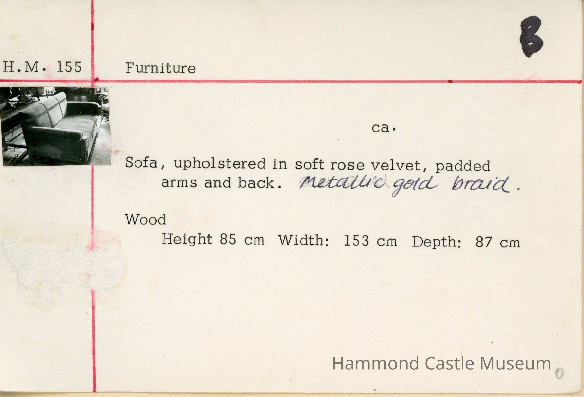 HM155 rose velvet sofa w gold braid (1983 condition report)