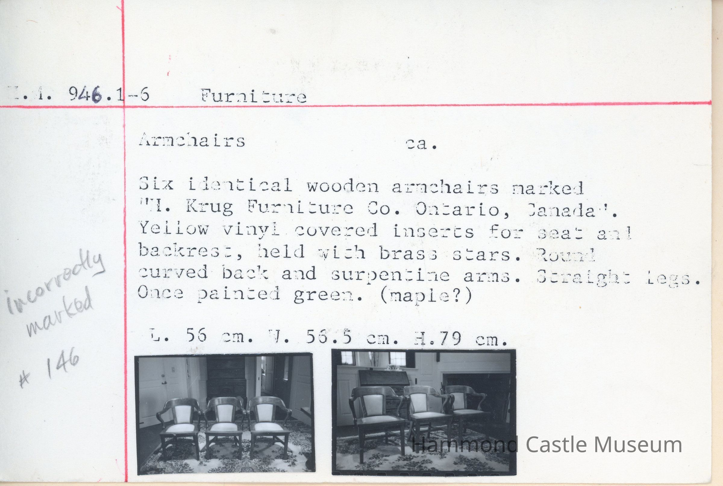 Six identical wooden armchairs marked "N. Krug Furniture Co. Ontario, Canada". Yellow vinyl covered inserts for seat and backrest, held with brass stars. Round curved back and serpentine arms. Straight legs. Once painted green.