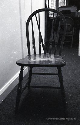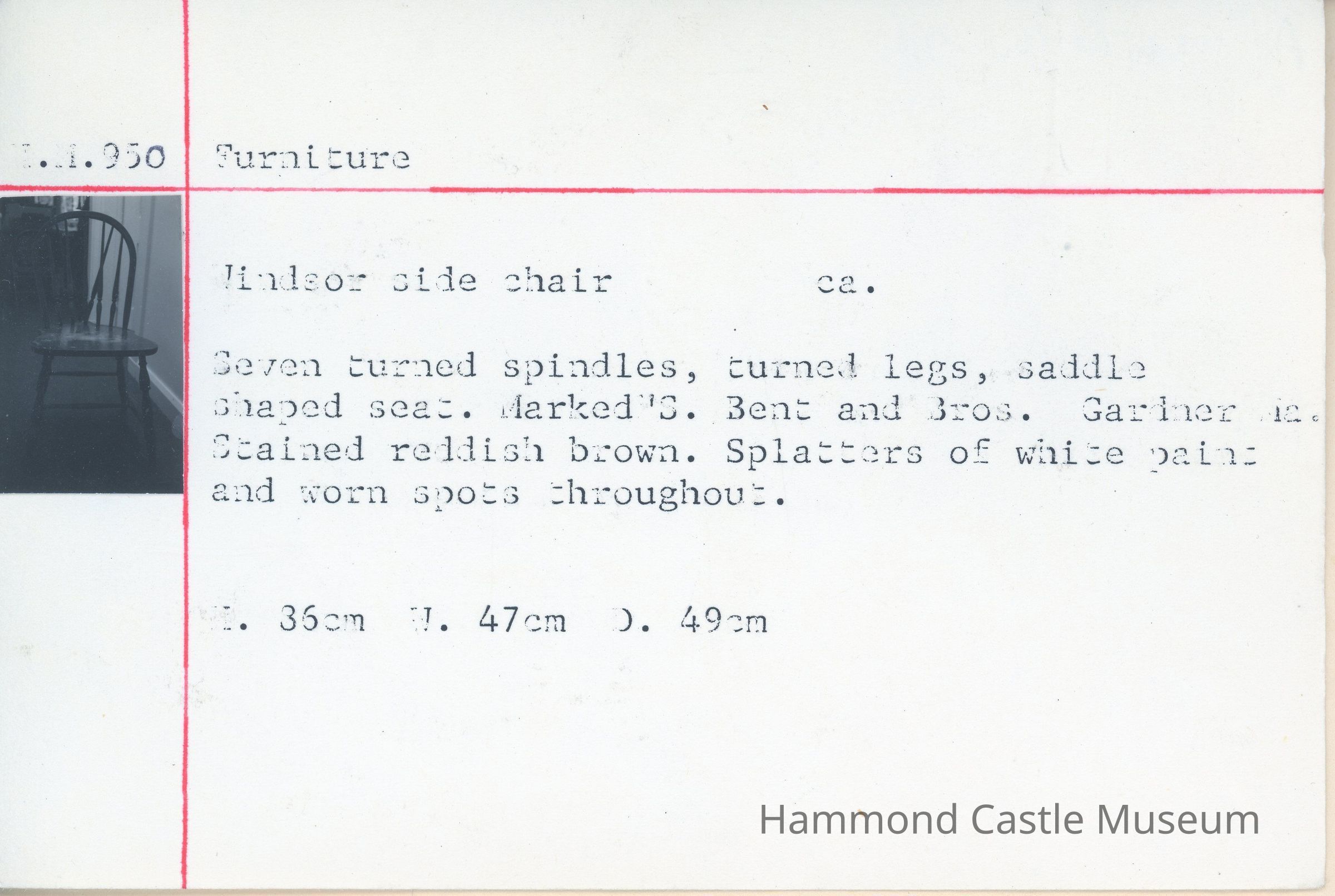 Windsor side chair. Seven turned spindles, turned legs, saddle shaped seat. Marked "S. Bent and Bros. Gardner, Ma." Stained reddish brown. Splatters of white paint and worn sports throughout.