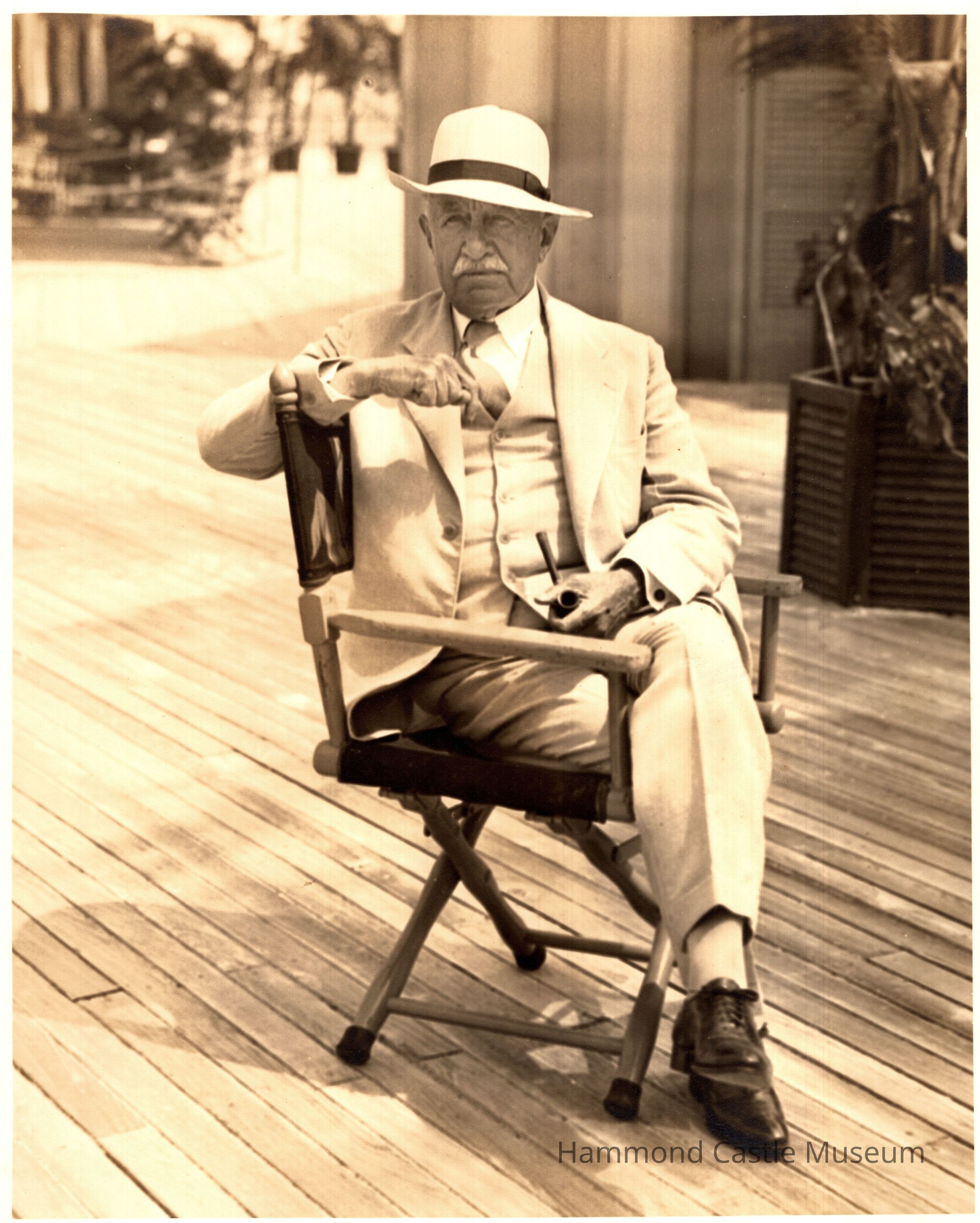 Photo of Hammond Sr in lounge chair, Boca Raton Club, Florida, 1935 ca