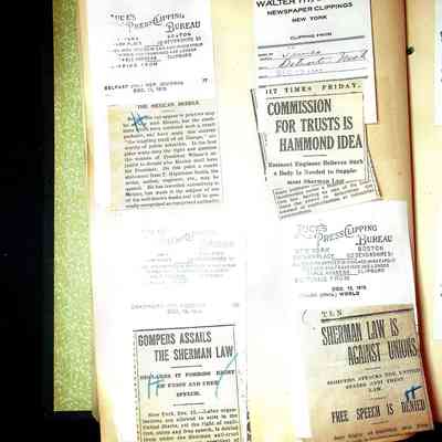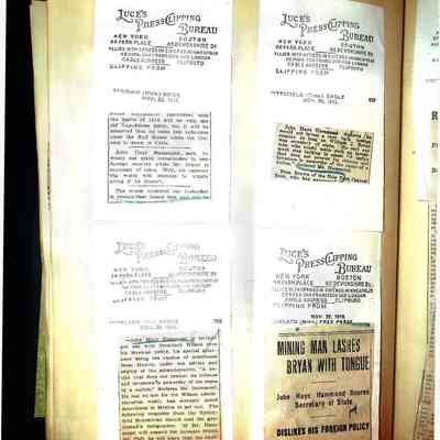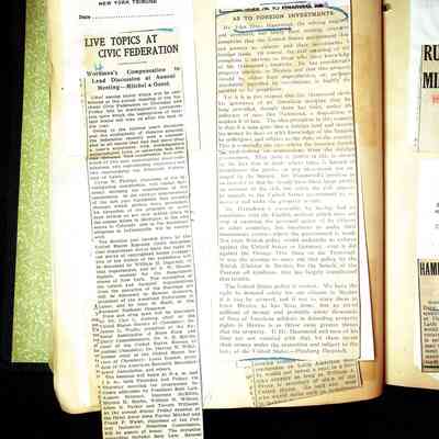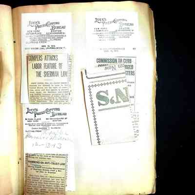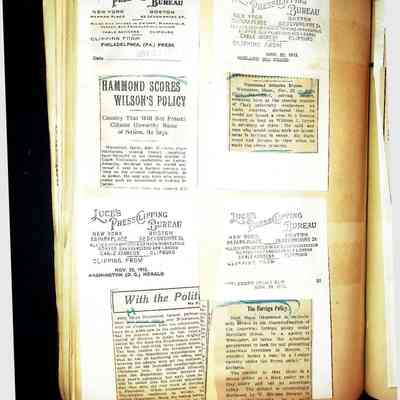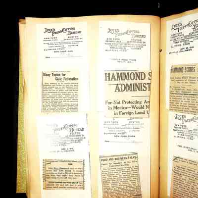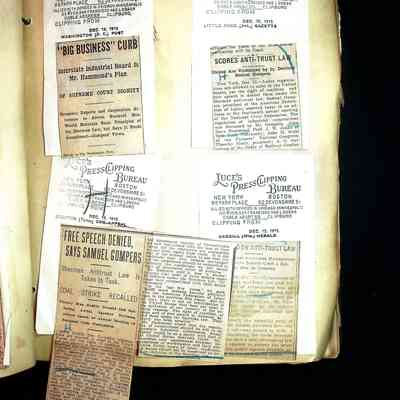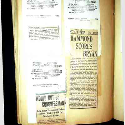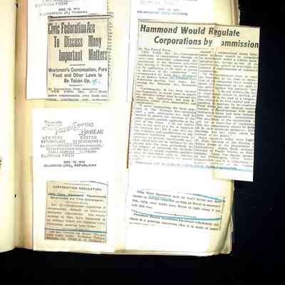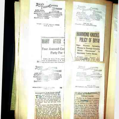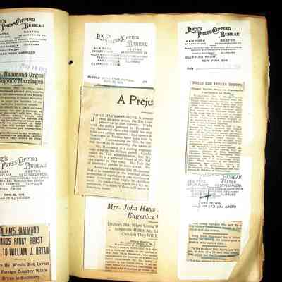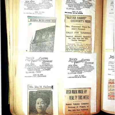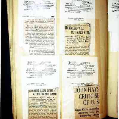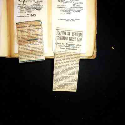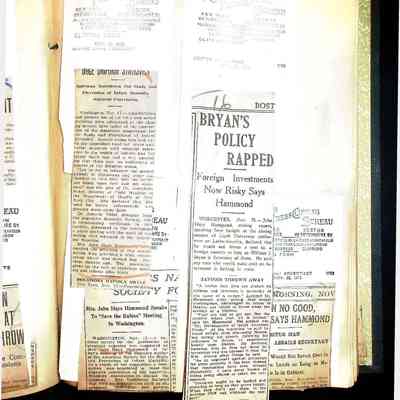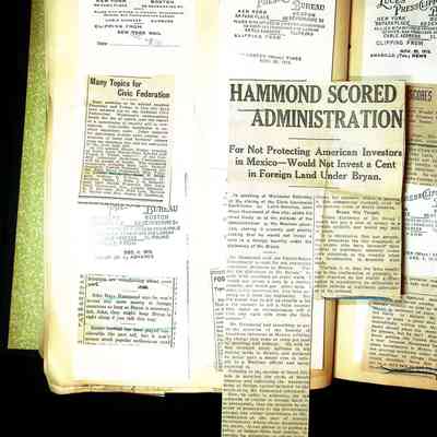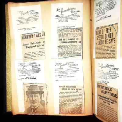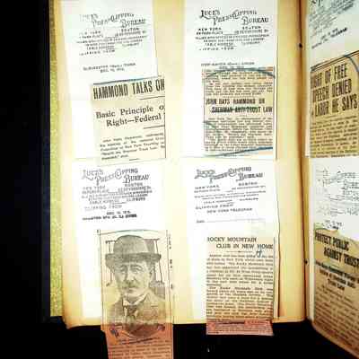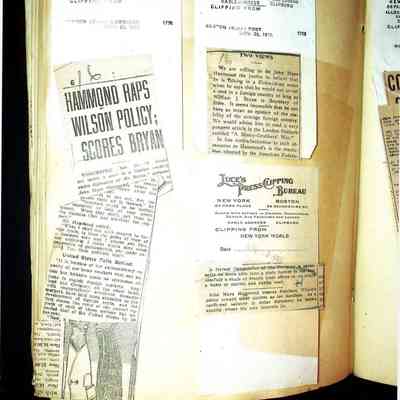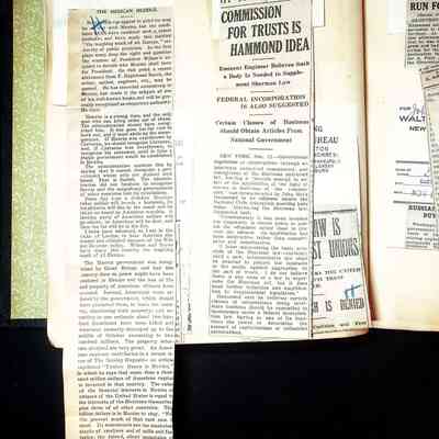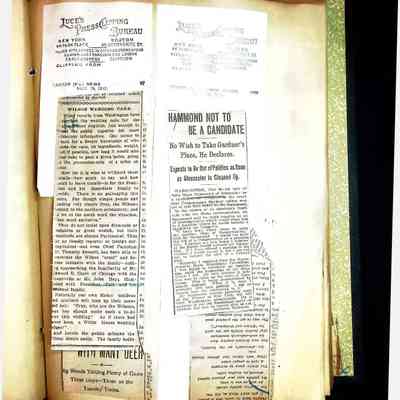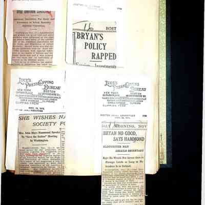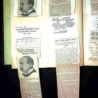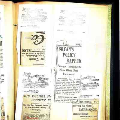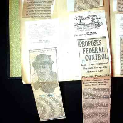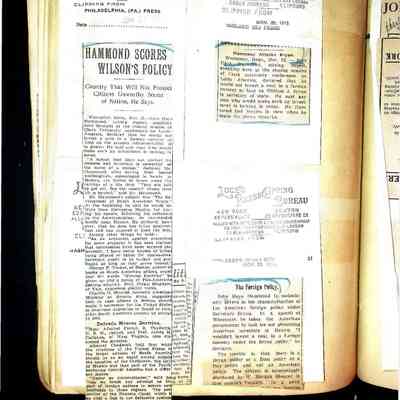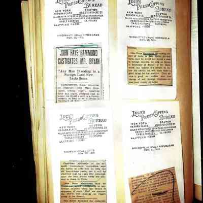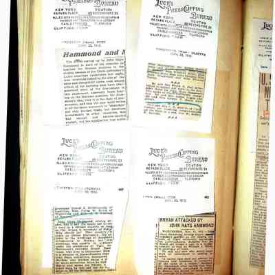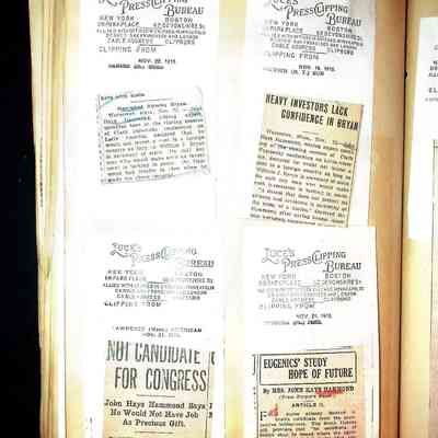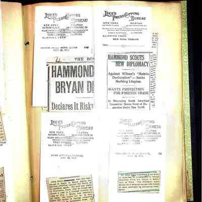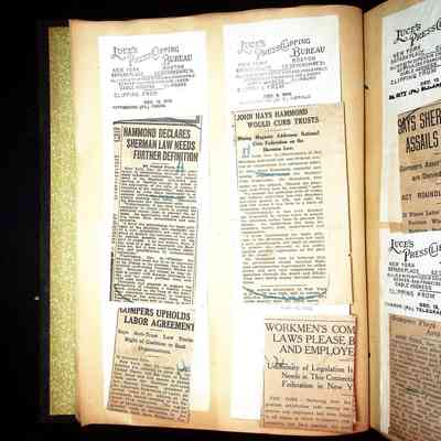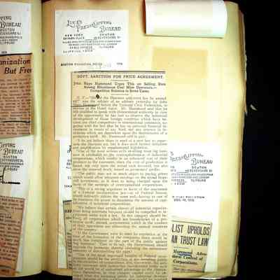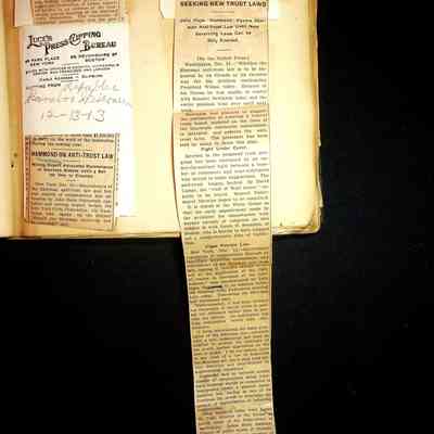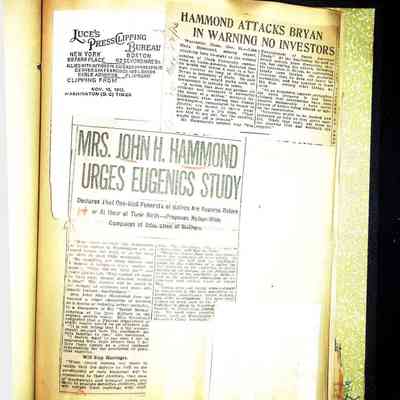 1913 scrapbook of newspaper articles about John Hays Hammond (Sr) and Mrs. Hammond covering governmental policies, Sherman Act, Eugenics & politics.