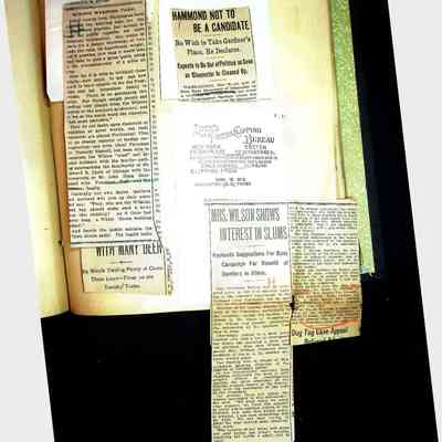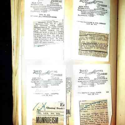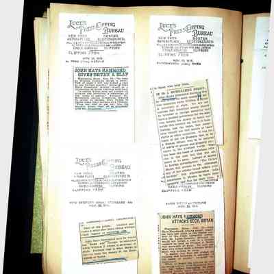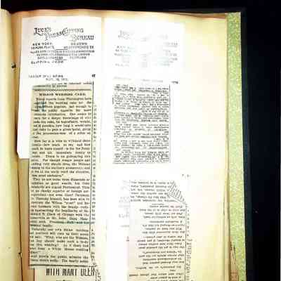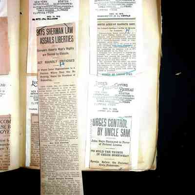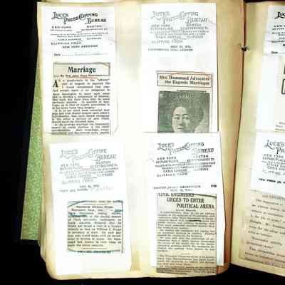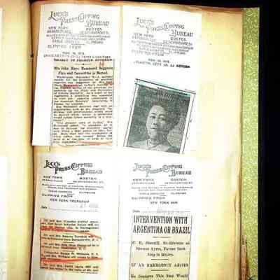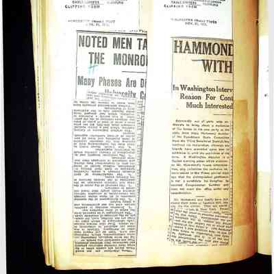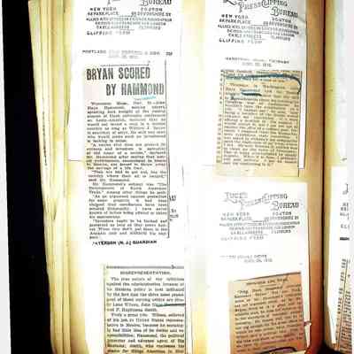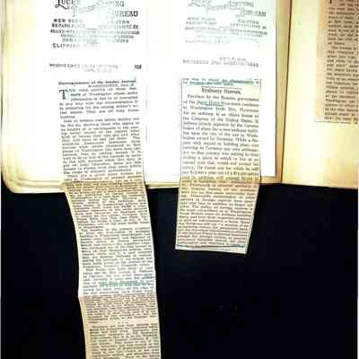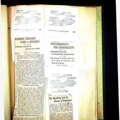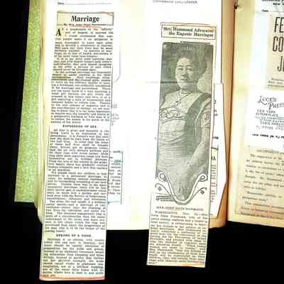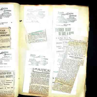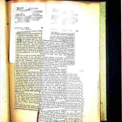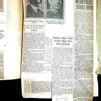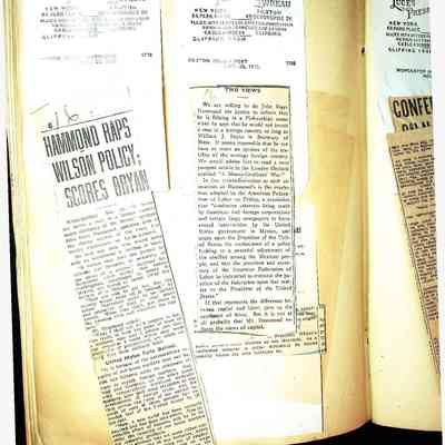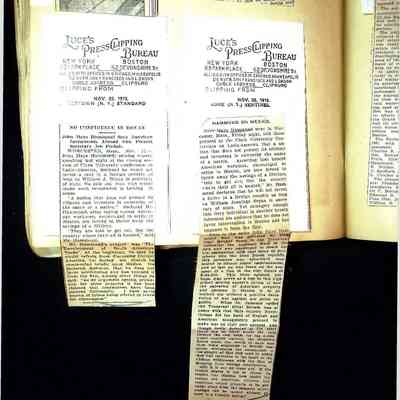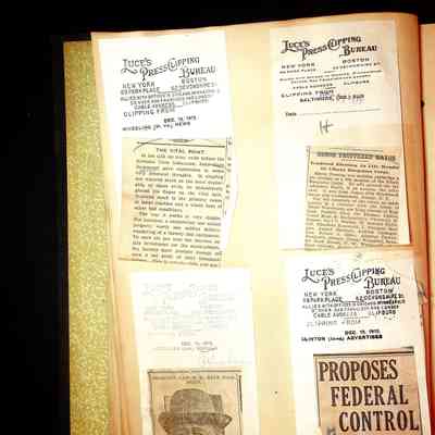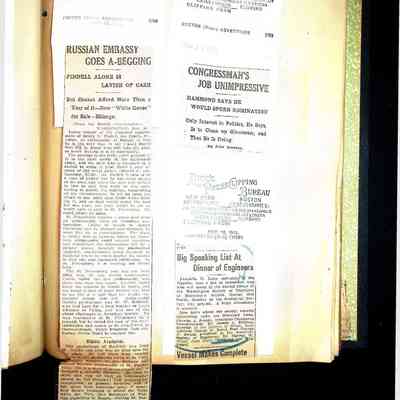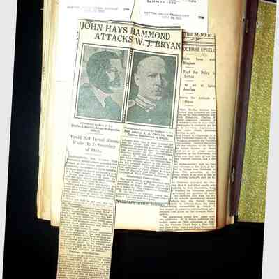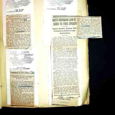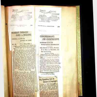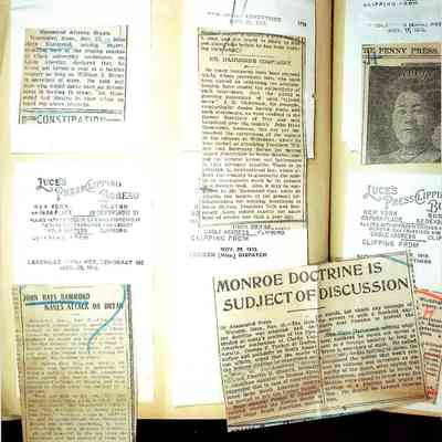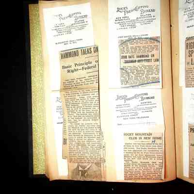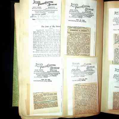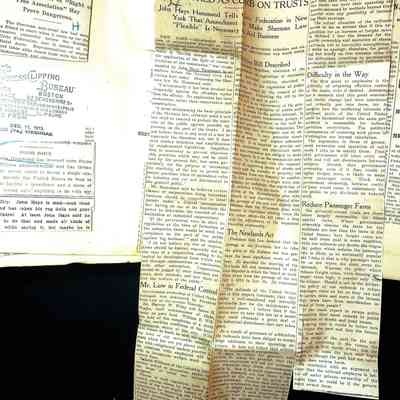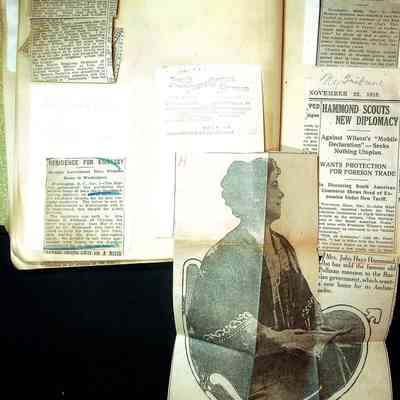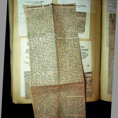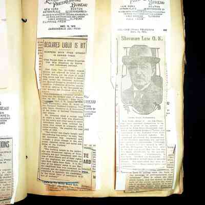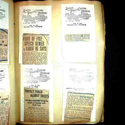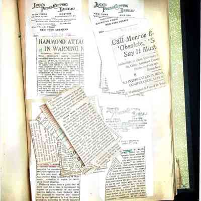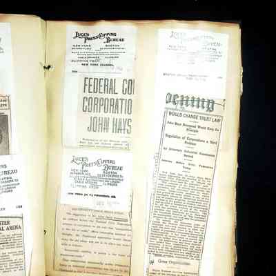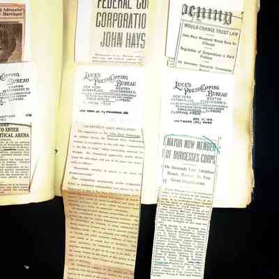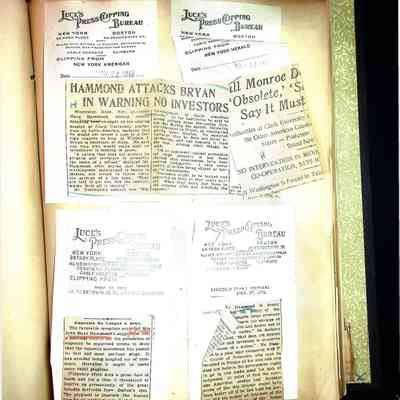 1913 scrapbook of newspaper articles about John Hays Hammond (Sr) and Mrs. Hammond covering governmental policies, Sherman Act, Eugenics & politics.