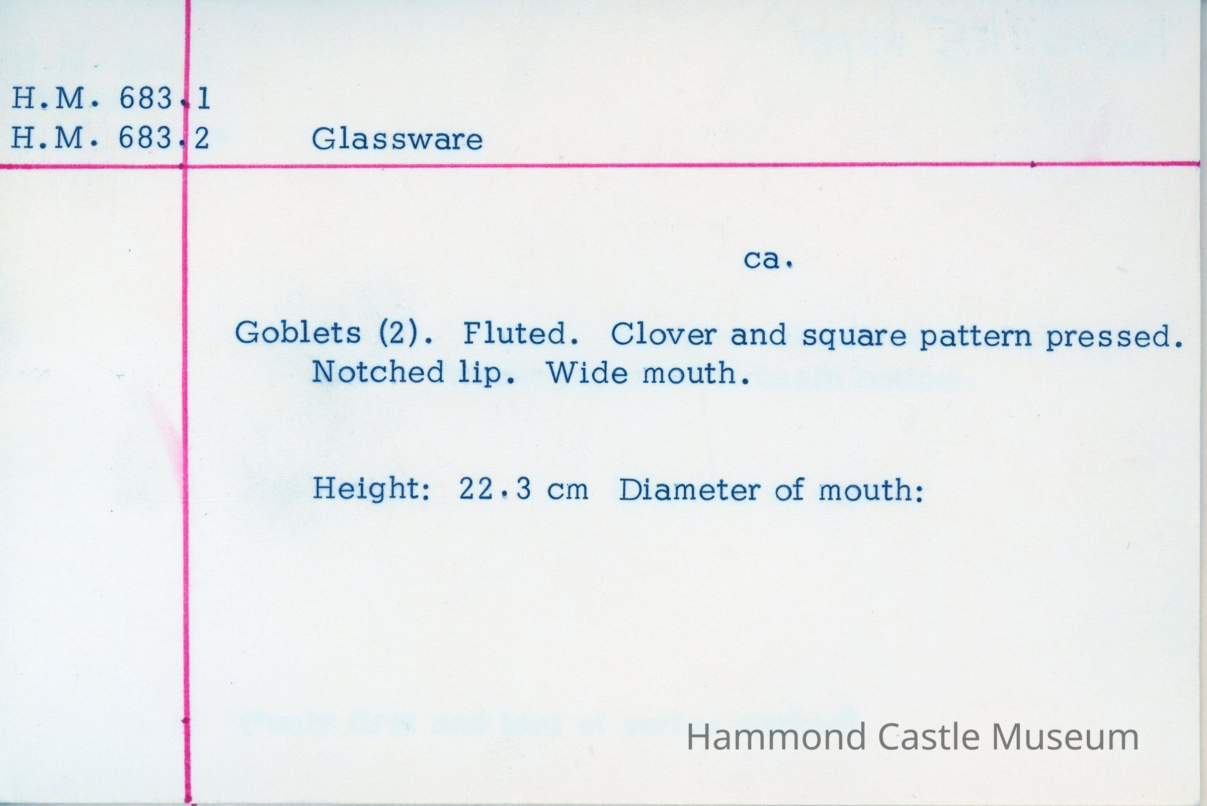 Set of 2. Fluted. Clover and square pattern pressed. Notched lip. Wide mouth.
