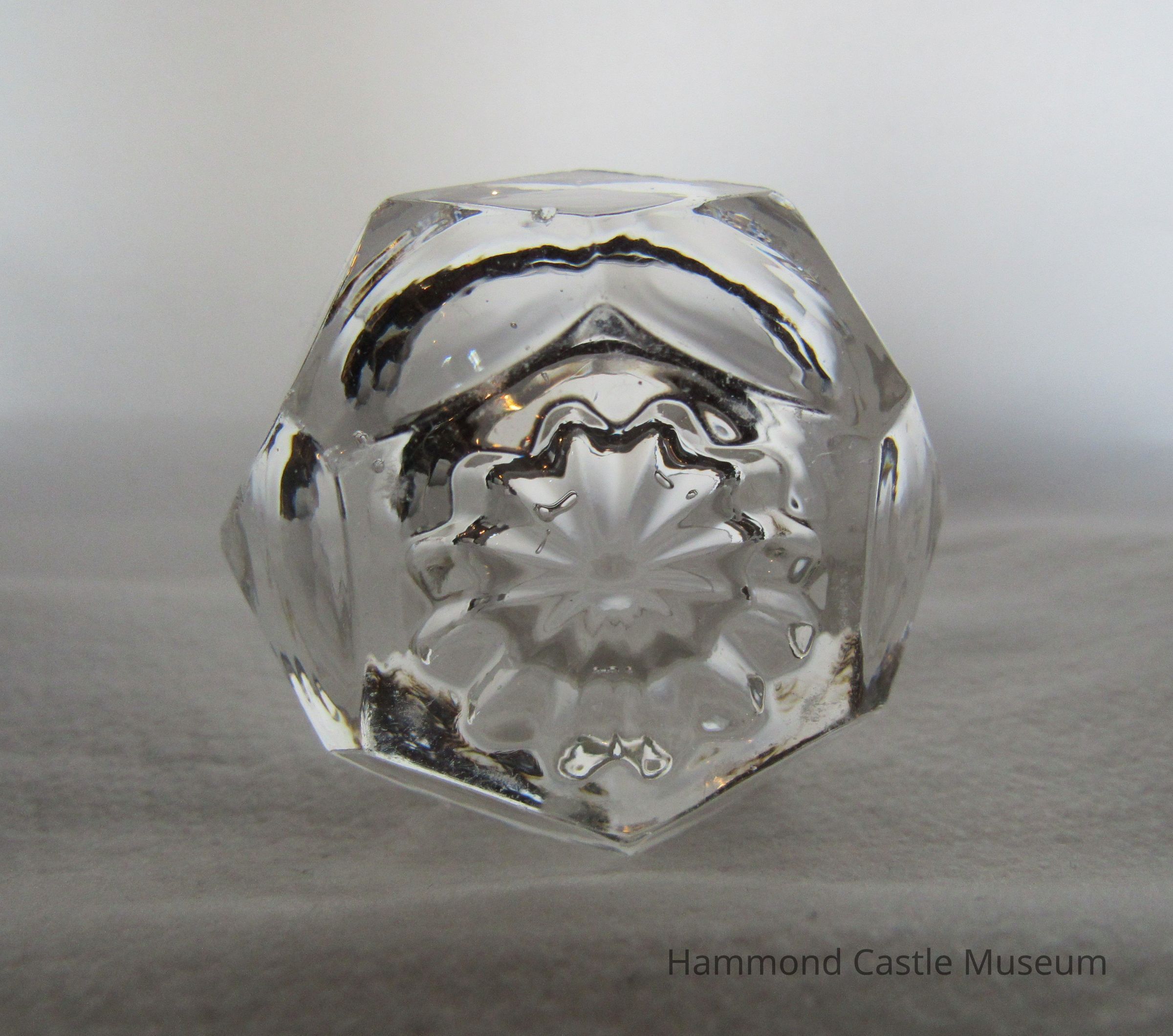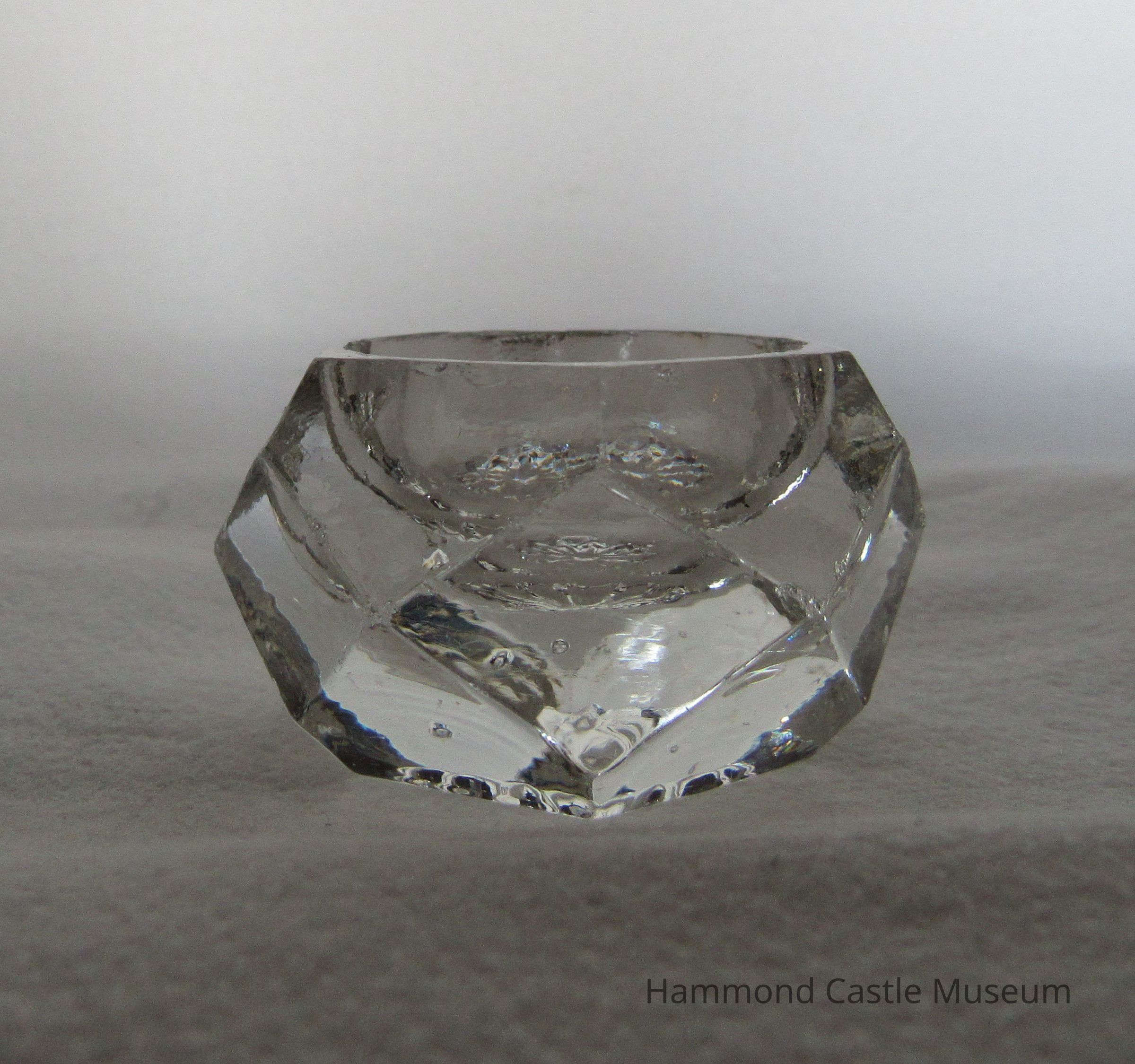 Part of mixed set of 12 salt containers. Various shapes, colors and designs. #7-12 Clear Glass Pressed clear glass; six-sided and many-faceted.