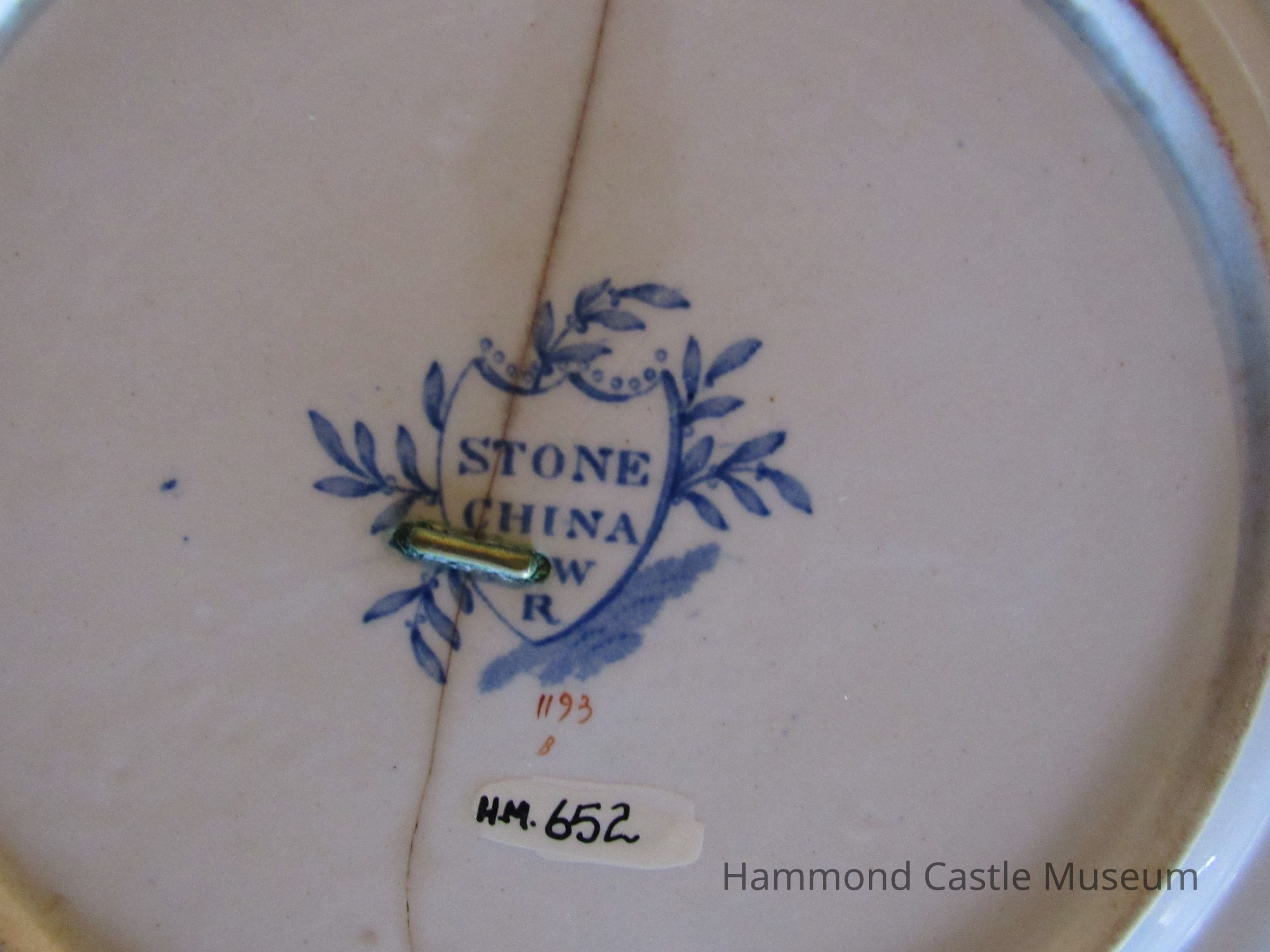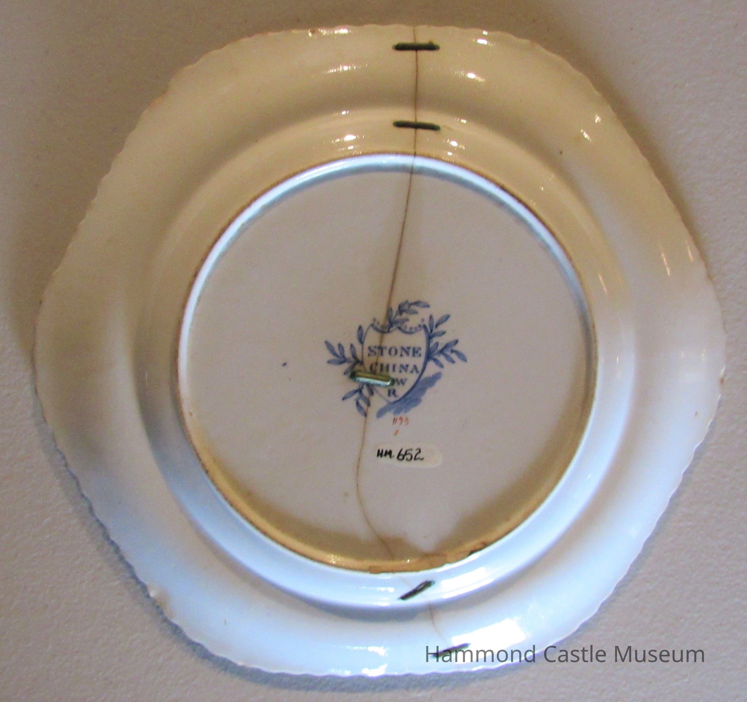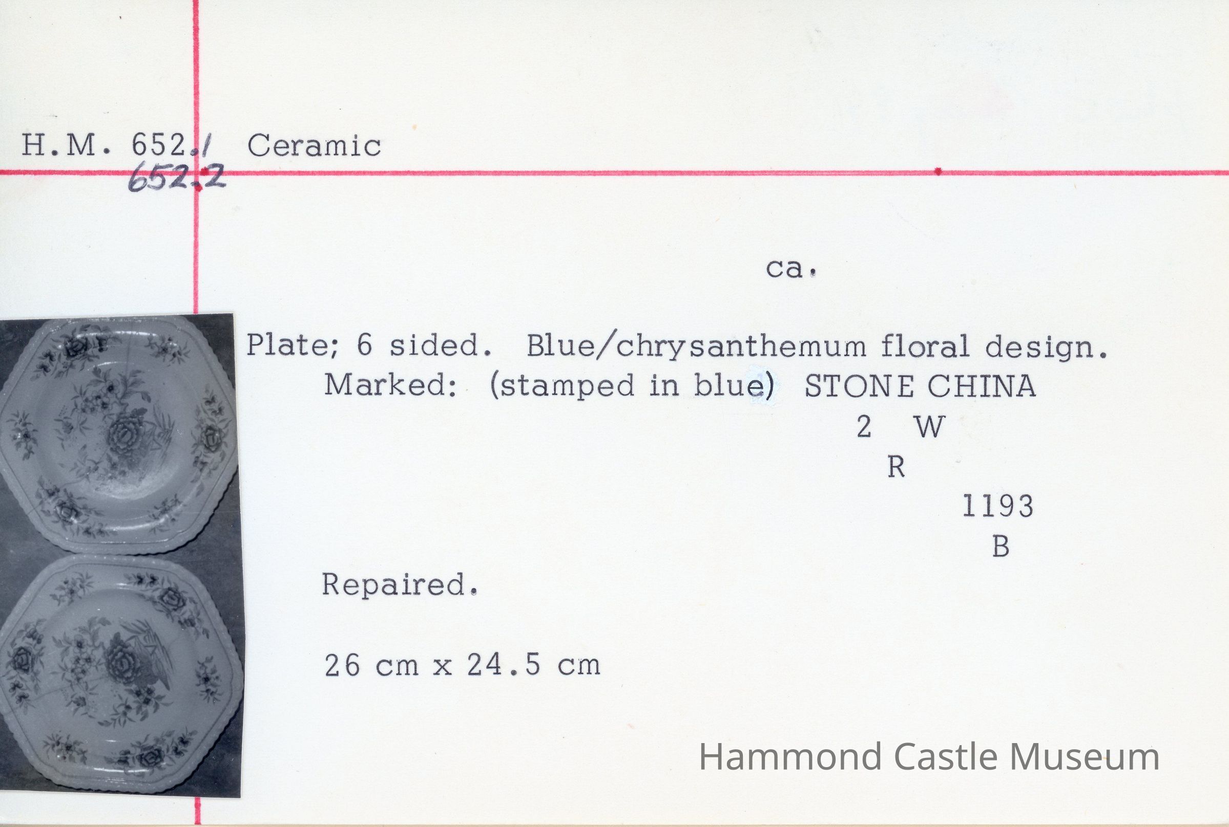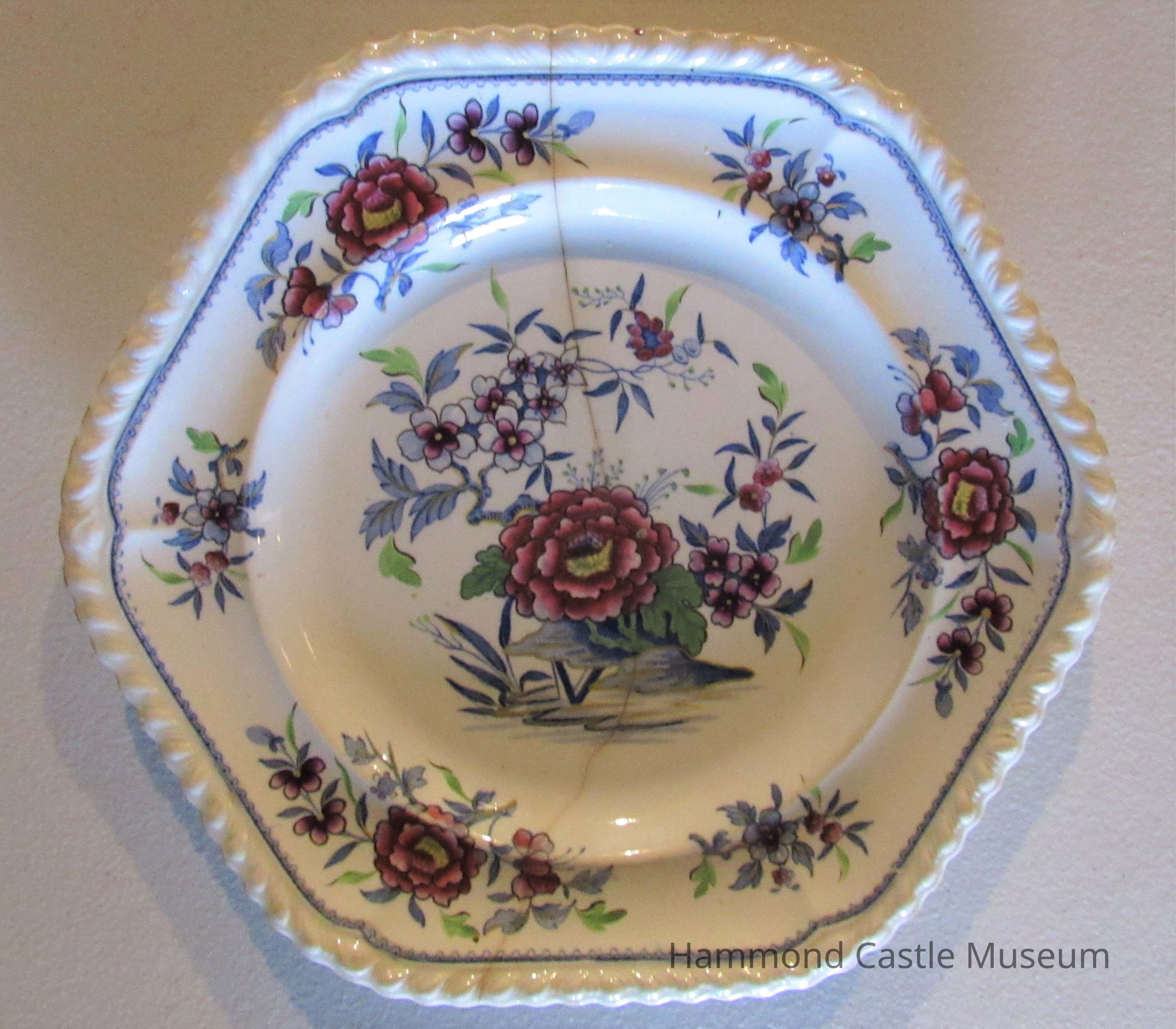 6-sided ceramic plate. Blue & pink chrysanthemum floral design. Cracked from top to bottom. Repaired. Marked: (stamped in blue) STONE CHINE 2 W R 1193 B