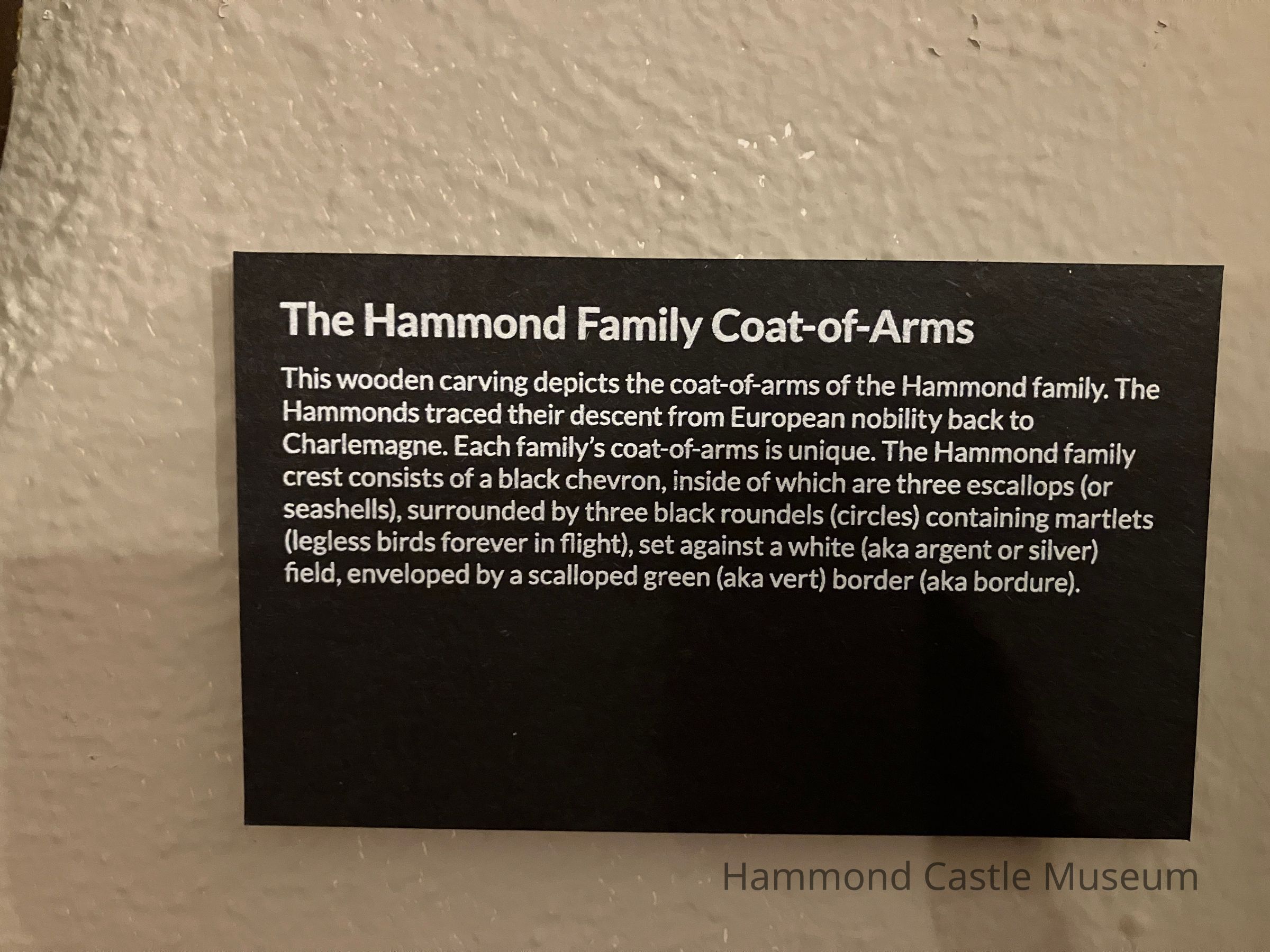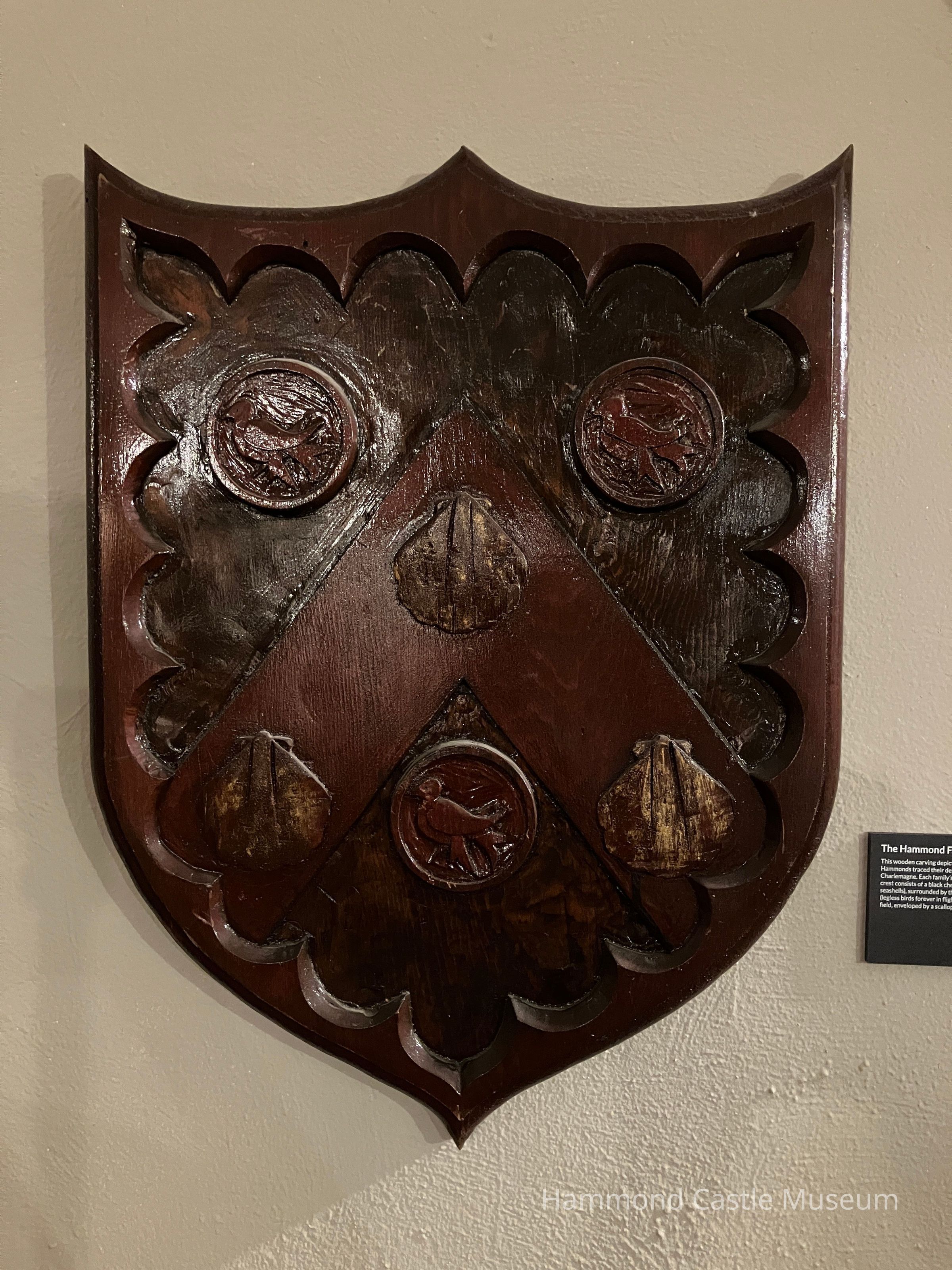 Carved wooden shield with the Hammond family coat of arms On a chevron shape are 3 escallops (seashells) Above and inside chevron are 3 roundels containing martlets (legless birds)