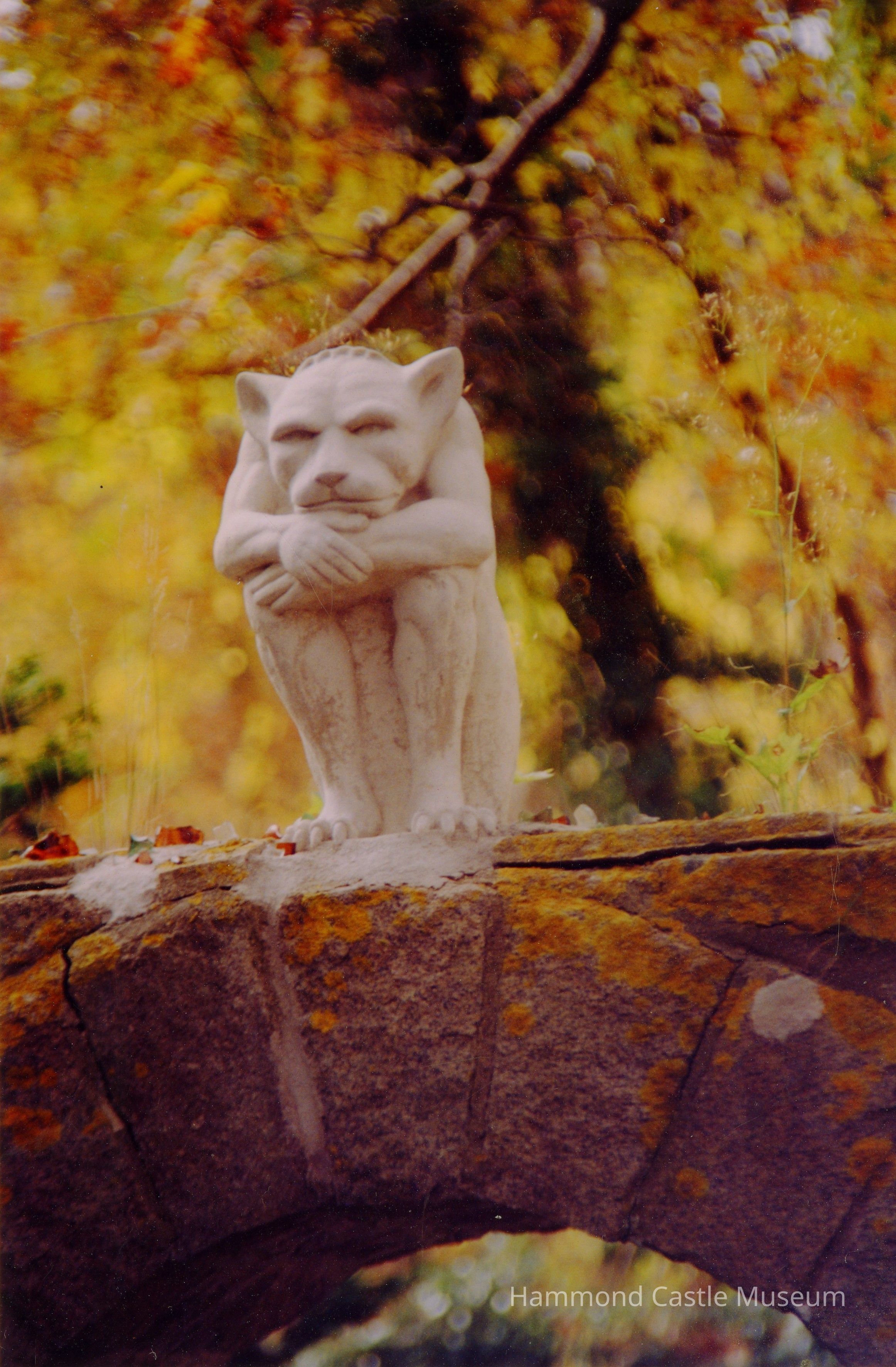 Postcard of grotesque over Cat Garden gate with fall foliage Image by Eileen (?)