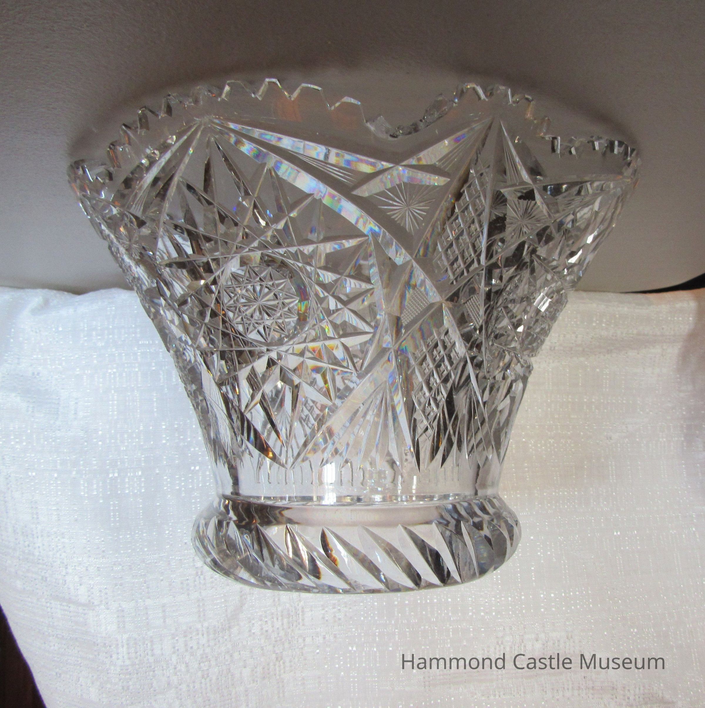 b) cut glass base w geometric patterns, thick bottom edge and scalloped top with crenulation