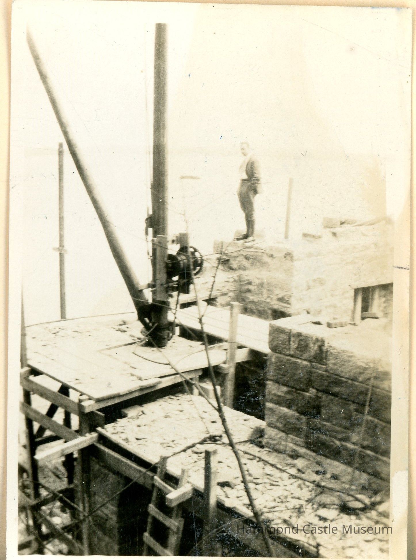 Photo of Hammond on wall looking over construction & lifting derrick Photo source unknown