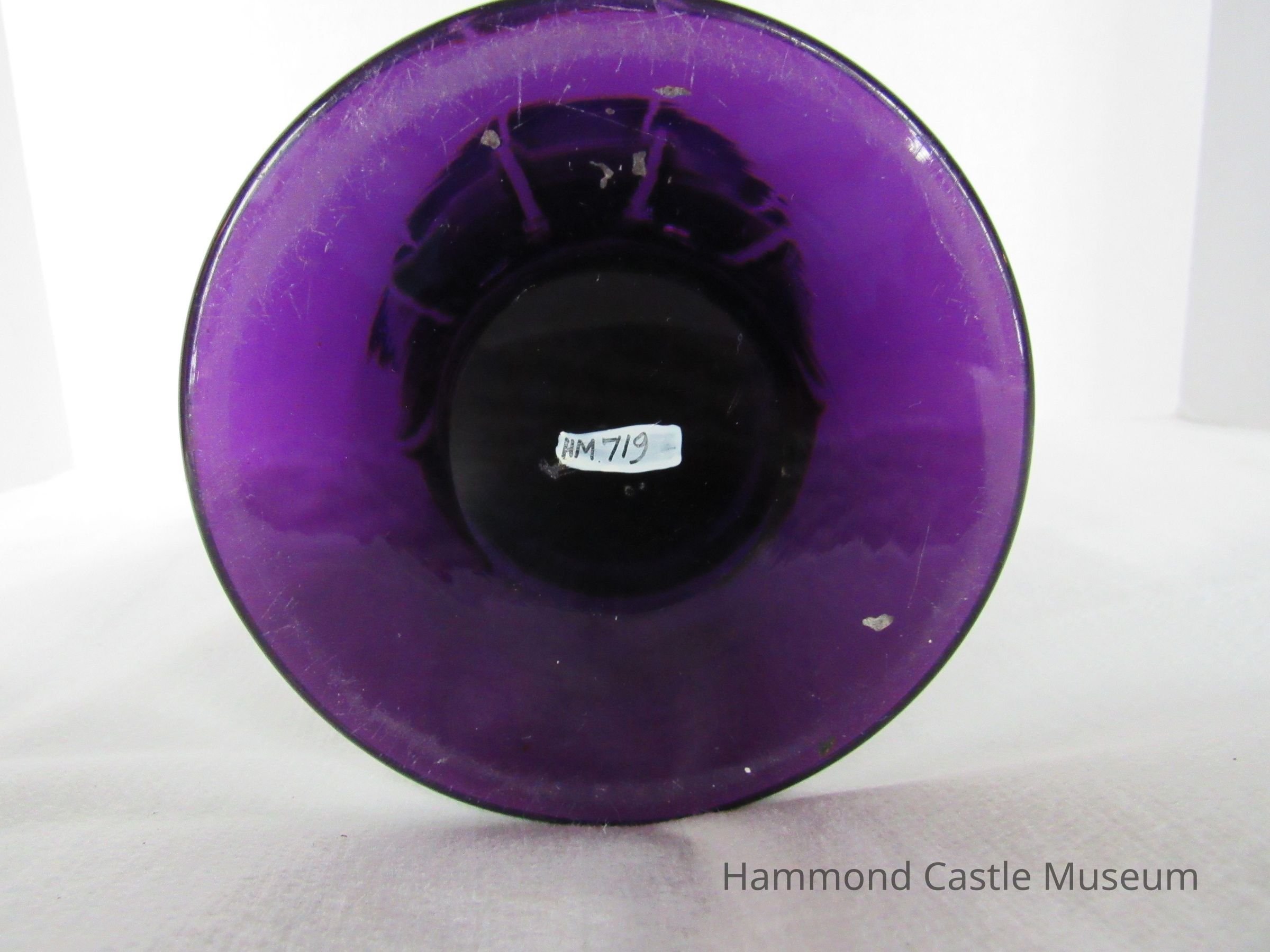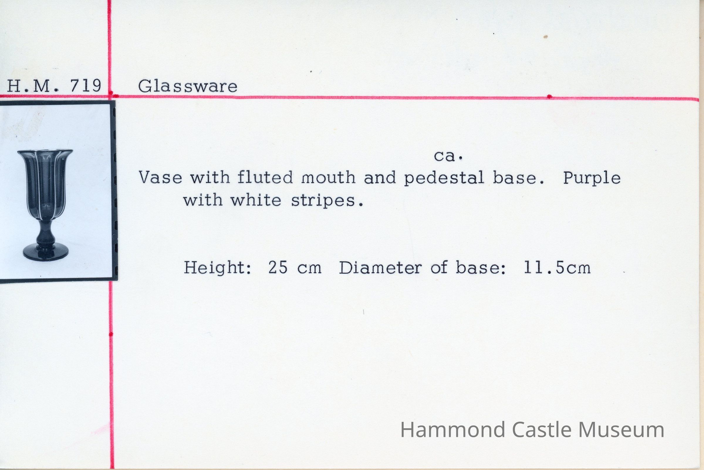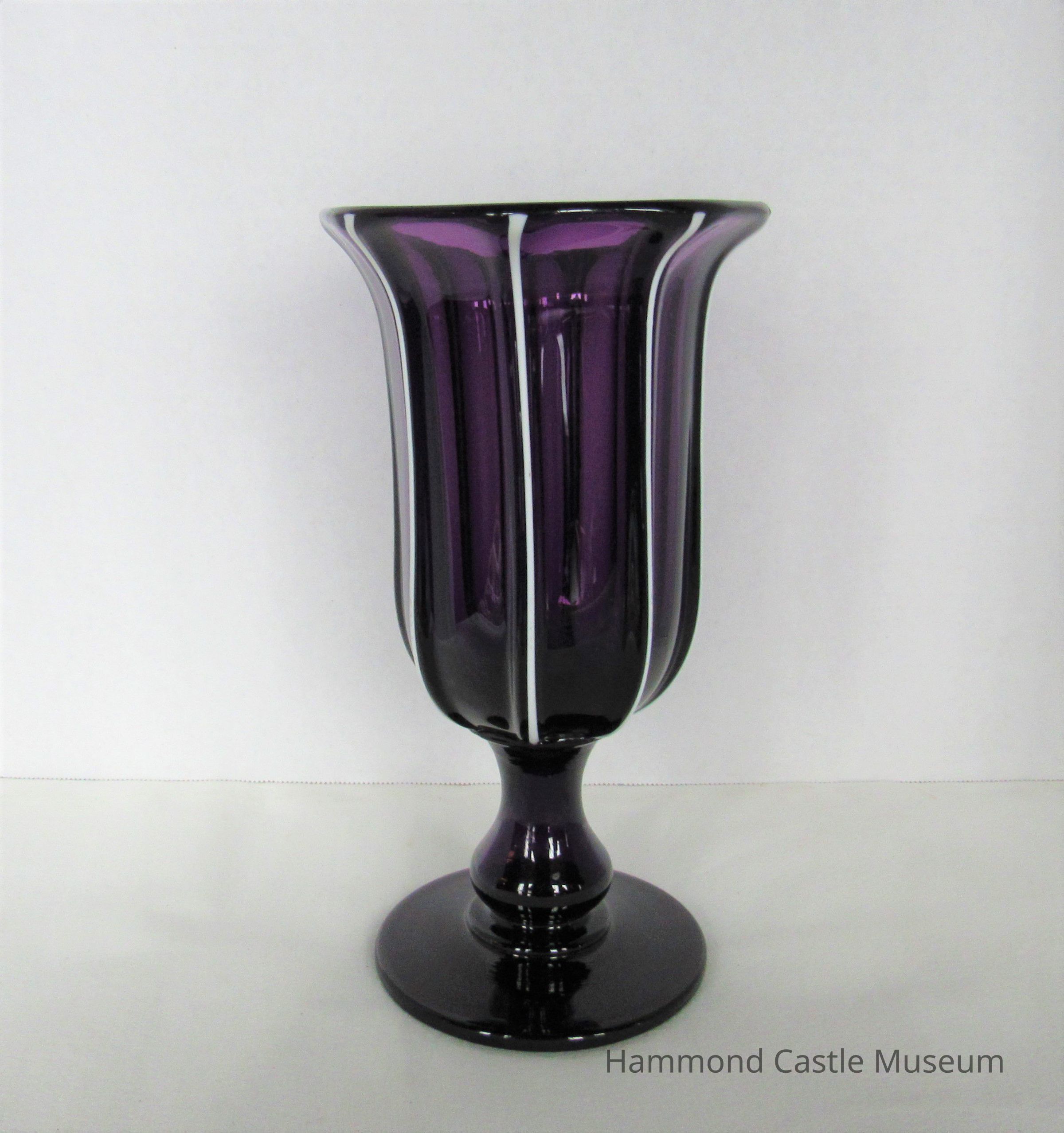 Vase with fluted mouth and pedestal base. Purple with white stripes.