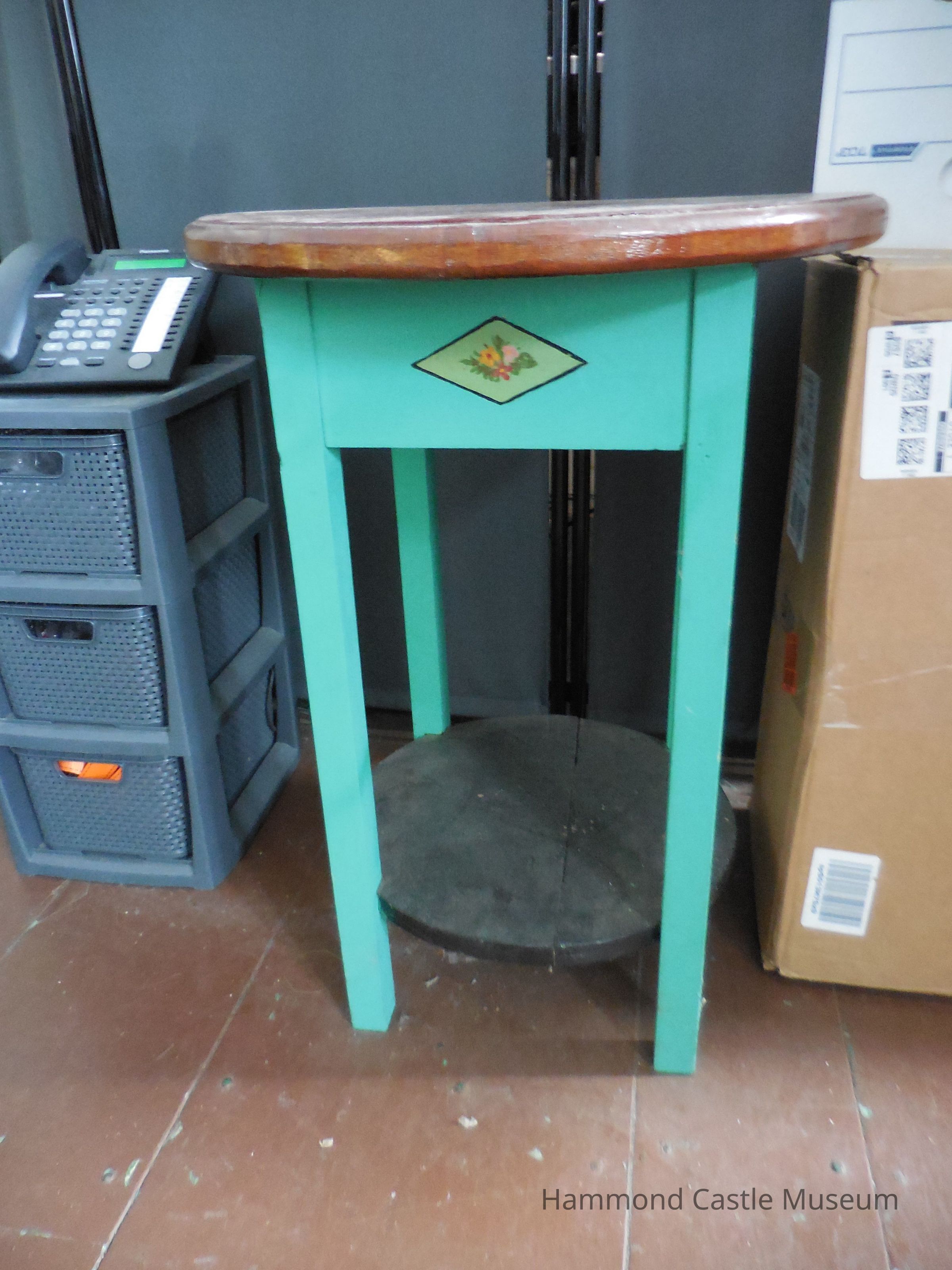 Pair of Green Lamp Tables Natural wood top and black bottom shelf Decorative details on green painted legs and underside Part of bedroom set