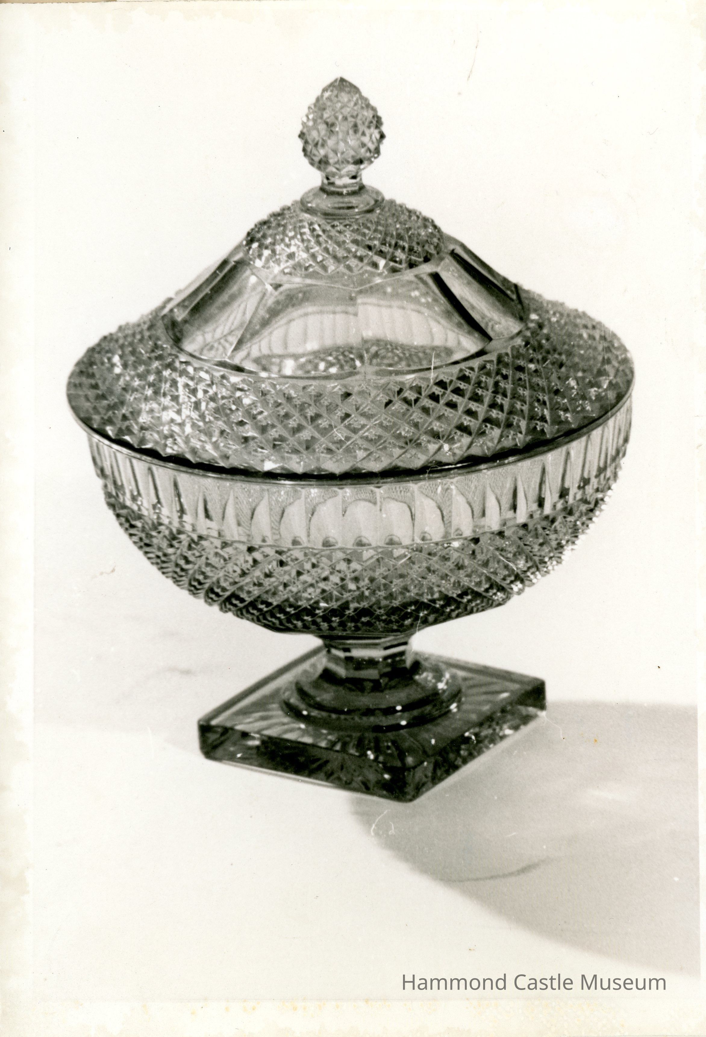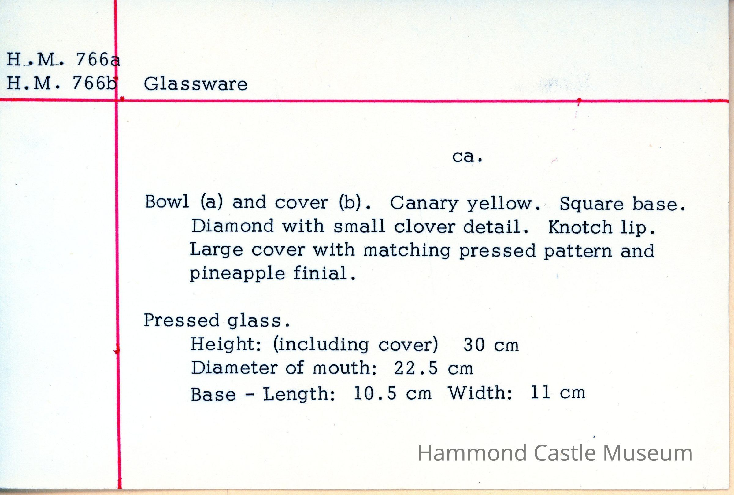 Canary yellow. Square base. Diamond with small clover detail. Notch lip. Large cover with matching pressed pattern and pineapple finial. Pressed glass.