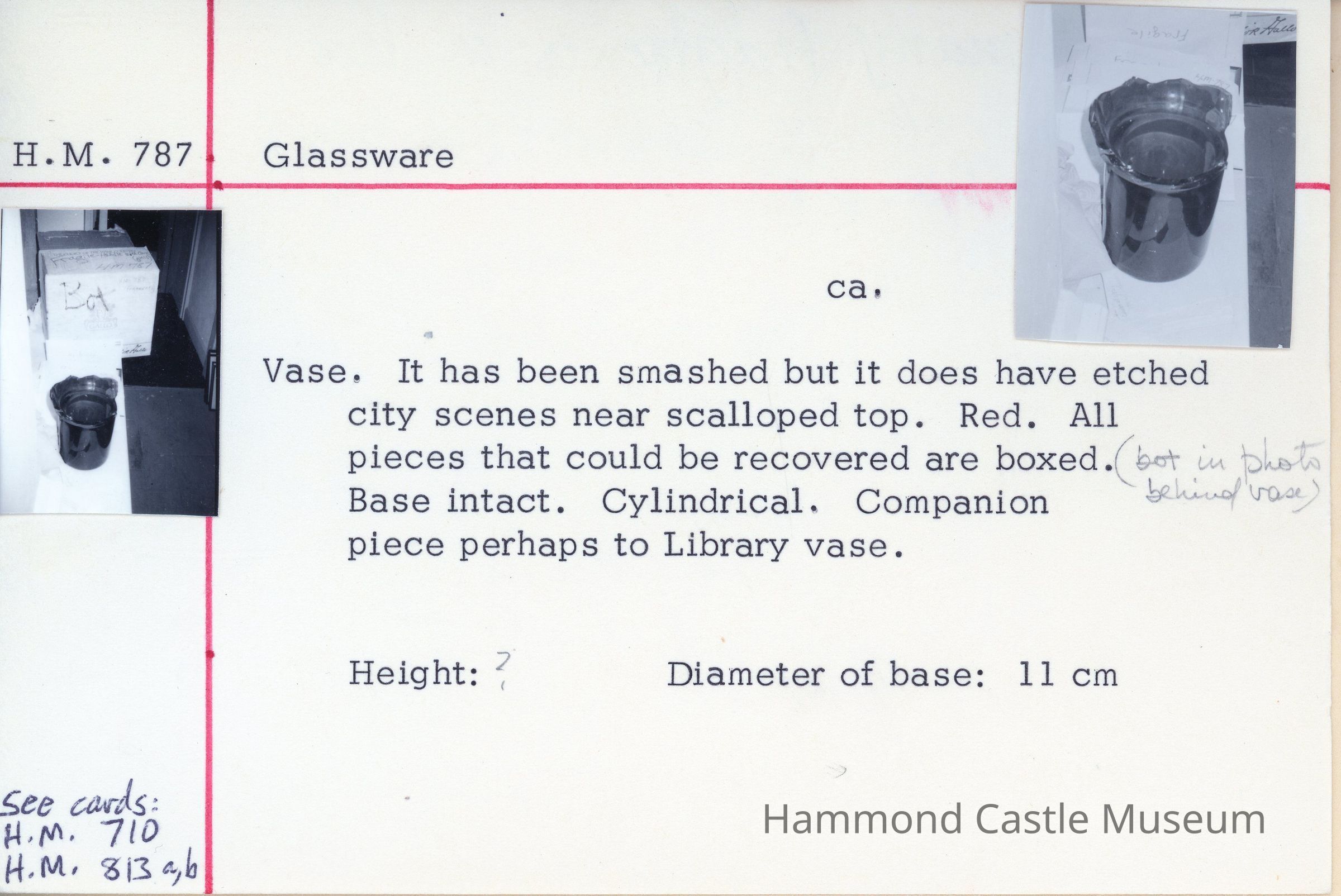 Vase. It has been smashed but it does have etched city scenes near scalloped top. Red. All pieces that could be recovered are boxed. Base intact. Cylindrical. Companion piece perhaps to Library vase. See H.M.710 and H.M.813ab.