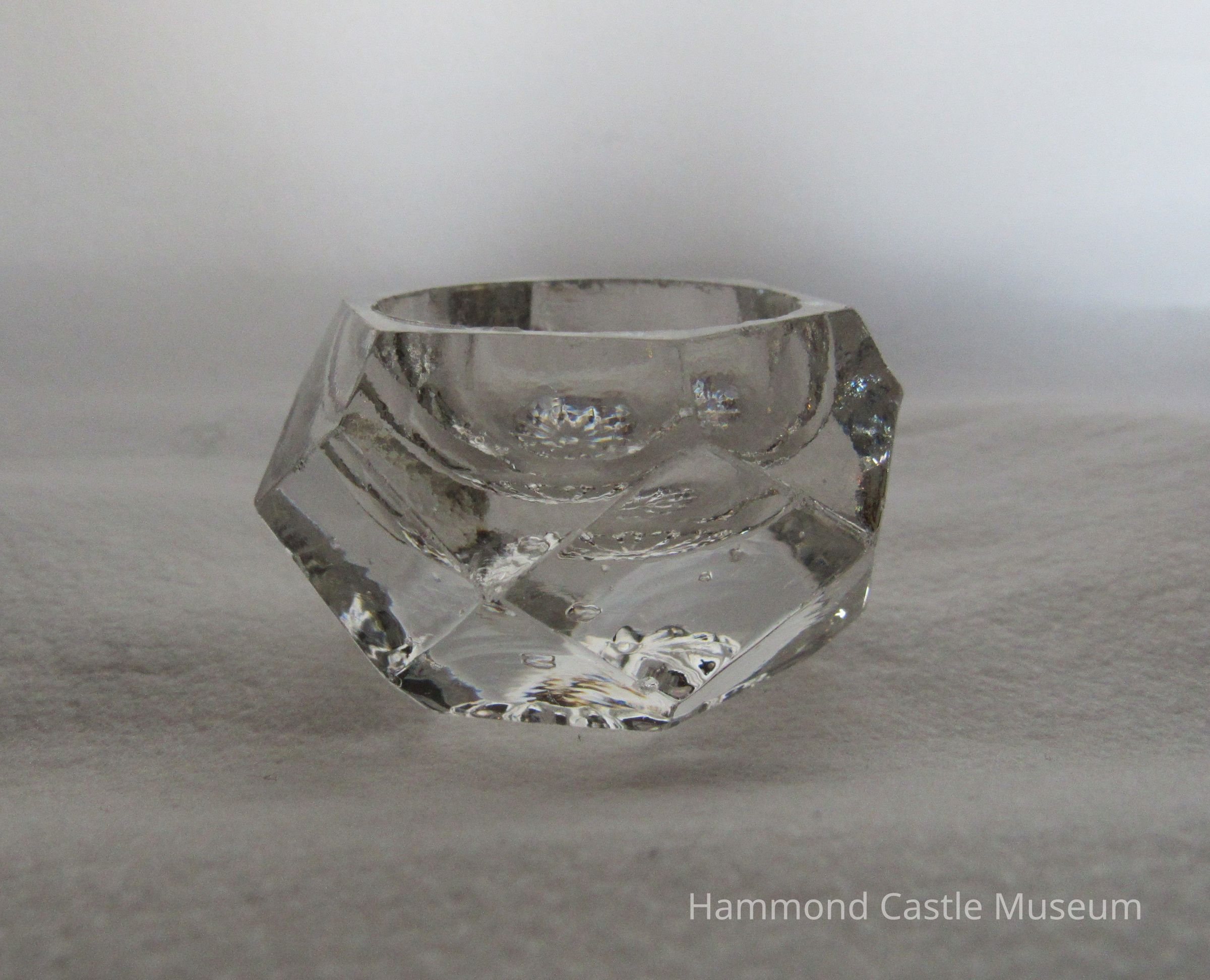 Part of mixed set of 12 salt containers. Various shapes, colors and designs. #7-12 Clear Glass Pressed clear glass; six-sided and many-faceted.