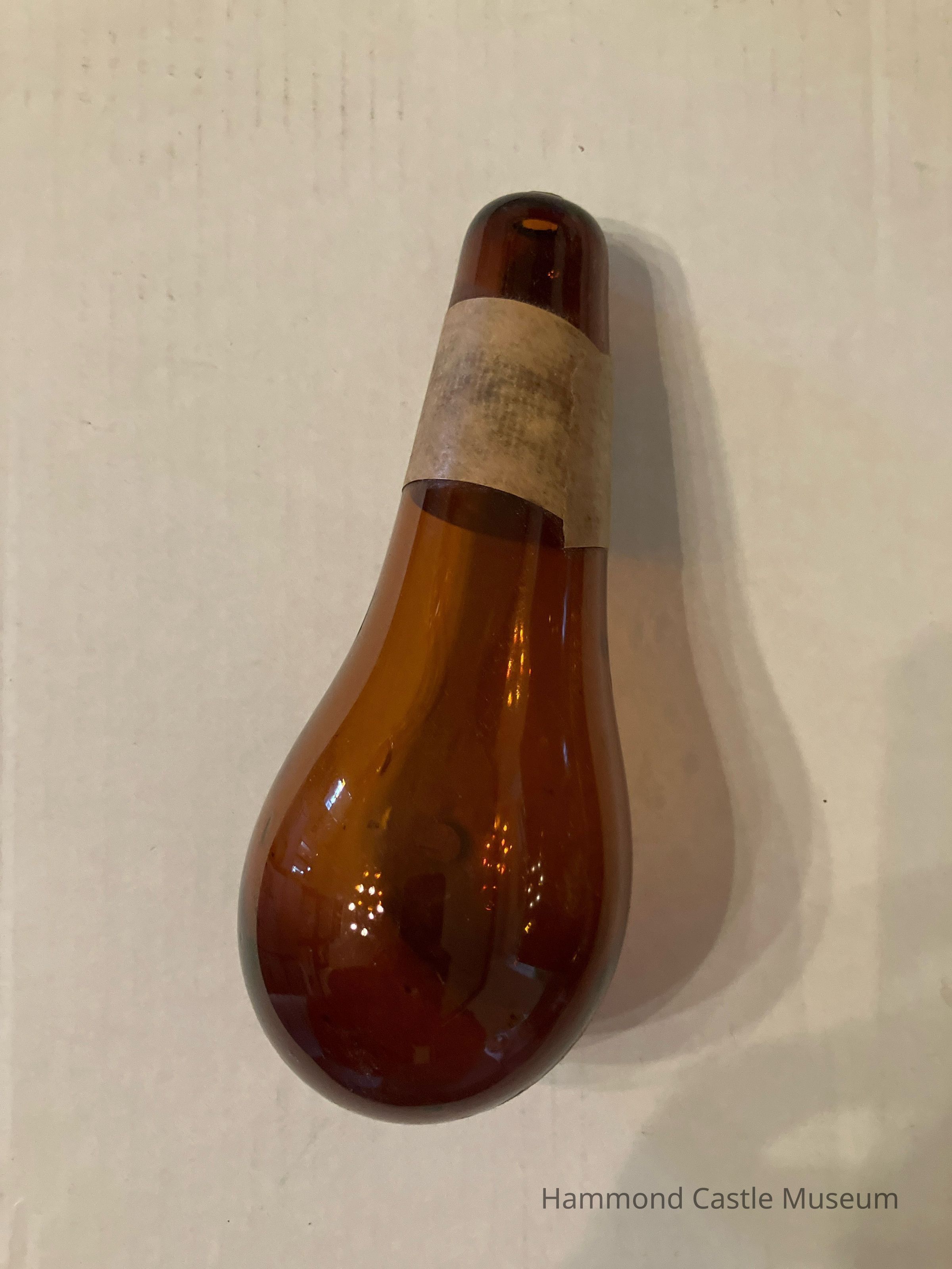 Pear-shaped glass bottle. Reddish brown. Lip broken.