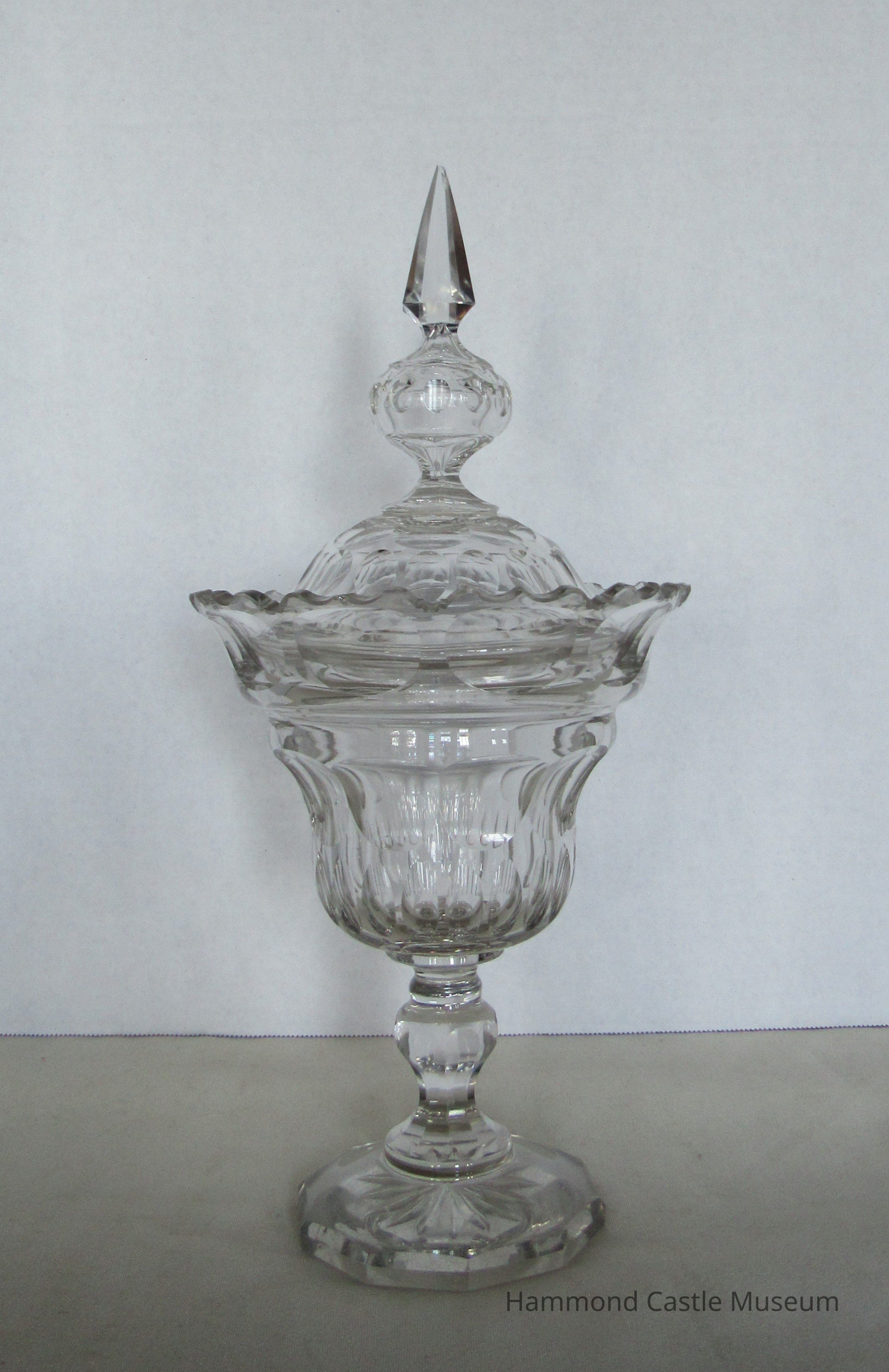 Set of 2 covered dishes. Bavarian Crystal; convoluted design. Wide mouth, pointed finial on cover.