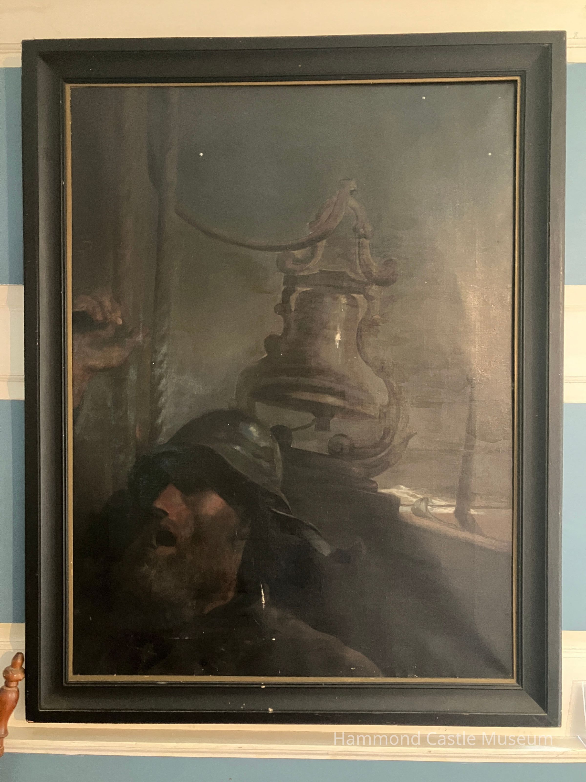 This oil on canvas painting shows an image of fisherman on deck with a bell.