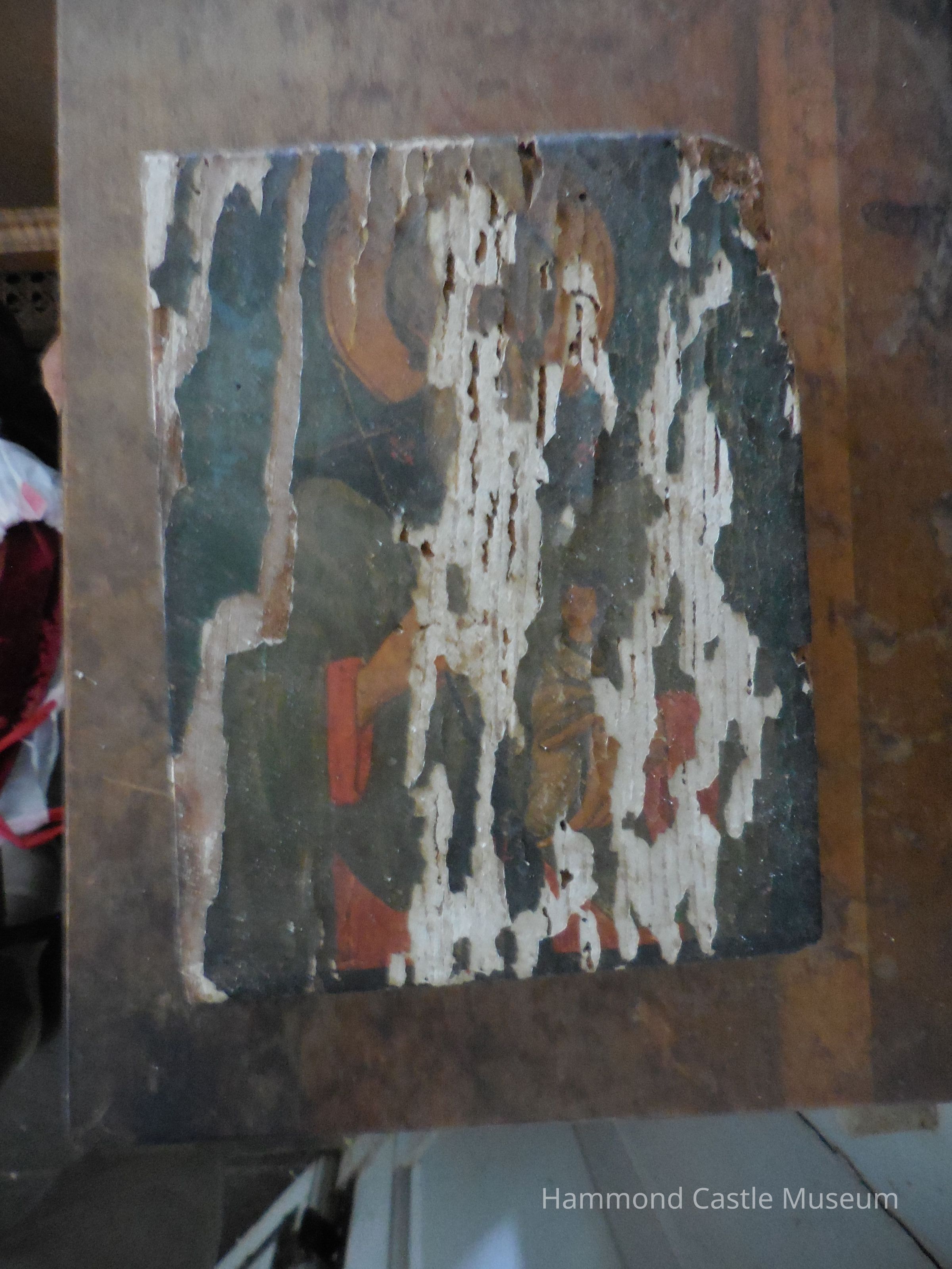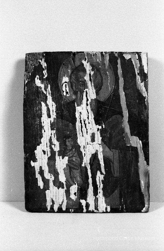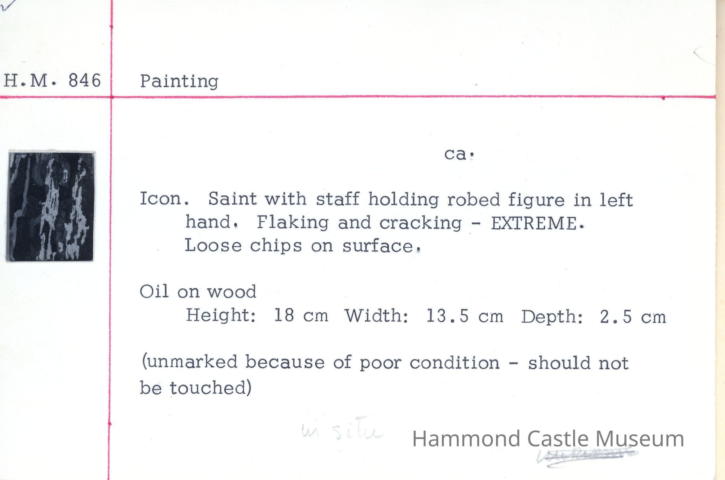 Painting on wood of Saint with staff holding robed figure in left hand.