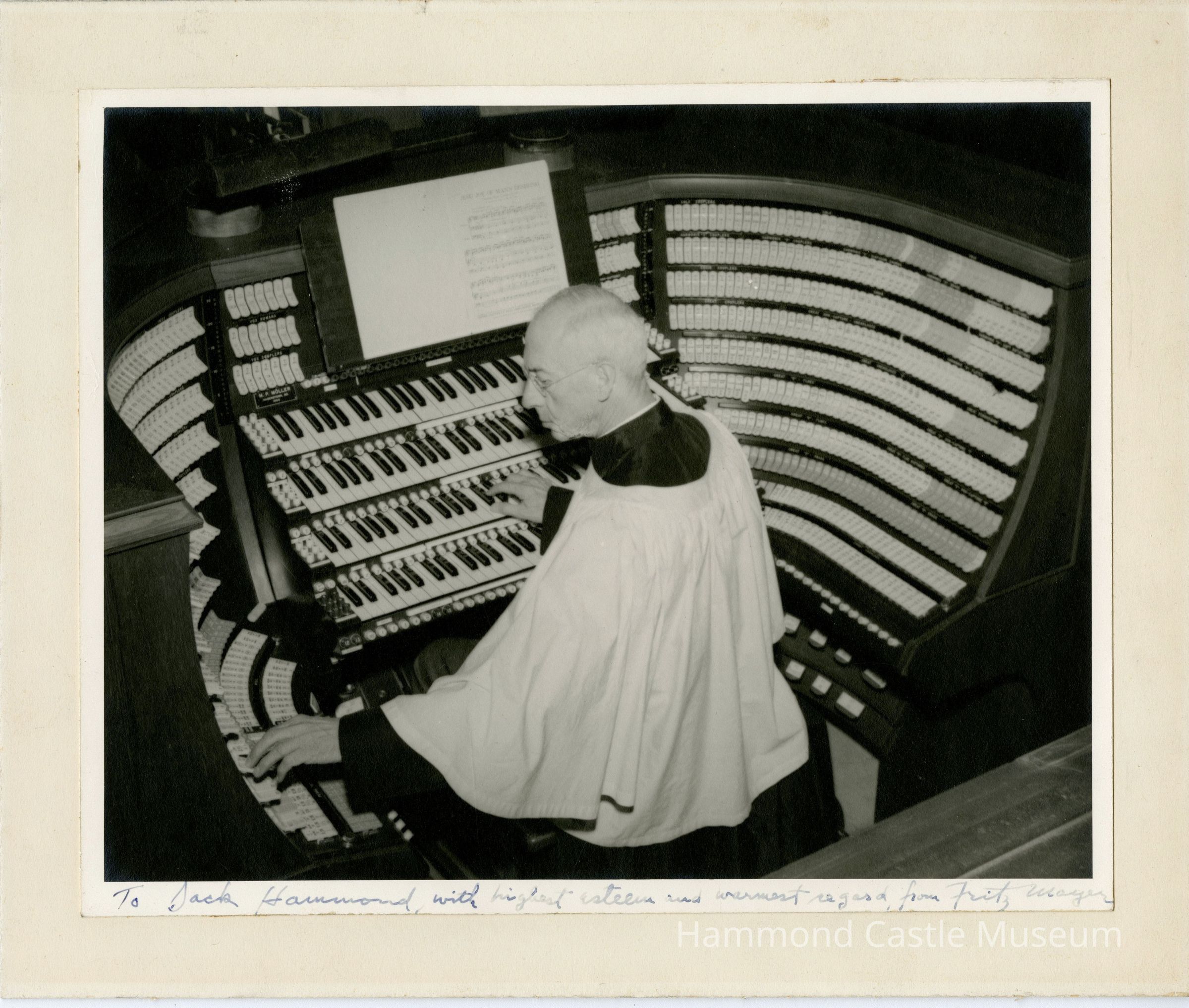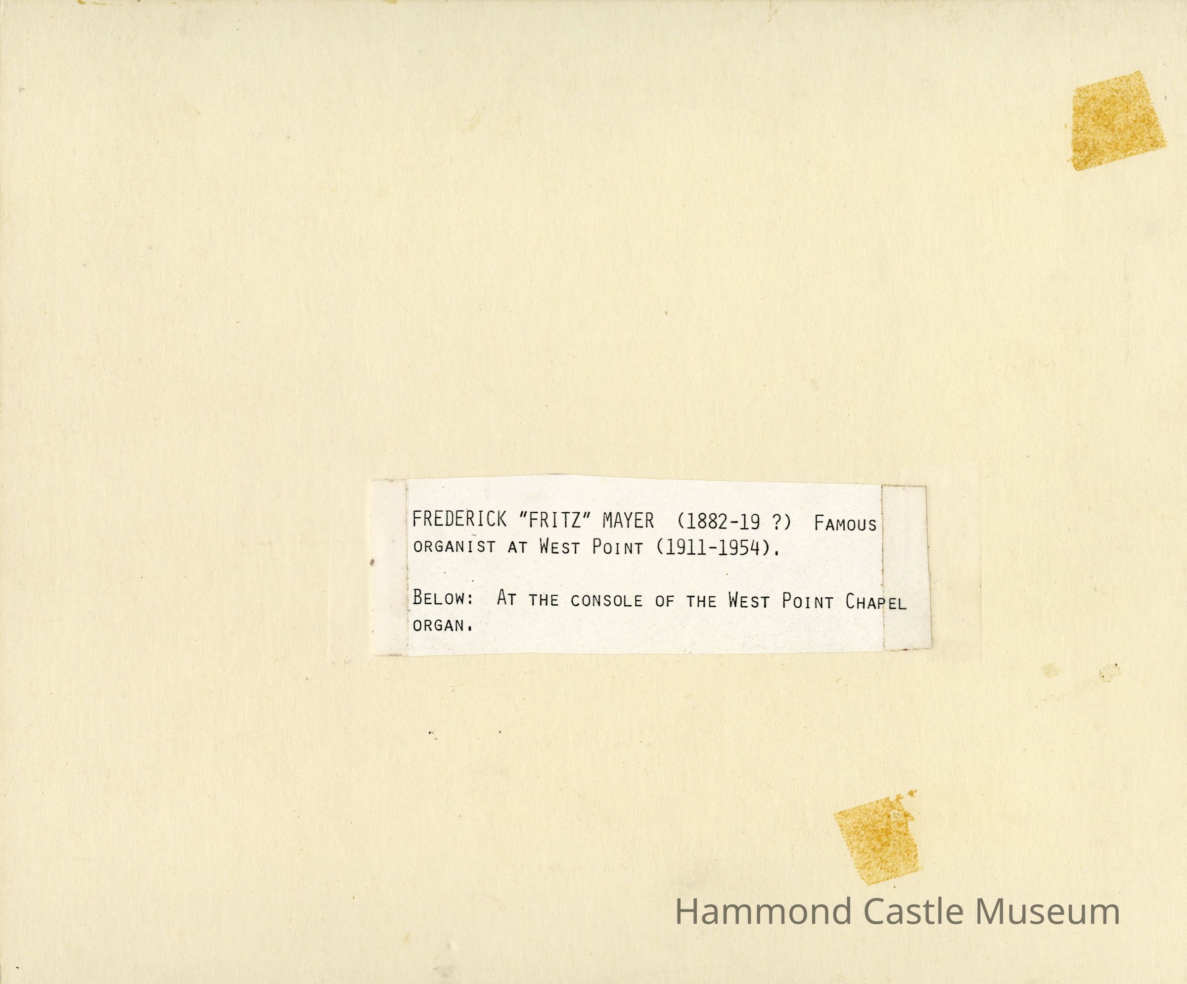 Photo & inscriptions of Frederick Mayer, West Point Chapel organ (Mayer was a friend of Hammond and fellow organ enthusiast)