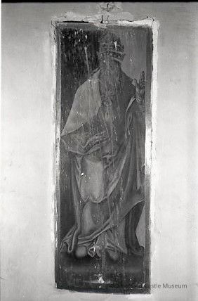 Crowned bearded figure with staff in left hand and wearing Pope crown. Yellowish green tones.