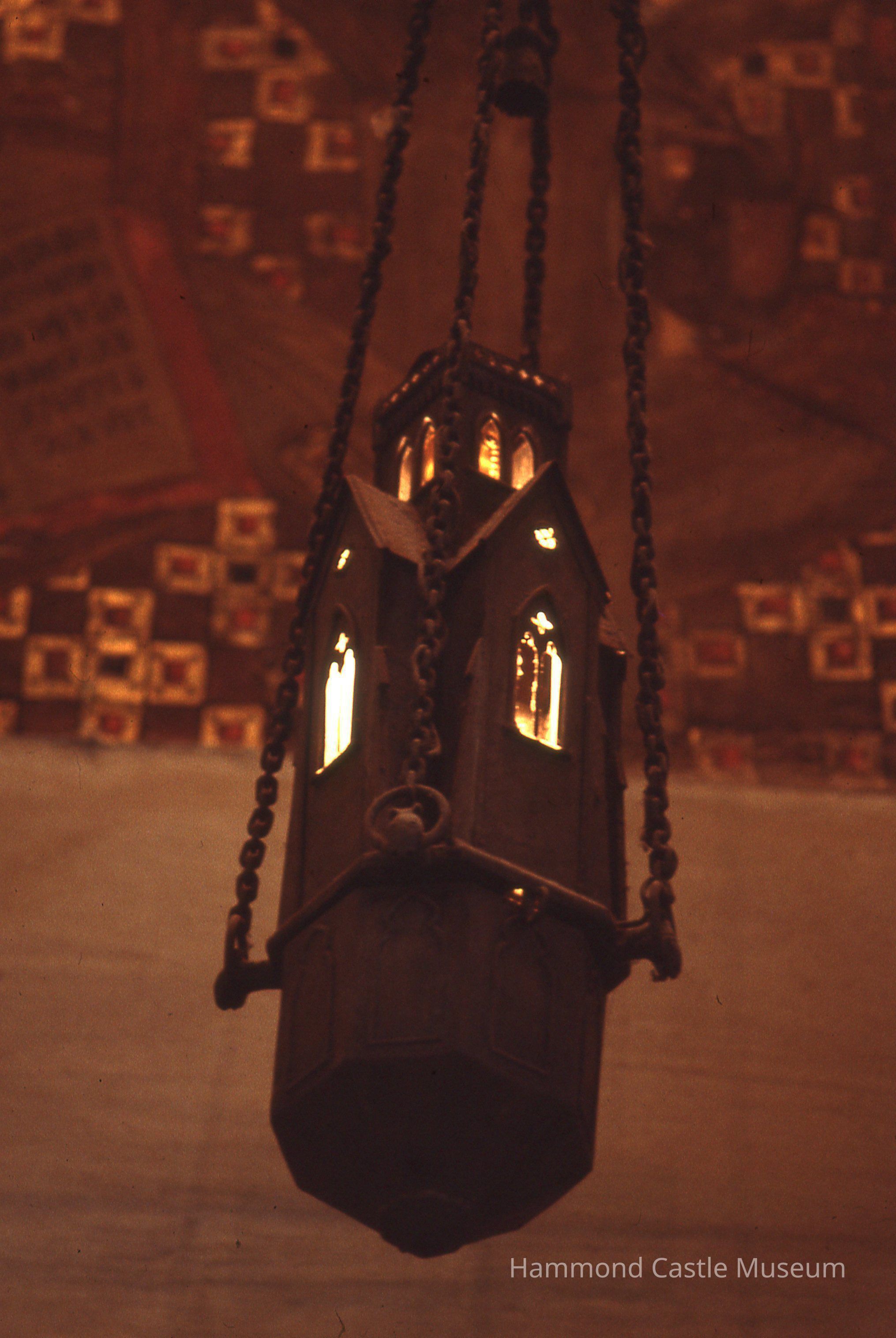 Great Hall hanging sanctuary lantern in form of miniature cathedral over stairs to courtyard Reportedly French, circa 1440 or Possibly designed by Hammond as mentioned in 1927-01-17 letter to Buswell (CAM collection)