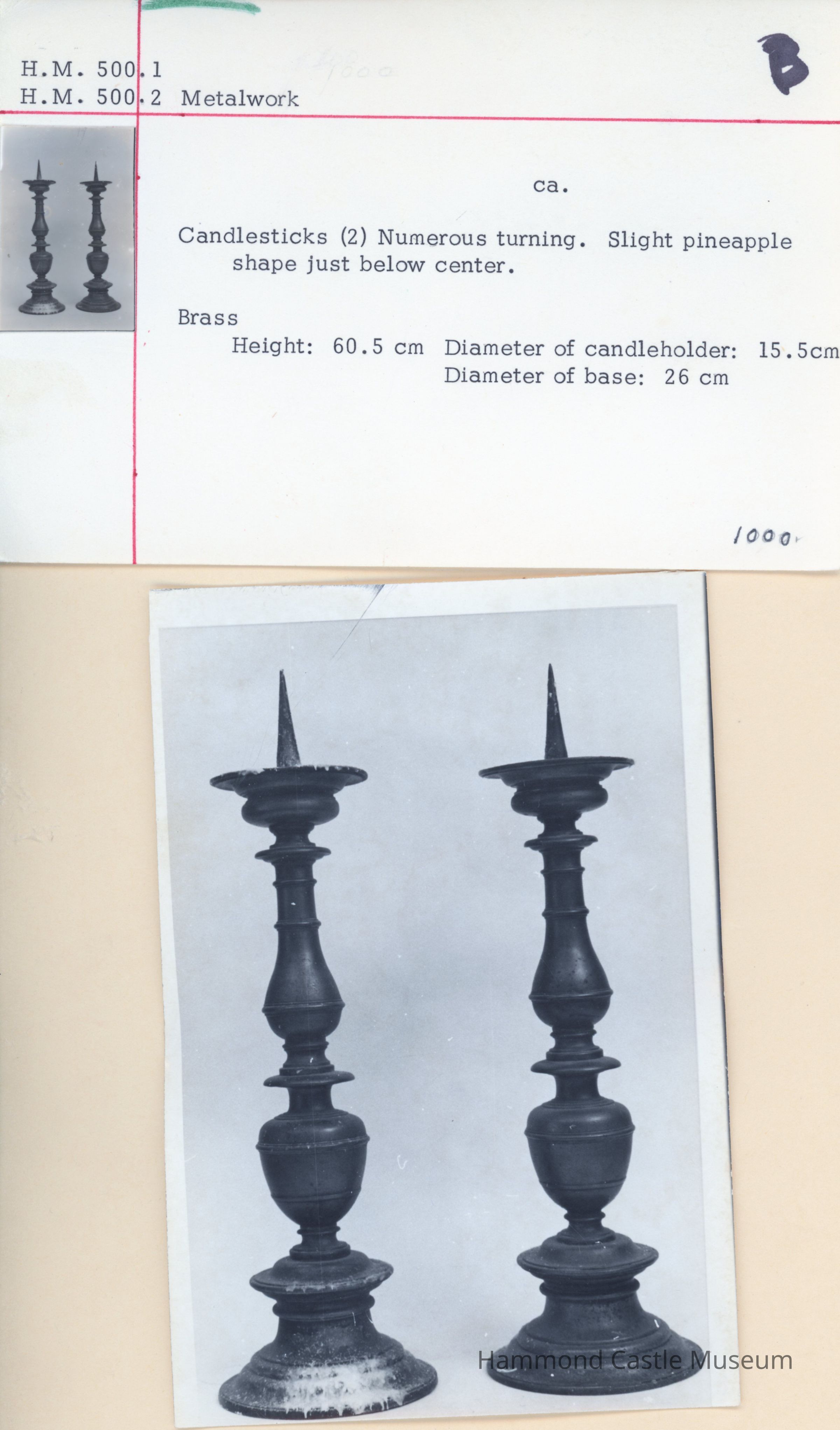 Set of 2 metal candlesticks with spike. Numerous turning. Slight pineapple shape just below center.