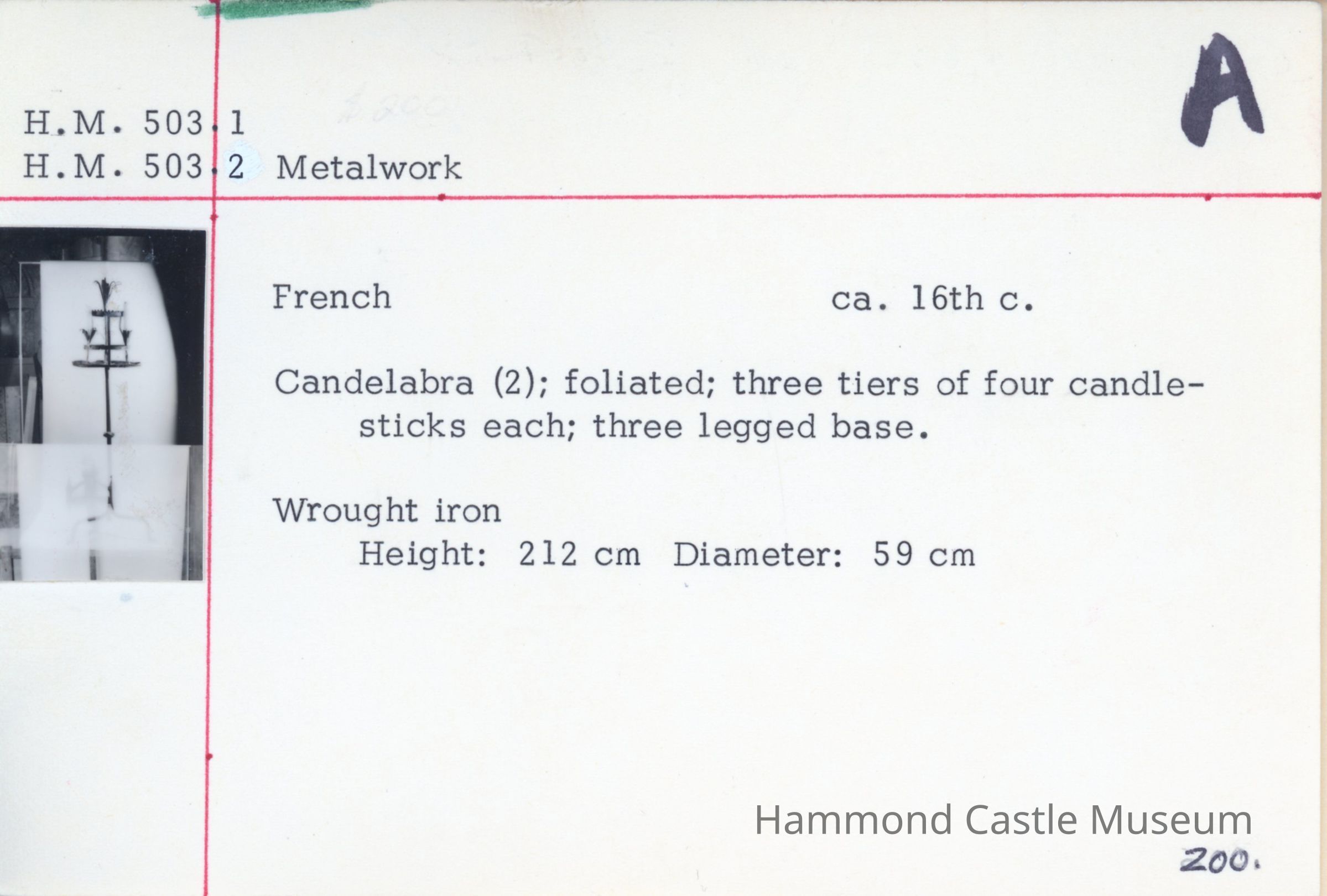 Set of 2 torchieres. Foliated, three tiers of four-candlesticks each; three-legged base. 16th c. French Reportedly from the Blumenthal Collection