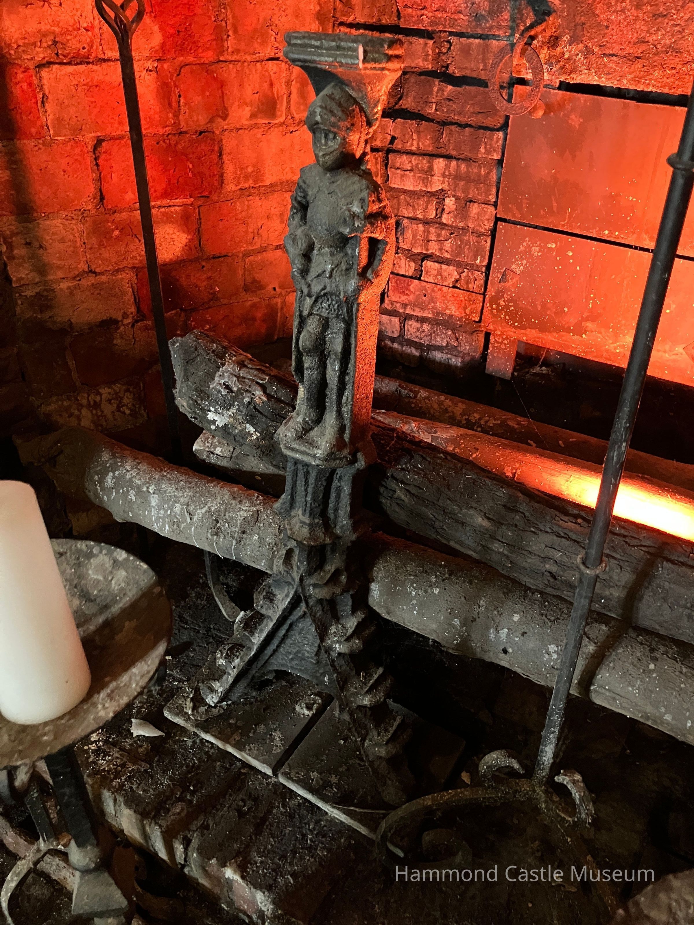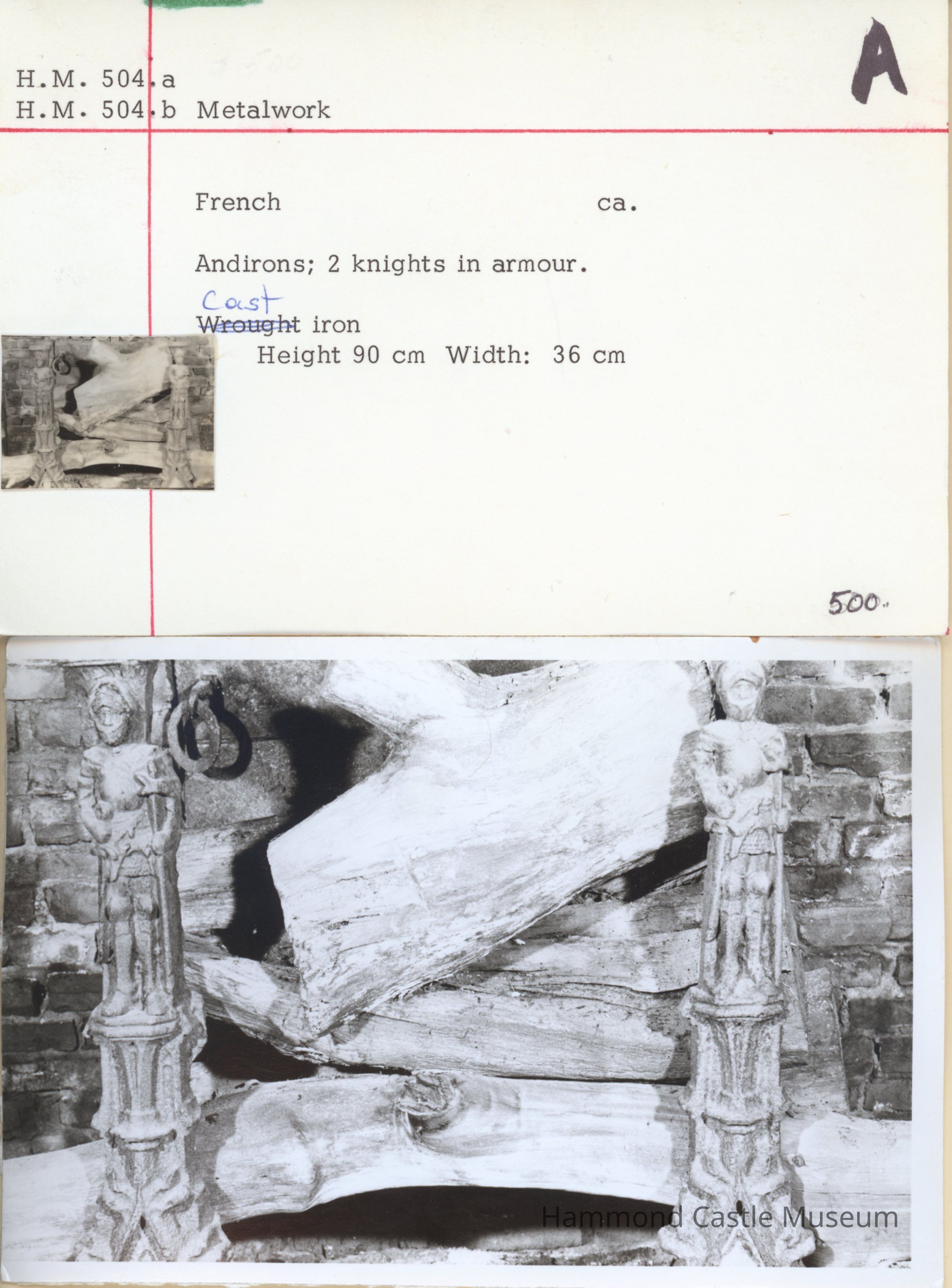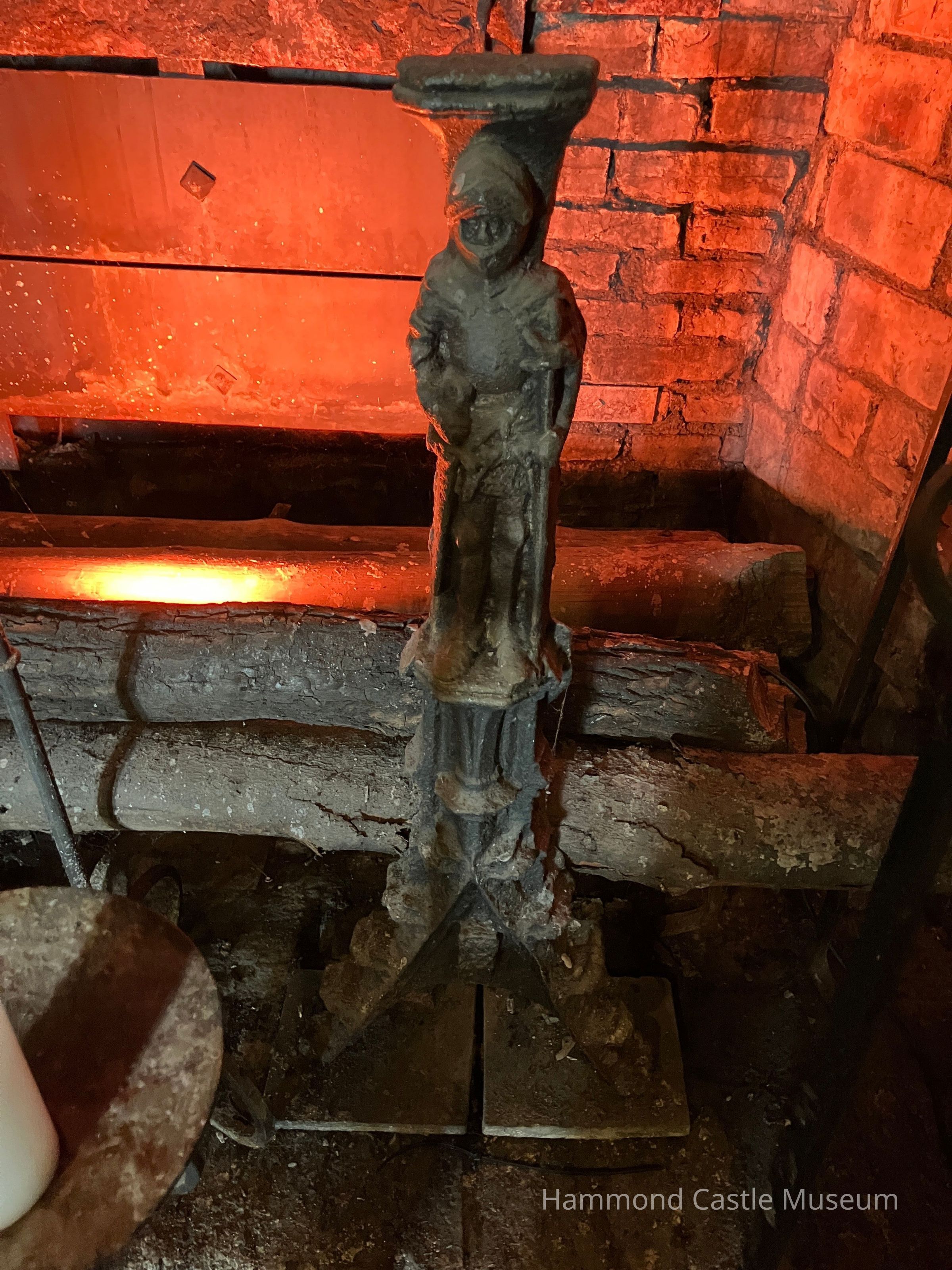 15th c. French Andirons of Knights in Great Hall fireplace Set of 2. Shaped like 2 knights in armor.